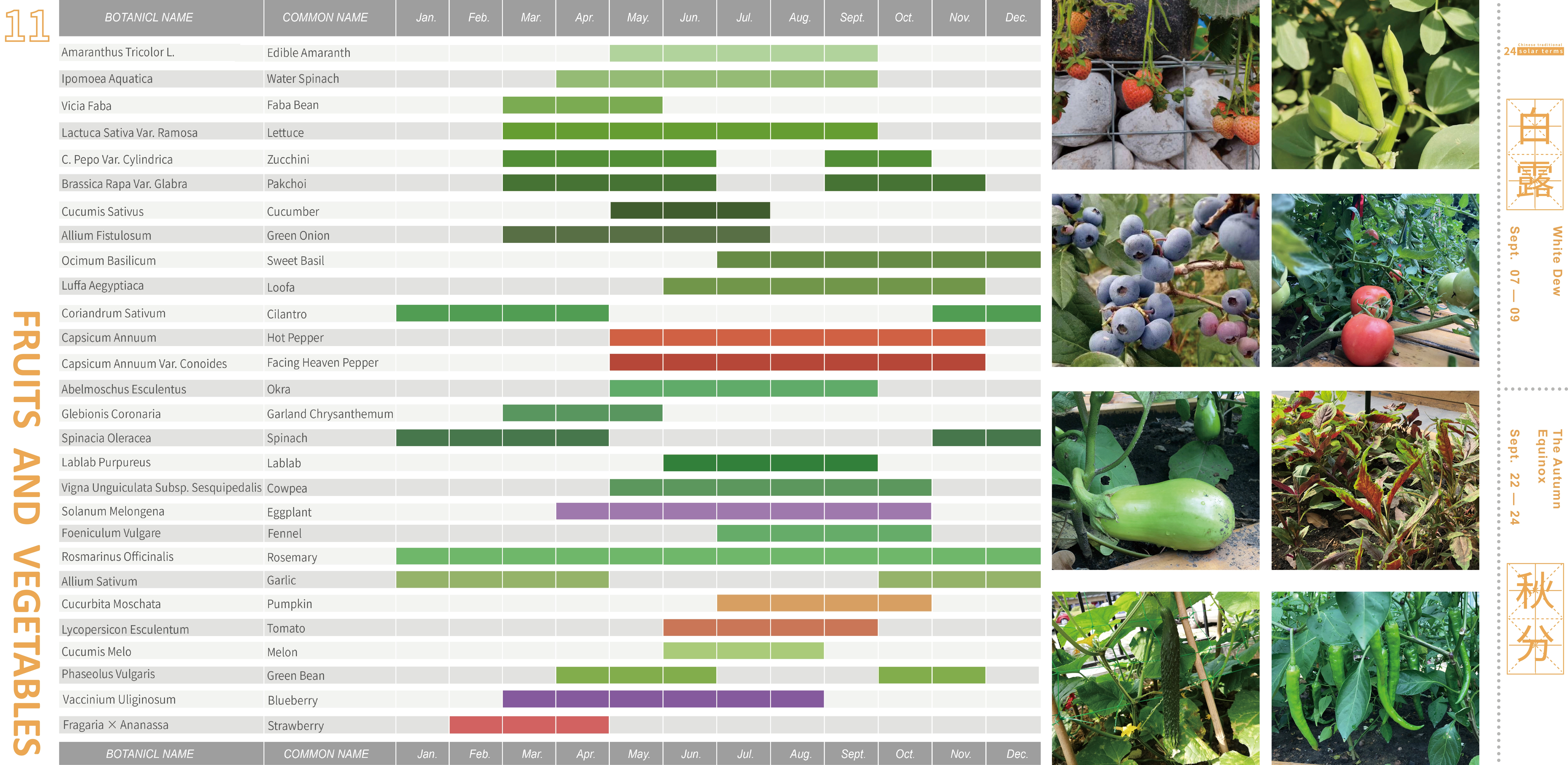 Nature Classroom: The nature classroom is a high planting bed surrounded by gabion benches, on the wooden panel of which the details of Chinese “Twenty-Four Solar Terms” were carved out. Those terms embody Chinese traditional knowledge and social practice developed through observation of the sun's annual motion, and served as a time-frame for agricultural activities. The bulletin board on the fences visually display information about succession planting, and knowledge of soil and insects.