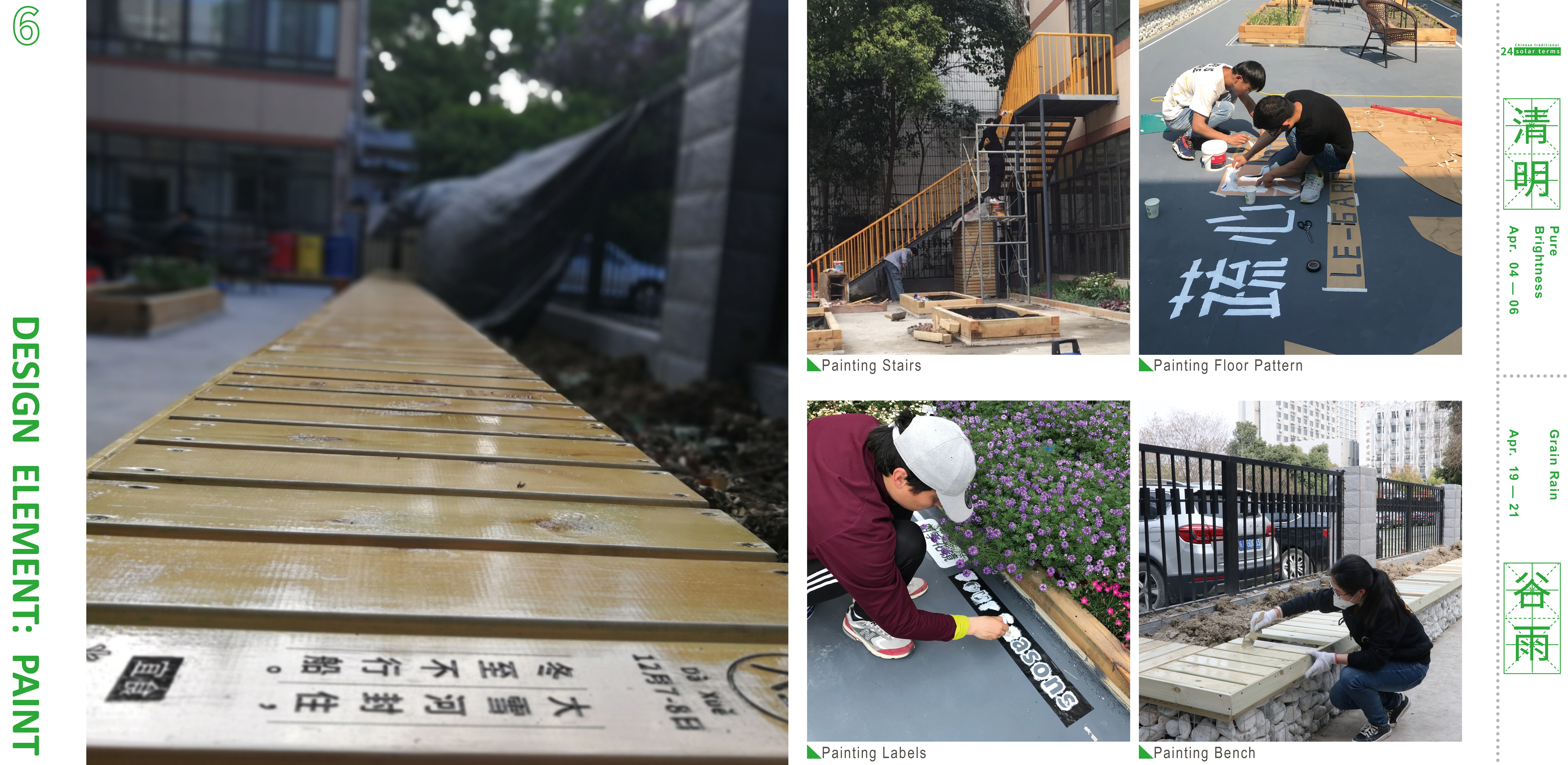 The project team consisted primarily of 15 college students from Environmental Design and Graphic Design majors. During the construction of the garden, it established close cooperation with community workers, staff from the nursing home and local residents. 12 students from the Environmental Design Department were in charge of the garden design and the building of planting beds, gabion, benches, and rainwater collector. Another 3 students from the Graphic Design Department were responsible for the walking surface and facade decoration. And one student from Environmental Design coordinated and managed the project, from the design to the building.