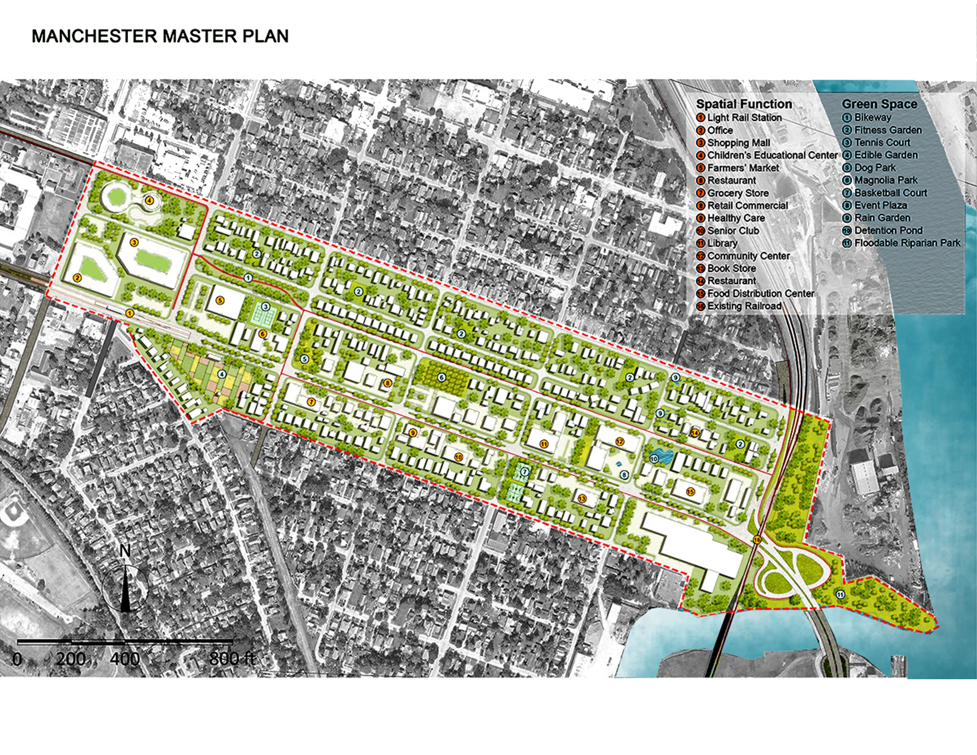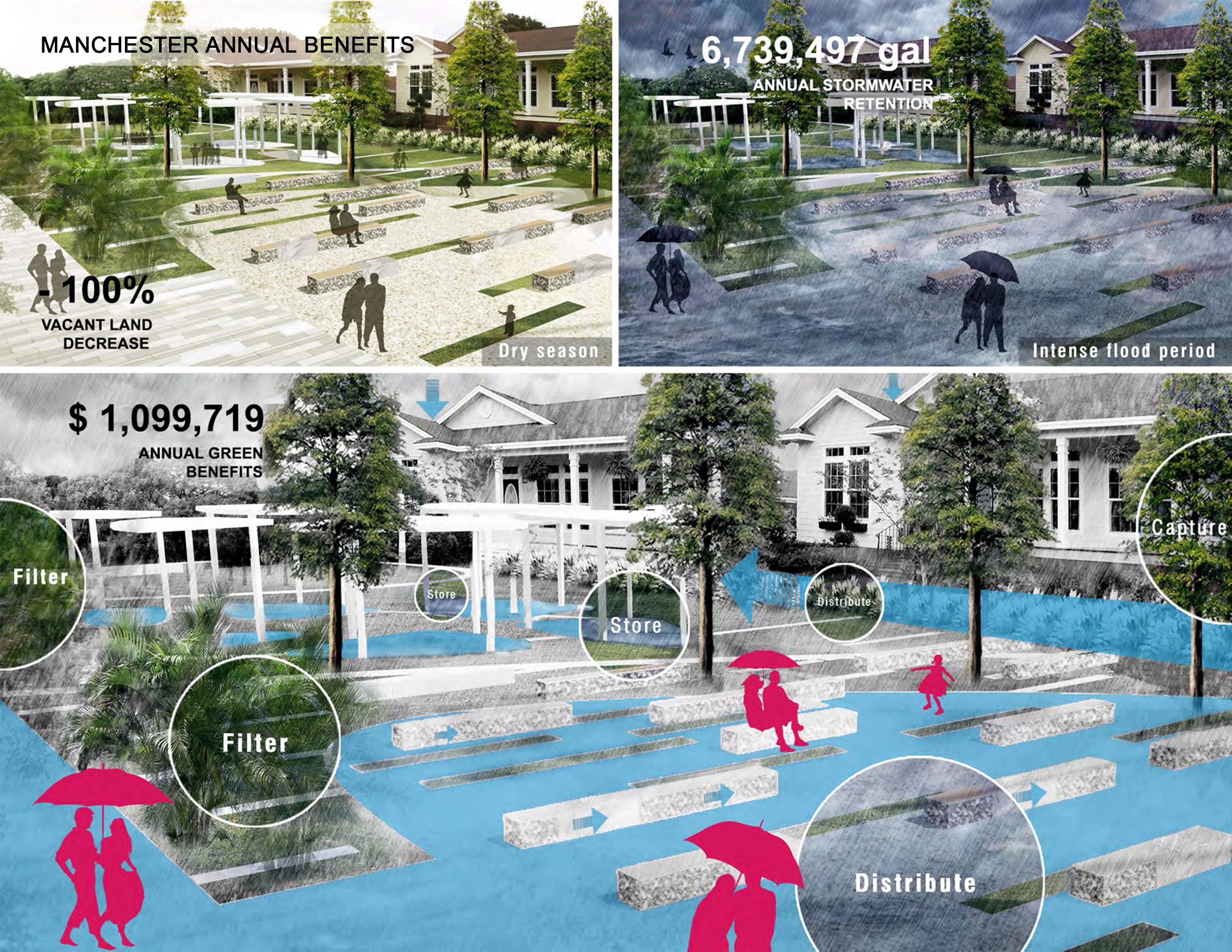 Manchester is surrounded by industries, and has one of the highest river impairments and lowest water qualities in the state. Local authorities provide sightseeing ventures named ‘Toxic Tours’ for visitors to raise awareness of the serious conditions in the neighborhood (Newman et al., 2016). Manchester has a large number of undocumented Hispanic immigrants and 1/3 of the residents live below poverty line (U.S. Census, 2010). The site is composed of 16% vacant parcels/abandoned structures; 68% of the neighborhood’s surface is currently impervious. After the plan is implemented, a majority of the existing underutilized parcels project to be regenerated. The amount of green space increases to nearly 7 times its current amount while the percentage of pervious surface increases from 36% to 51%. According to the GVC, over 40 million gallons of stormwater can be retained annually, with over $5,000,000.00 of annual green benefits generated from the GI.