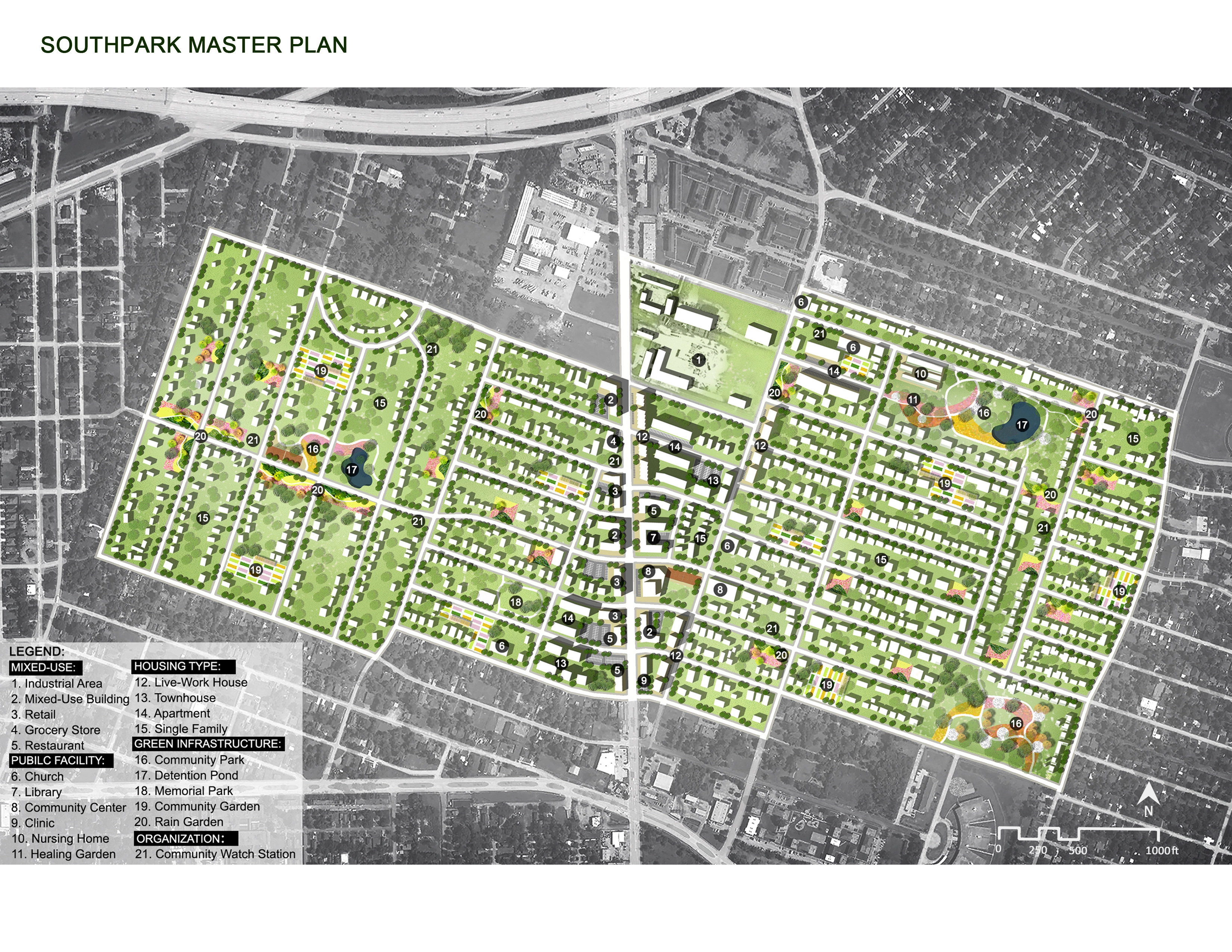 Sunnyside is Houston’s oldest African-American neighborhood. It has one of the most socially vulnerable populations in the region and is currently 93% minority with many residents making less than $25,000 annually (U.S. Census, 2010). Due to ineffective engineered infrastructure, Sunnyside is severely impacted by large rainfall events. Fifty percent of the design site is within the 100-year floodplain. In order to avoid flooding, new construction in the site is built at a higher elevation, leading to increased flooding for existing housing. The GVC calculations show that overall, the ability of the proposed plan to capture runoff volume increased from 49.6% to 190.7%. One-hundred and forty-three acres of vacant space was regenerated, four times more walkable space was created, and dense canopy coverage increased from 23.9% to 39.8%.