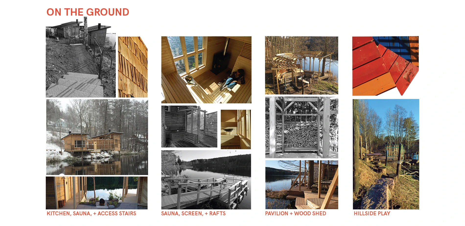 An initial master plan explored how multicultural activities, social gathering, and intergenerational play could accommodate and nurture the future and evolving contexts within Dals Långed. An important consideration was how the site could be reactivated while preserving and enhancing sensitive ecological assets. Following the required setbacks, the structures were built on post/pier footings to minimize excavation, water access was achieved using floating rafts, and denuded areas were revegetated.