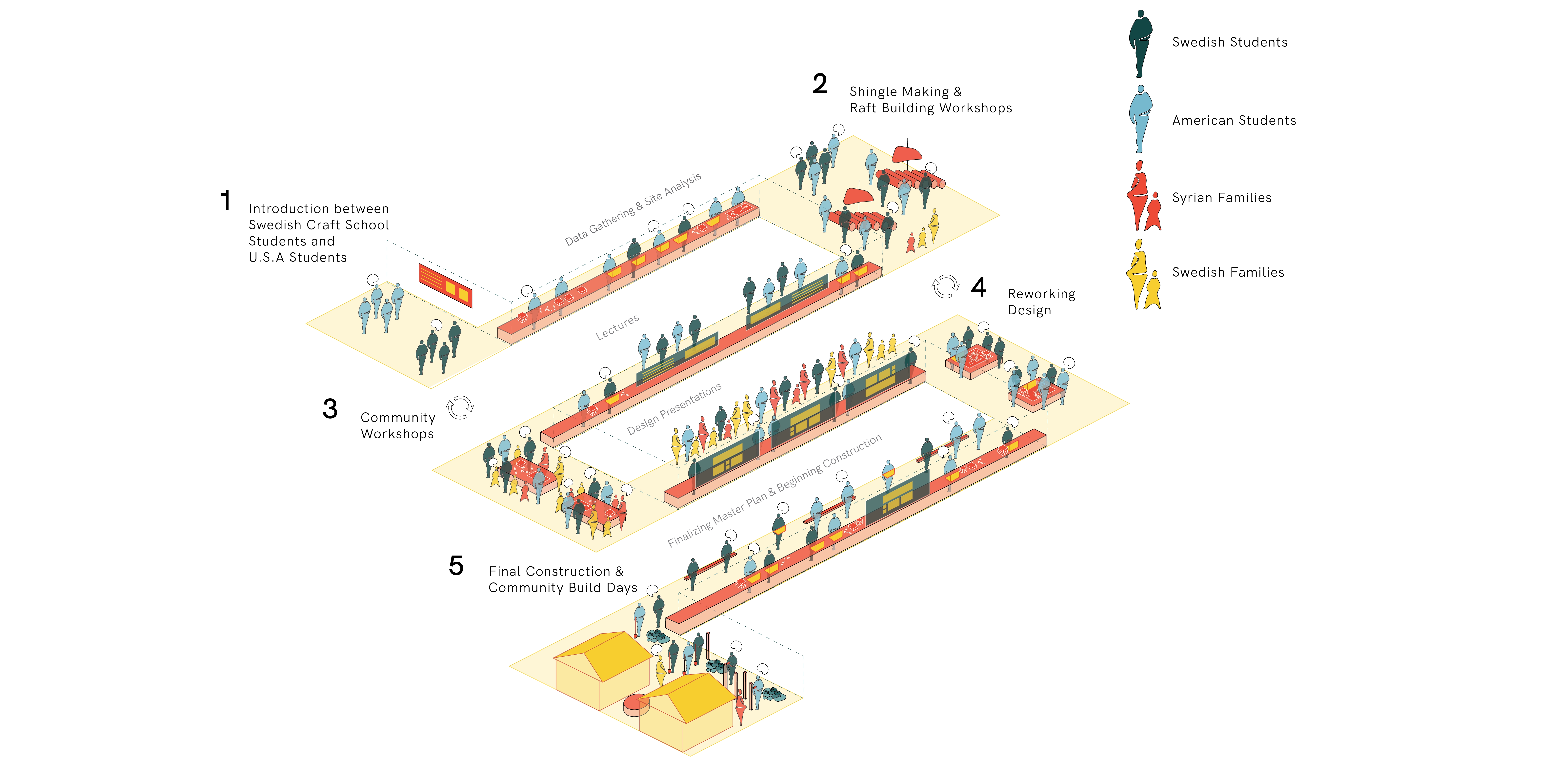 In the rural Swedish town of Dals Långed, an international and interdisciplinary group of students from universities in the U.S. and a local craft school collaborated with Syrian newcomers, established local residents, and children to reimagine an underused central public park along the Dalsland Canal. Together, they designed and built a space to cultivate new and diverse social networks amidst ongoing social migration and dislocation.