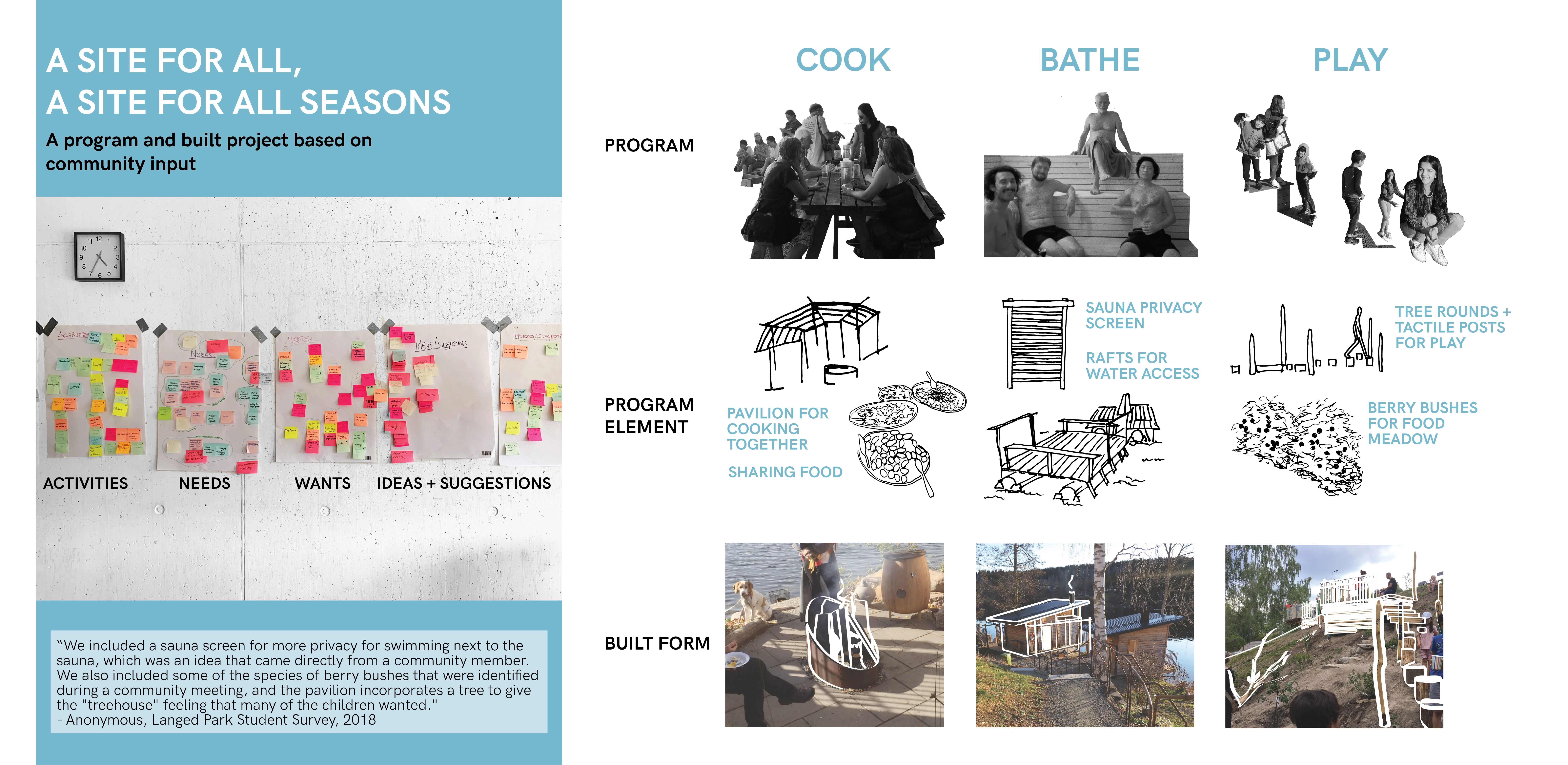 The two-year project included iterative design in tandem with community feedback sessions. In full, the project introduced play, gathering, contemplation, outdoor cooking, and a sauna to the waterfront. Following phase one, many Syrian residents found the park beautiful, but felt it was not for them. The children’s playscape was integrated into the second phase of the project because children can motivate cultural exchange. This demonstrates the importance of a phased design approach: it allowed for the community to shape the place as they began to use it. Långed Park is a working example of public space informed and produced by the people it serves. -