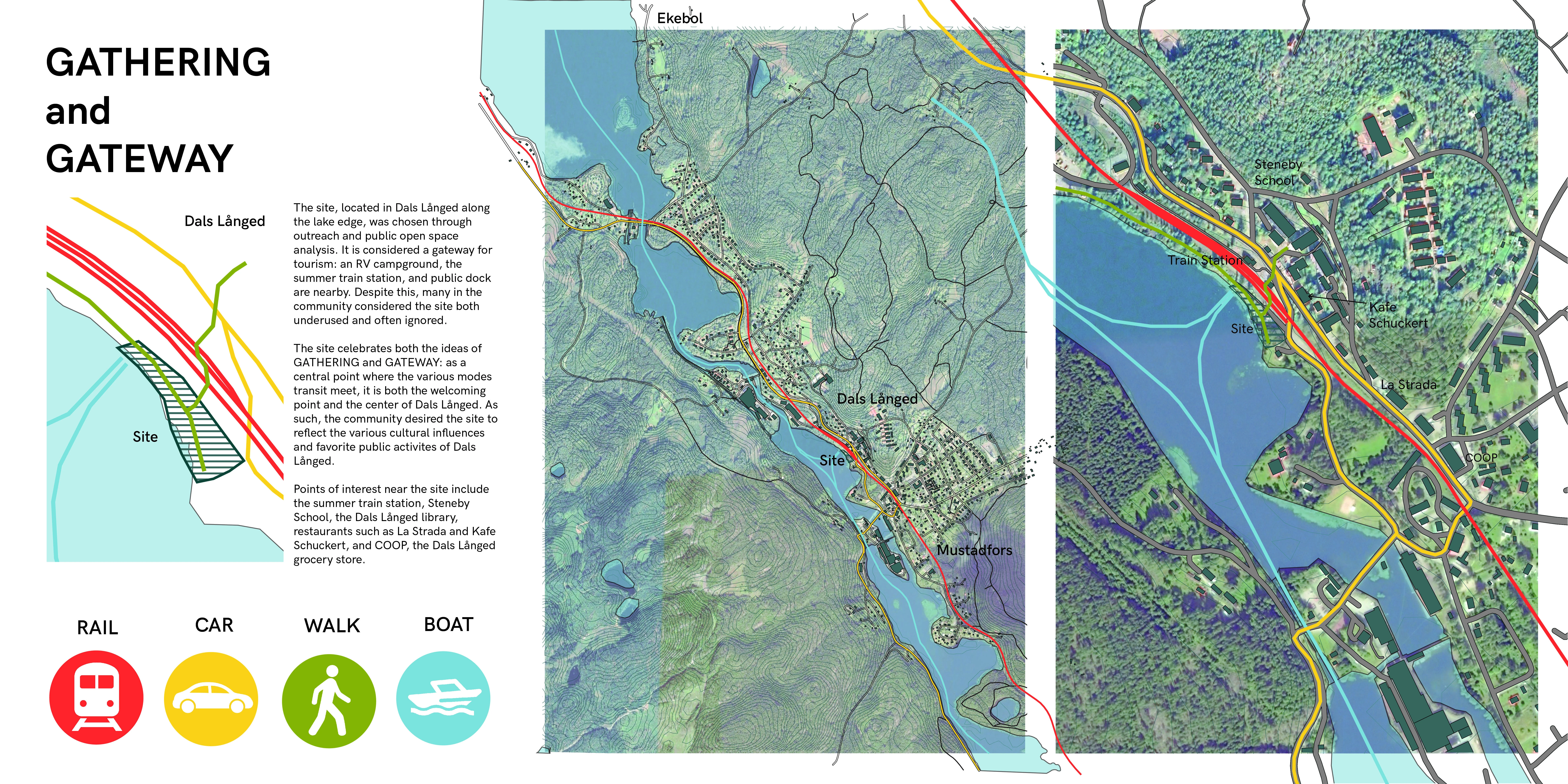 Interviews with Syrian newcomers and established local residents, focus groups with elementary school students on the site, vernacular craft demonstrations with local artisans, research presentations at a local craft school, formal county-wide community meetings, and an open drop-in studio format informed this two-year working relationship that builds upon the diverse stories of Dals Långed to reimagine the town’s centrally located ”village green”. The site, chosen through a preliminary community outreach process and public open space analysis, sits between the Dalsland Canal and the historic rail station. Prior to the intervention, its notable and ecological features included established quaking aspen and birch, hillsides of wild flowers, a habitat-rich wetland edge planting, and spectacular views of the canal and lake. These were carefully preserved and incorporated into the site master plan and constructed interventions. It was and remains a gateway conduit for tourism in Dals Langed. The public dock connects recreational boaters visiting the region to the town, and an RV campground offers accommodation to regional visitors. Prior to our involvement, everyday activities were infrequent and the site was considered underused and often ignored by many in the community.
