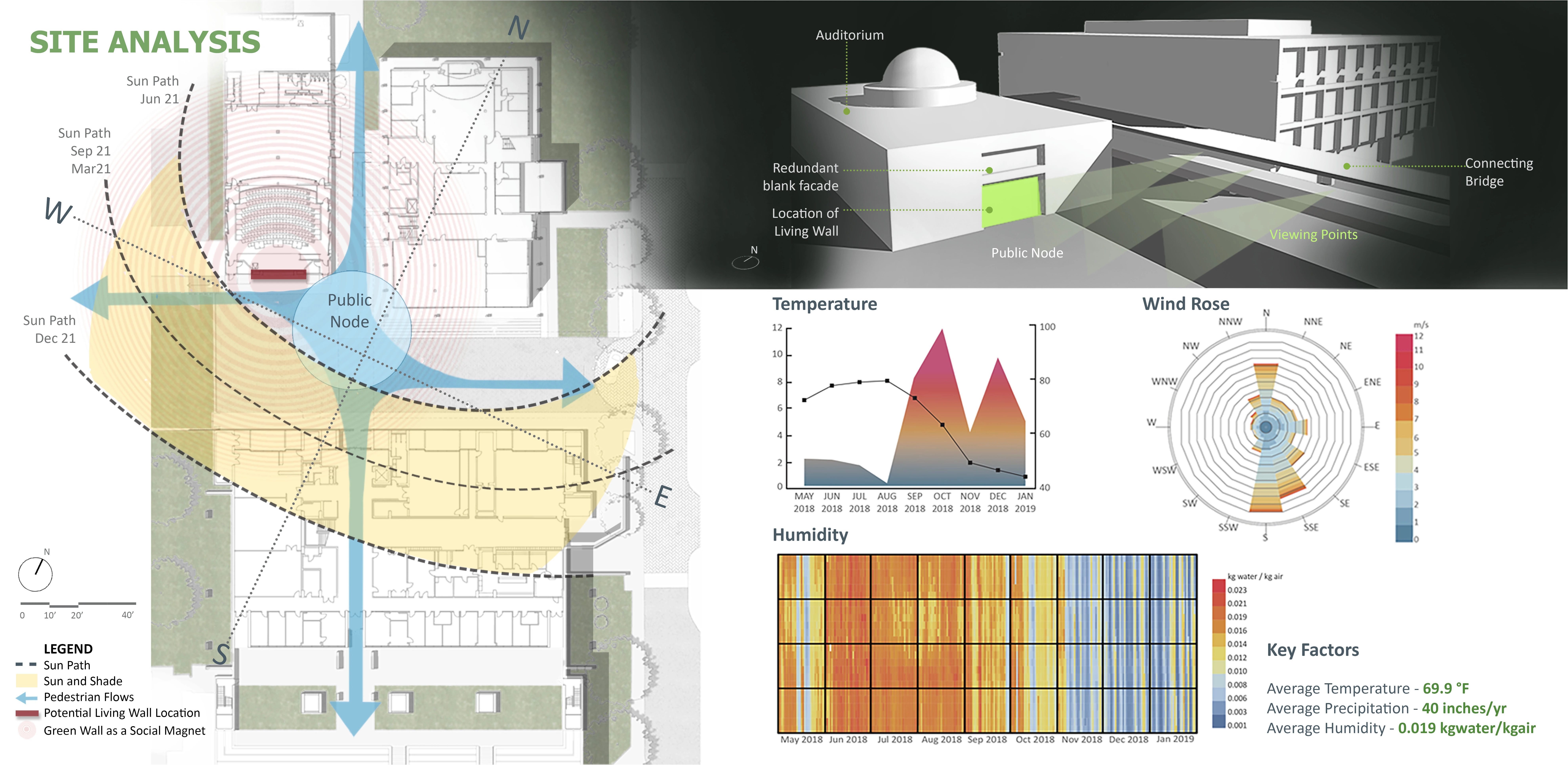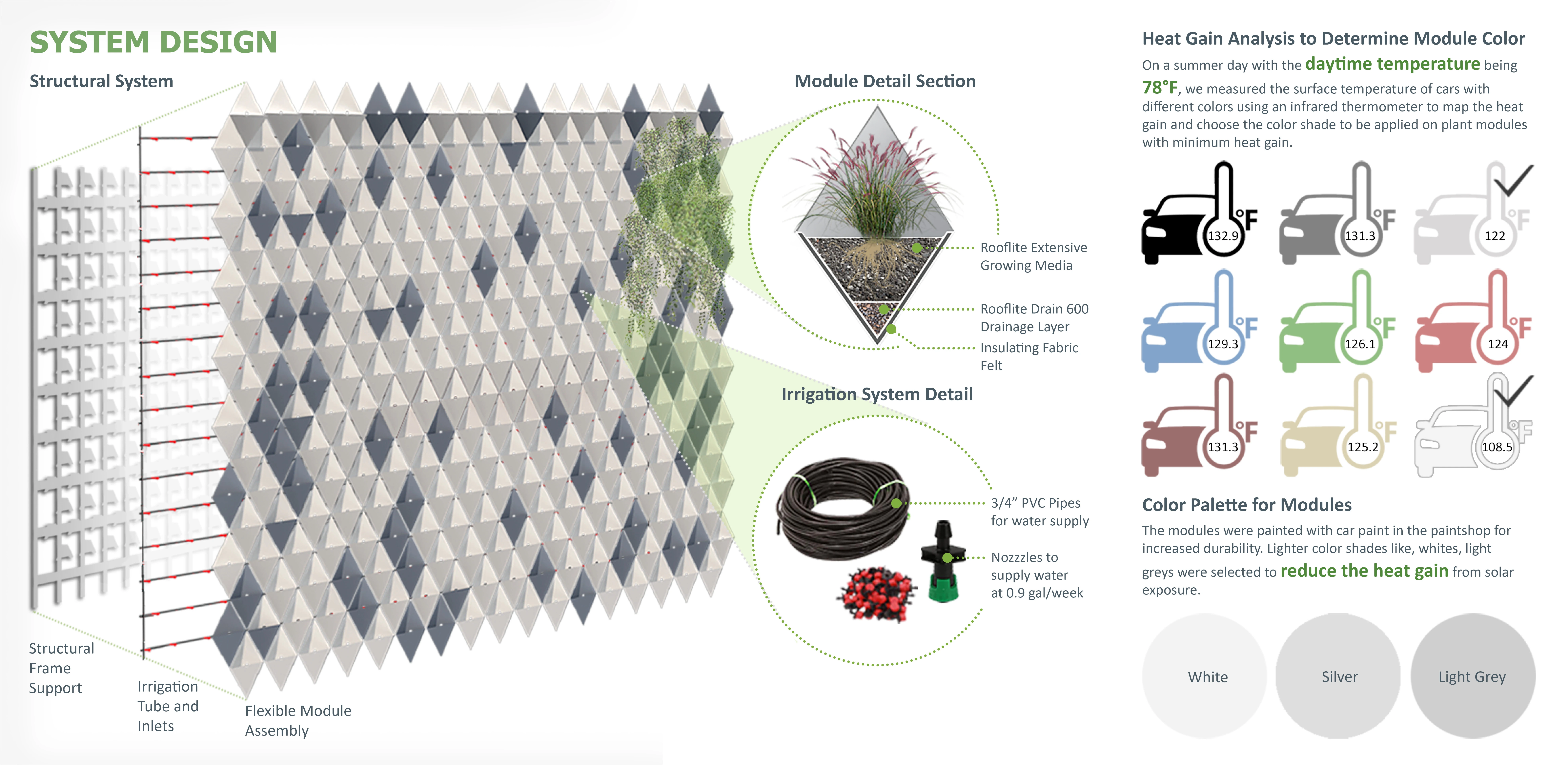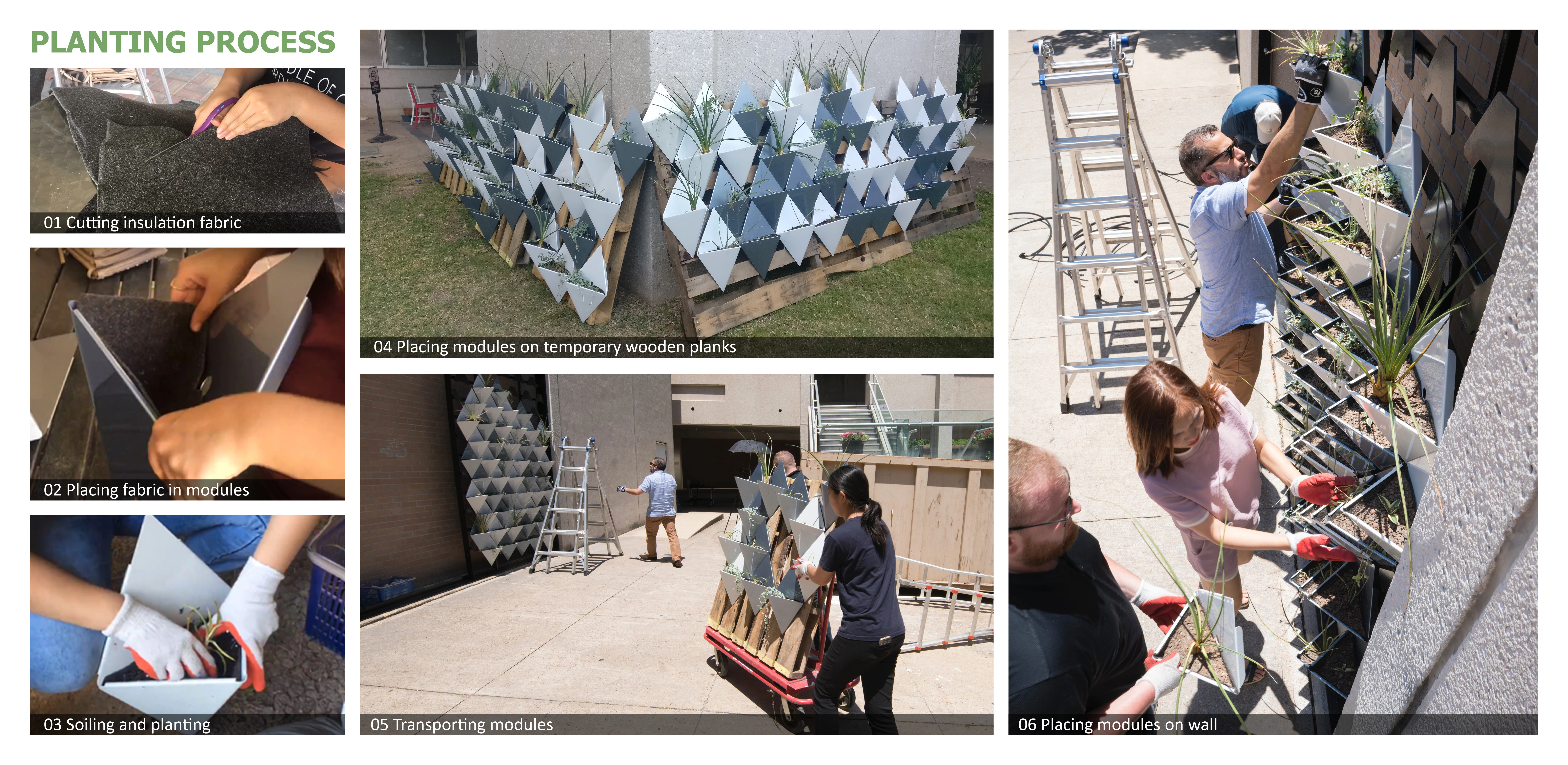 This interdisciplinary project began in Fall 2017, where students from architecture and landscape architecture departments, under the guidance of faculty, collaborated to design a custom living wall system built from scrap metal sheet which is an industrial by-product during automobile production. The fundamental goal of this project was to design, build and evaluate the performance of this custom living wall system to support a circular economy. Driven by lessons learned from on-site research on three vendor-provided systems, this custom design aimed to resolve several limitations of market-based systems. We followed an iterative collaborative approach to answer unique challenges of this project such as a south-facing exposed wall, metal being a primary material and requirement to be a low maintenance living wall system. During the conceptual design phase, we explored different shapes and forms. We studied the effects of colors on automobile metal surfaces exposed to the sun to understand the relationship between color and heat gain. Using a digital infrared thermometer, on a 78.8 ° F, day white paint was 108.5 ° F, and black paint was 132.9 ° F. Our results helped us to propose white and shades of grey that would reduce the percentage of heat gain, as well as the unique pyramidal shape that faces away from direct sunlight. As a result, the custom design (patent pending) allows ample space for plant canopy and root growth, a cooling effect on the microclimate, and a natural upright positioning of plants.