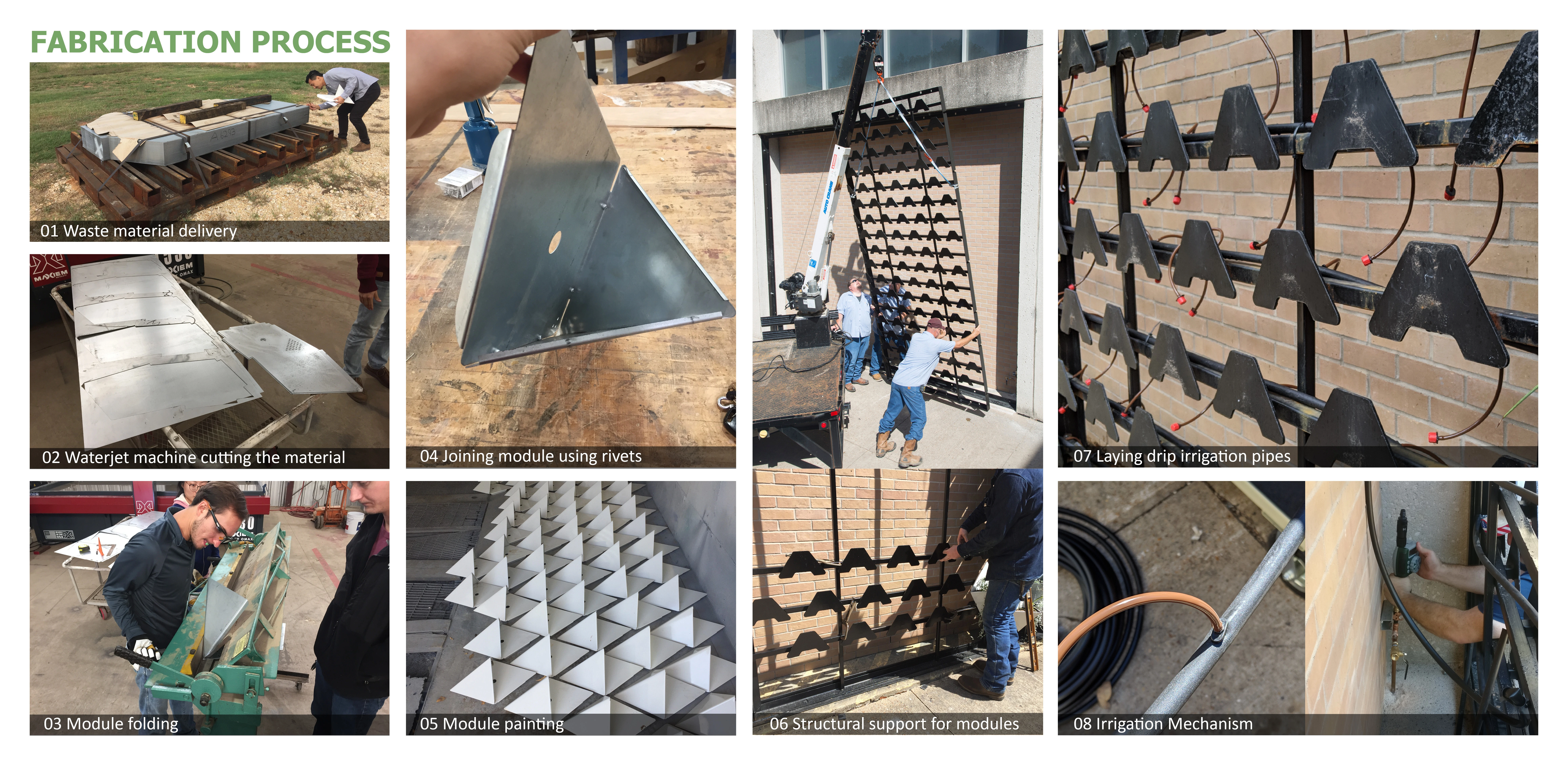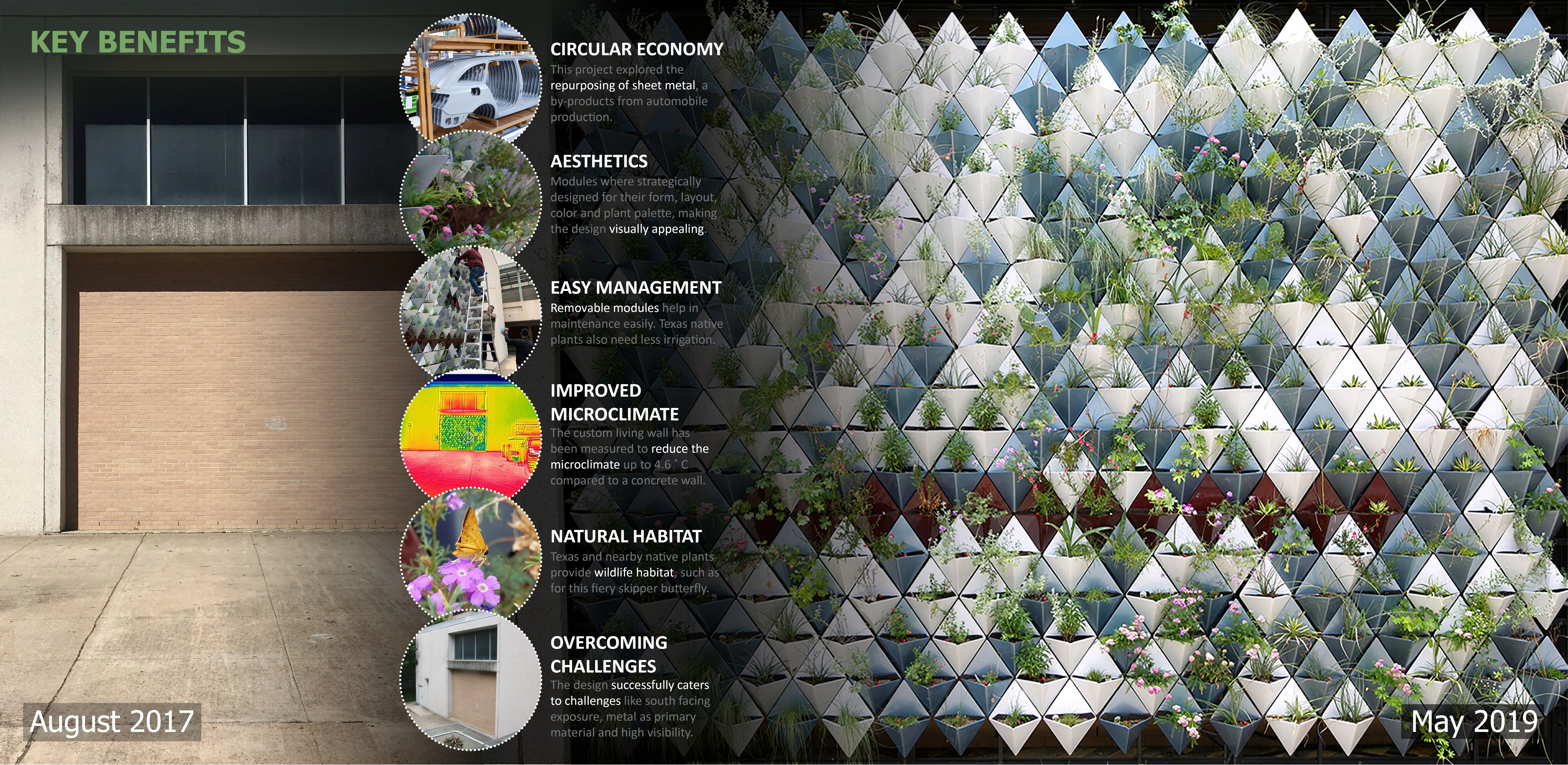This design-build project is a result of successful collaboration between three main entities. Firstly, the automobile industry which supplied the materials free of cost, secondly, the core design team of professors and graduate students in landscape architecture and architecture programs, and thirdly, the workforce of graduate and undergraduate students and teams at the fabrication lab who contributed in bringing the design concepts to reality. This unique idea of a custom living wall system has great potential to demonstrate a circular economy for living walls. It is cost-effective and environmentally sensitive as it utilizes waste sheet metal. It can essentially create opportunities for research and design for the incoming students in the landscape architecture and architecture programs. They can get a hands-on experience in understanding how a living wall system works and the factors playing a key role in design of modules and structural systems. Their academic products can be marketed commercially to promote the integration of the living wall systems in infrastructural development and making this project and the processes involved cyclical. The custom living wall system has proved to be sustainable, reduces heat reflectivity to cool the microclimate, creates an aesthetic appeal, is easy to maintain, attracts pollinator insects and butterflies and functions well compared to few other living walls in Texas. -