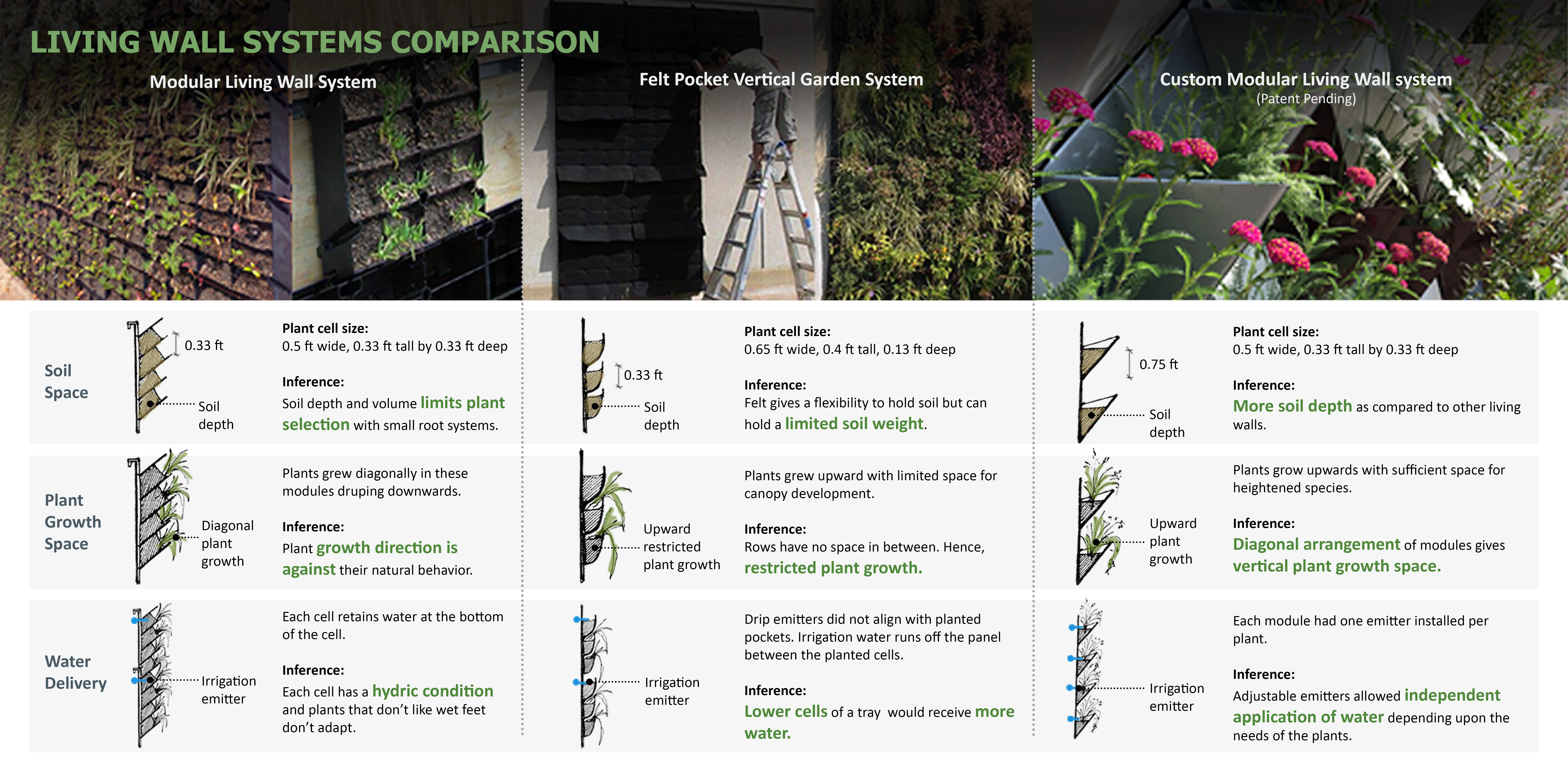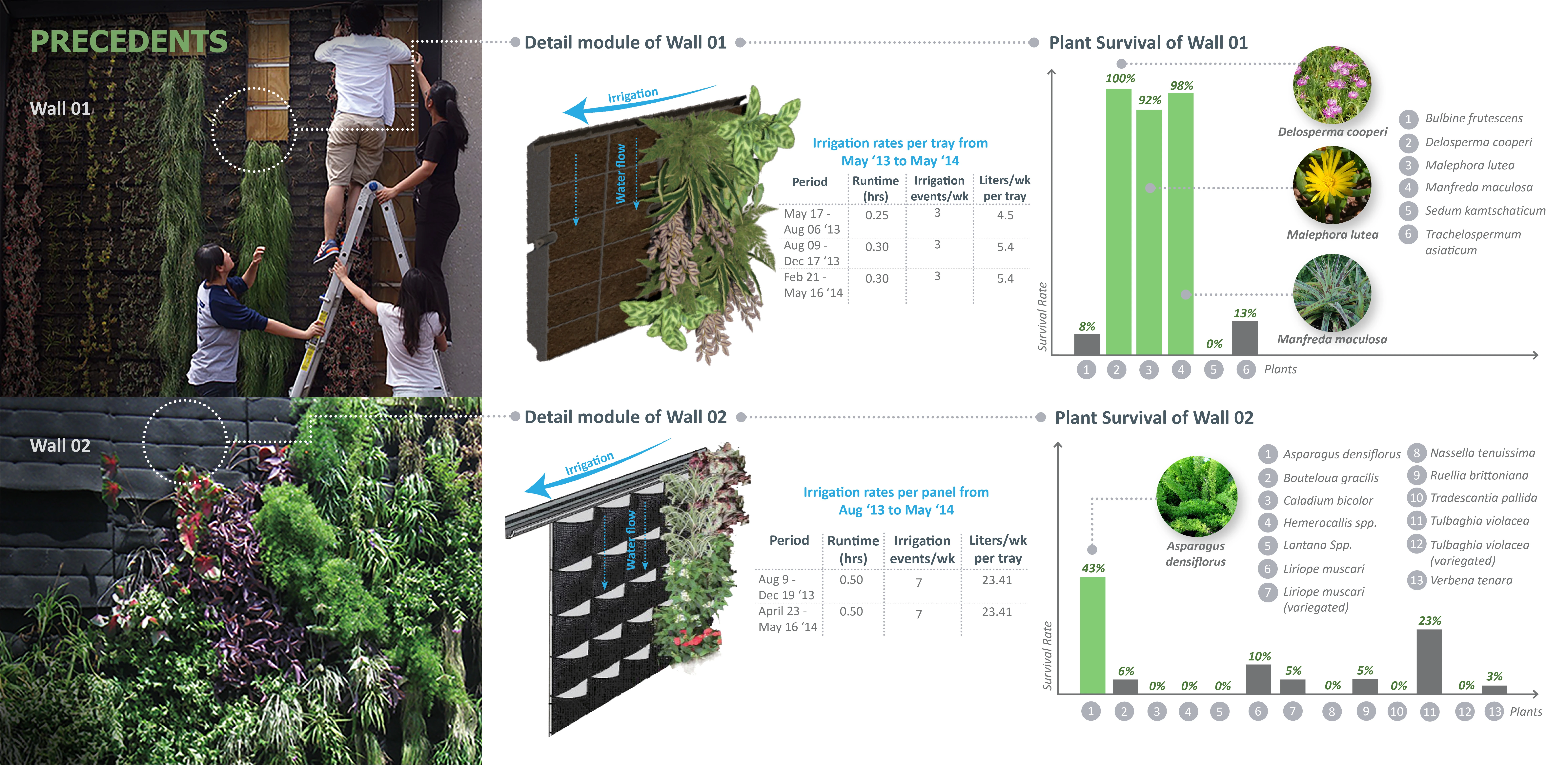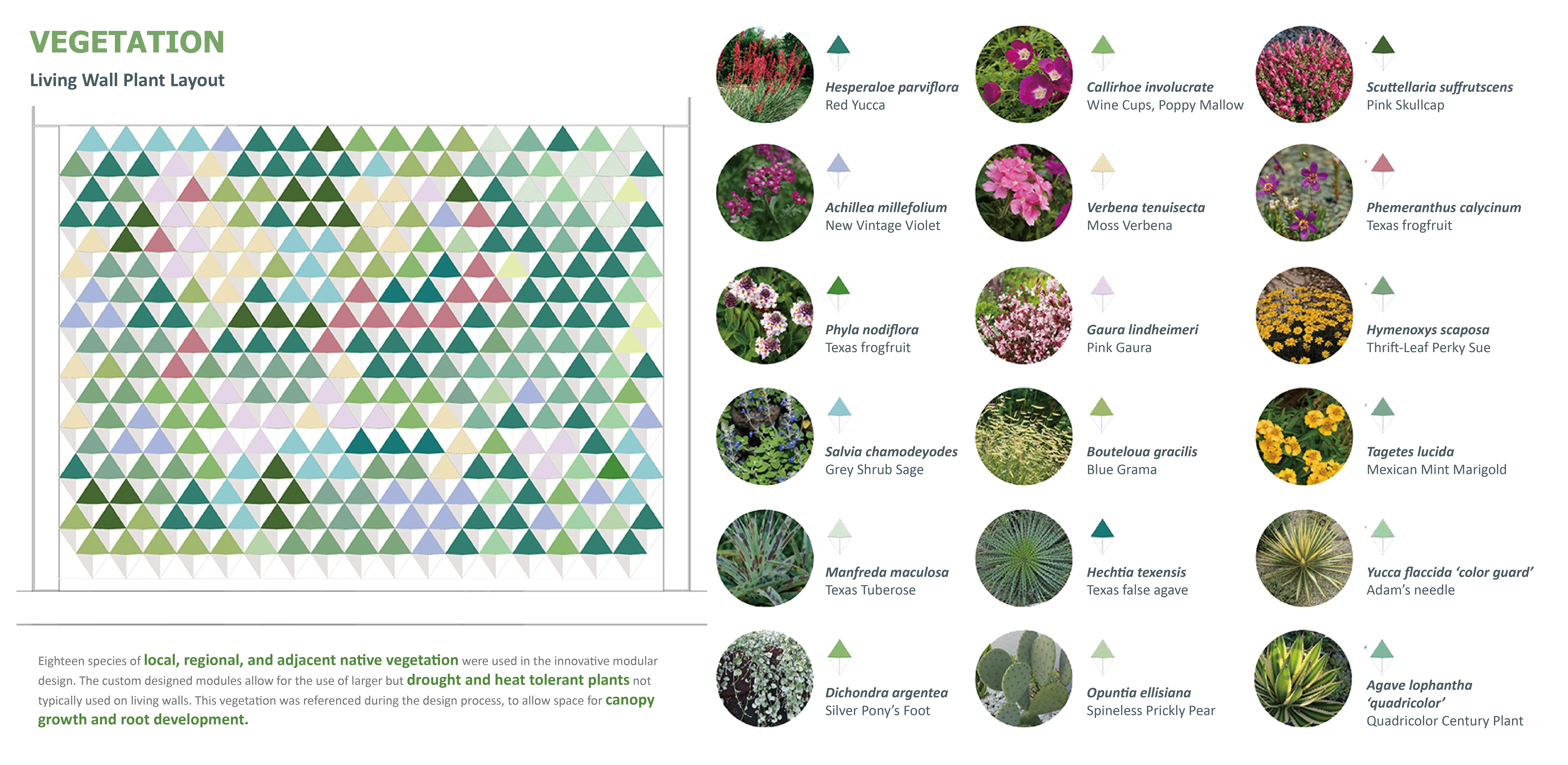 The design of the system evolved in order to create an optimal microclimate for plants with the help of drainage, irrigation delivery and plant positioning. The module shape and size were strategically designed to hold maximum soil volume. Each module has provisions for individual irrigation inlets and drainage. A steel structural support system was designed that holds the modules and supports the drip irrigation system behind the modules. The diagonal arrangement of modules gave an appropriate vertical space to grow for upright plants like Red Yucca. Living walls can play an important role to improve urban microclimates; however, they may face limitations especially in extreme hot and cold climates. The selection of plants is critical in the success of living walls. Studying the work of previous research on plants for living walls on campus, we experimented with primarily drought-tolerant, native and adaptive plants.