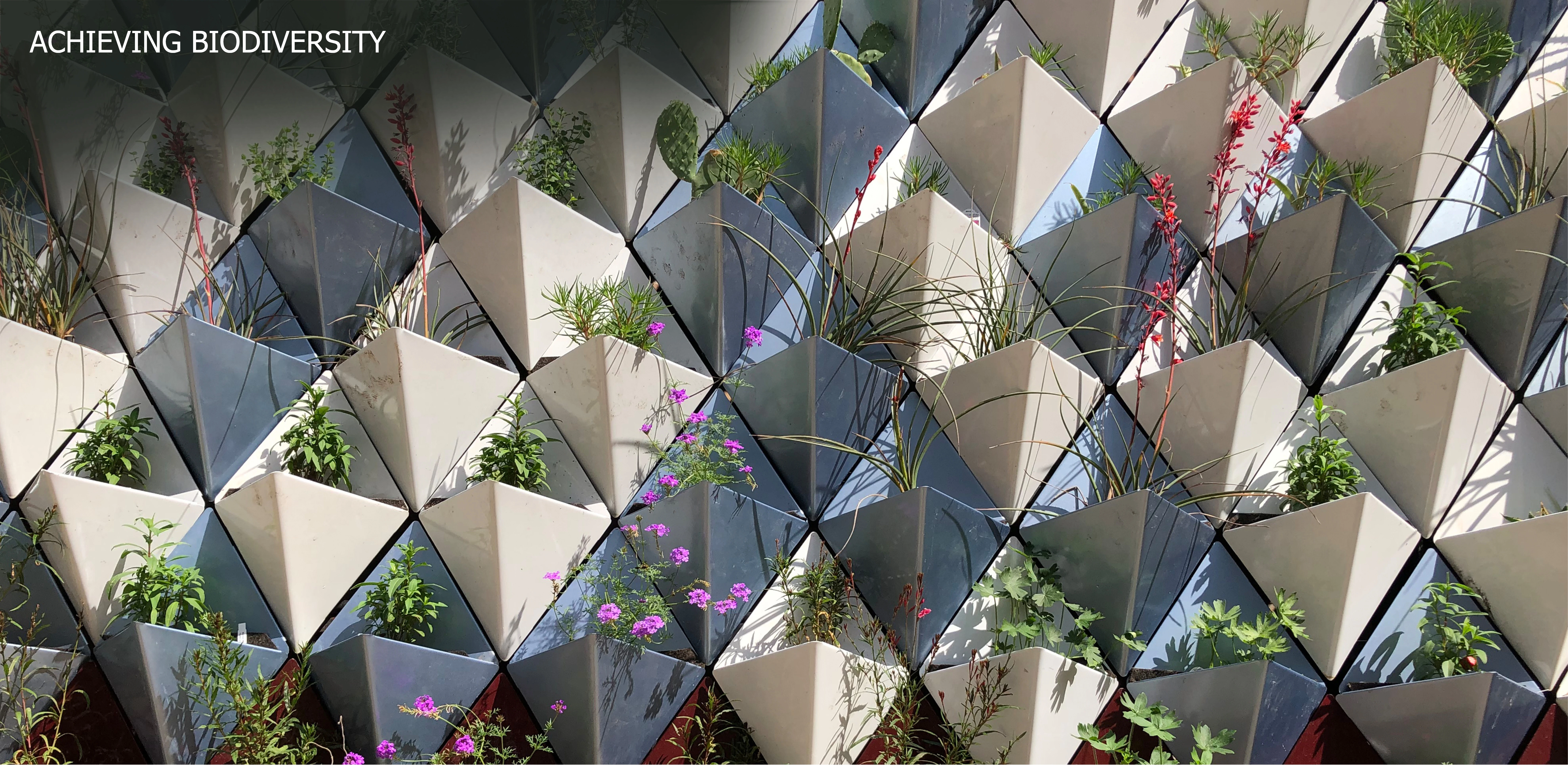 A multi-year, cross-disciplinary process led to the development of a galvanized steel living wall system, as well as the potential for a circular economy that transforms industrial waste into green infrastructure while enlivening a blank wall. Automotive sheet metal scraps become inverted pyramids that form a flexible façade garden; individually demountable units allow discrete control and modulation of watering, soil maintenance, and plant health. Extensive study of plant performance across eighteen species, paint performance as related to heat gain, and comparisons to existing wall systems resulted in a diverse micro-scaled ecosystem that welcomes pollinators to a new focal point.
