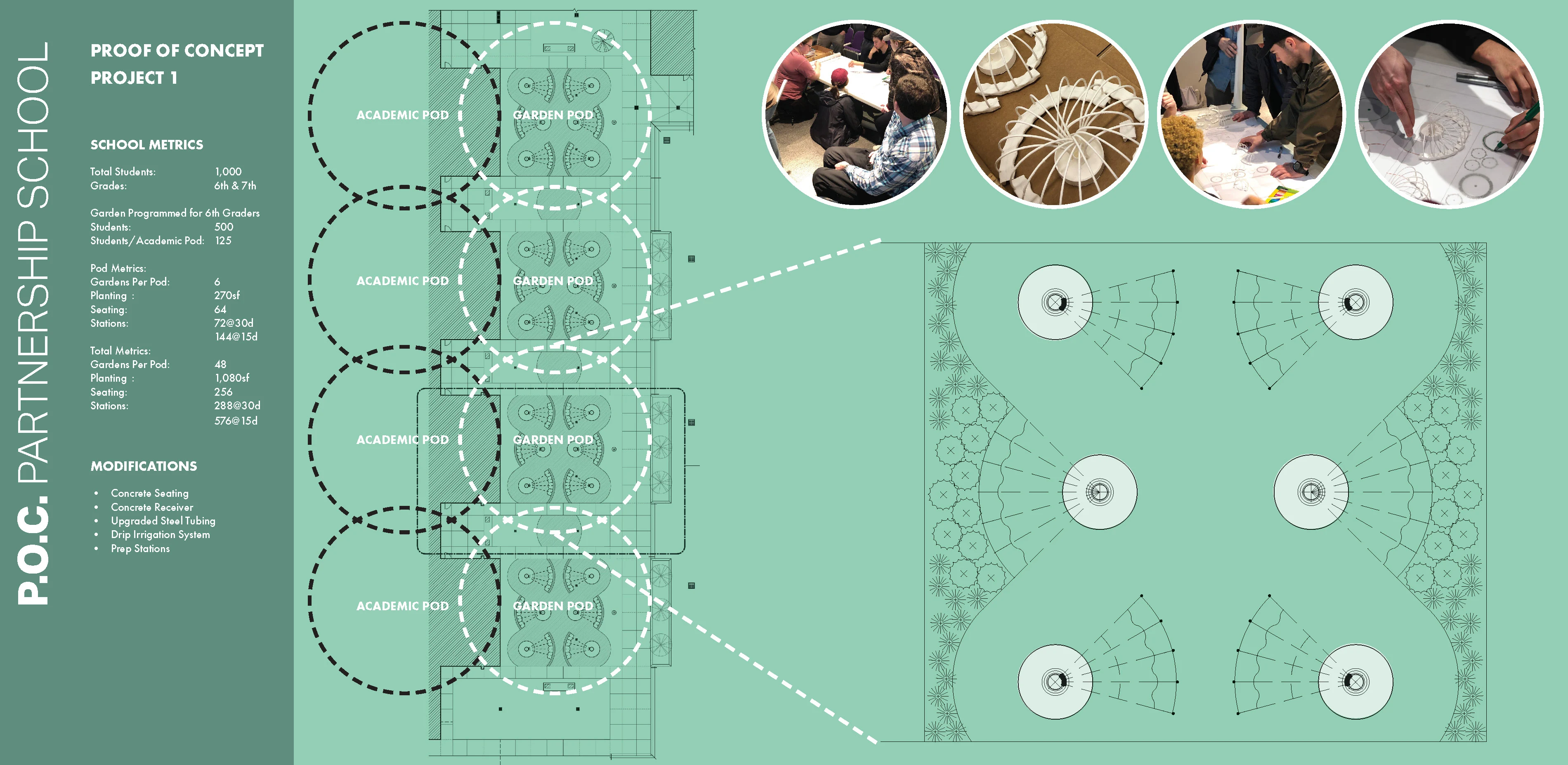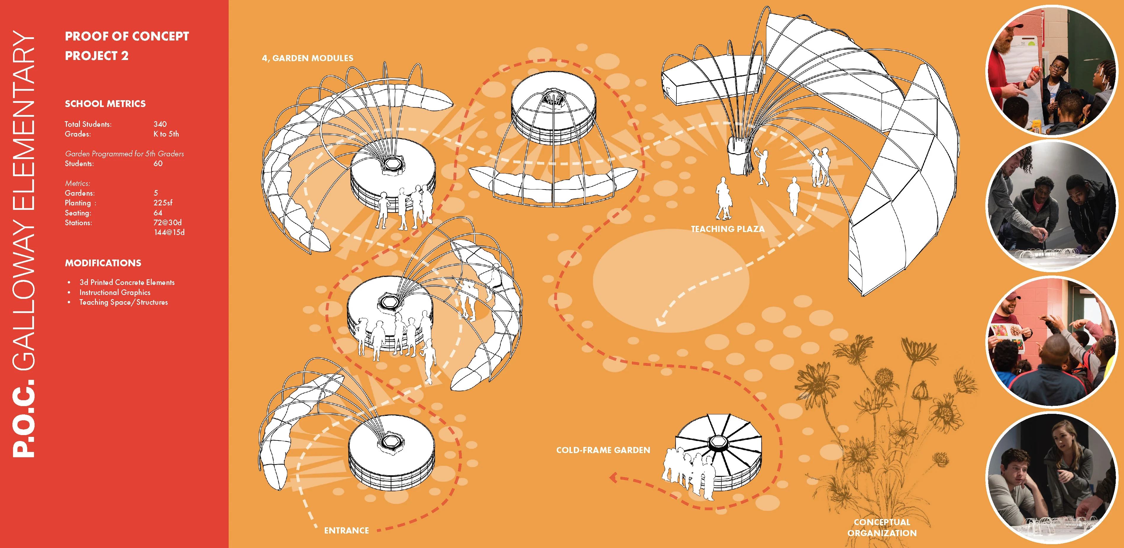 A prototype teaching garden combines low-cost materials with reduced maintenance needs in an easily implementable design. Drawing design inspiration from garden use objectives, the prototype led to two proof-of-concept sites, with feedback from these sites informing refinements to the final product. The studio deployed 3D-printed concrete for infrastructural components of the garden, such as storage space and planters with attached benches, and used graphic treatments to demarcate specific garden zones. Shifting to online instruction in the face of COVID-19, the studio renewed focus on developing documentation for the prototype to allow broad, web-based dissemination.