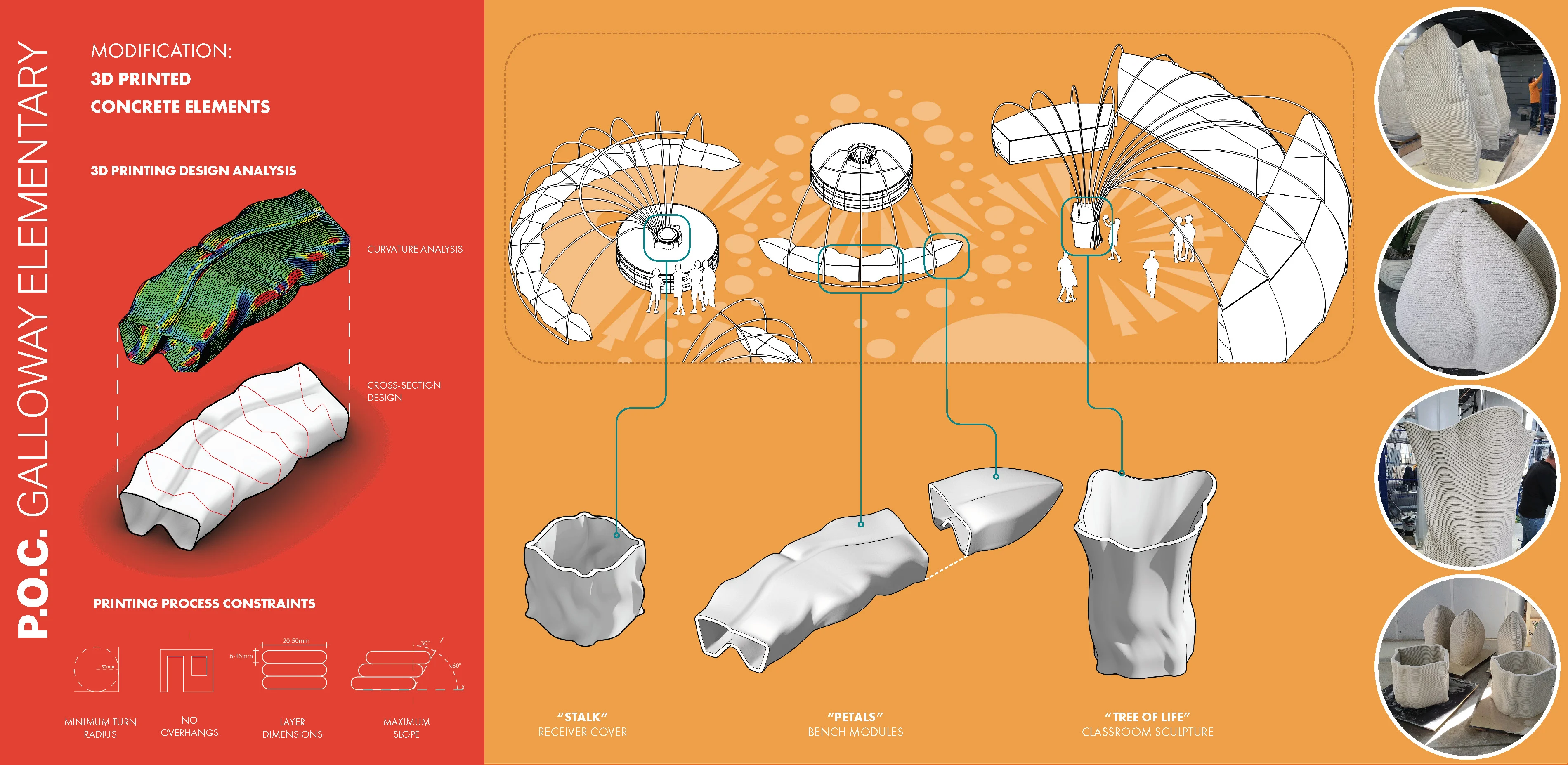 At the beginning of the design, the team reached out to a concrete manufacturer who is developing a new, rapid concrete printing technology. As a partial donation, the company agreed to work with the team to develop an alternative design for the benches and “vases” to hide the hoop receivers. These elements are the first execution of the new technology in the U.S. and use the unprecedented flexibility of the technology to make organic surfaces that turn the planters into giant flowers, where students sit on petals. The team worked with the concrete company to design, refine and print the elements.