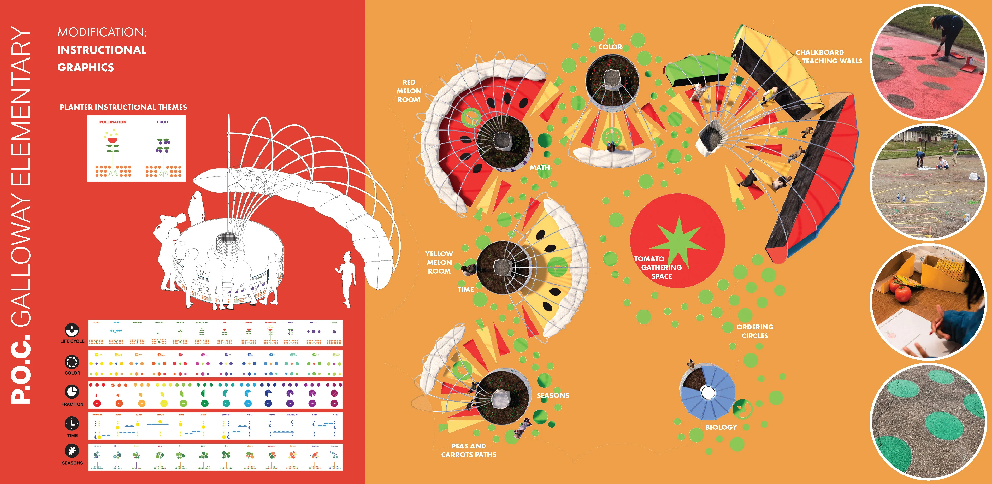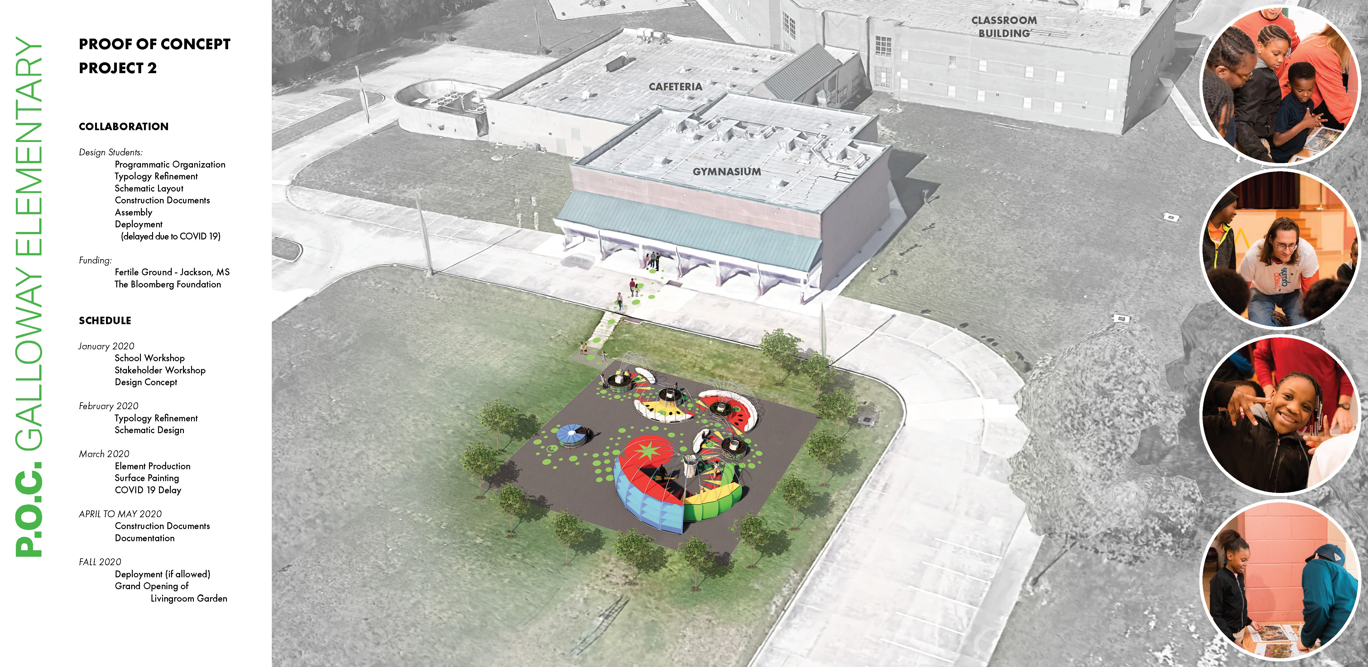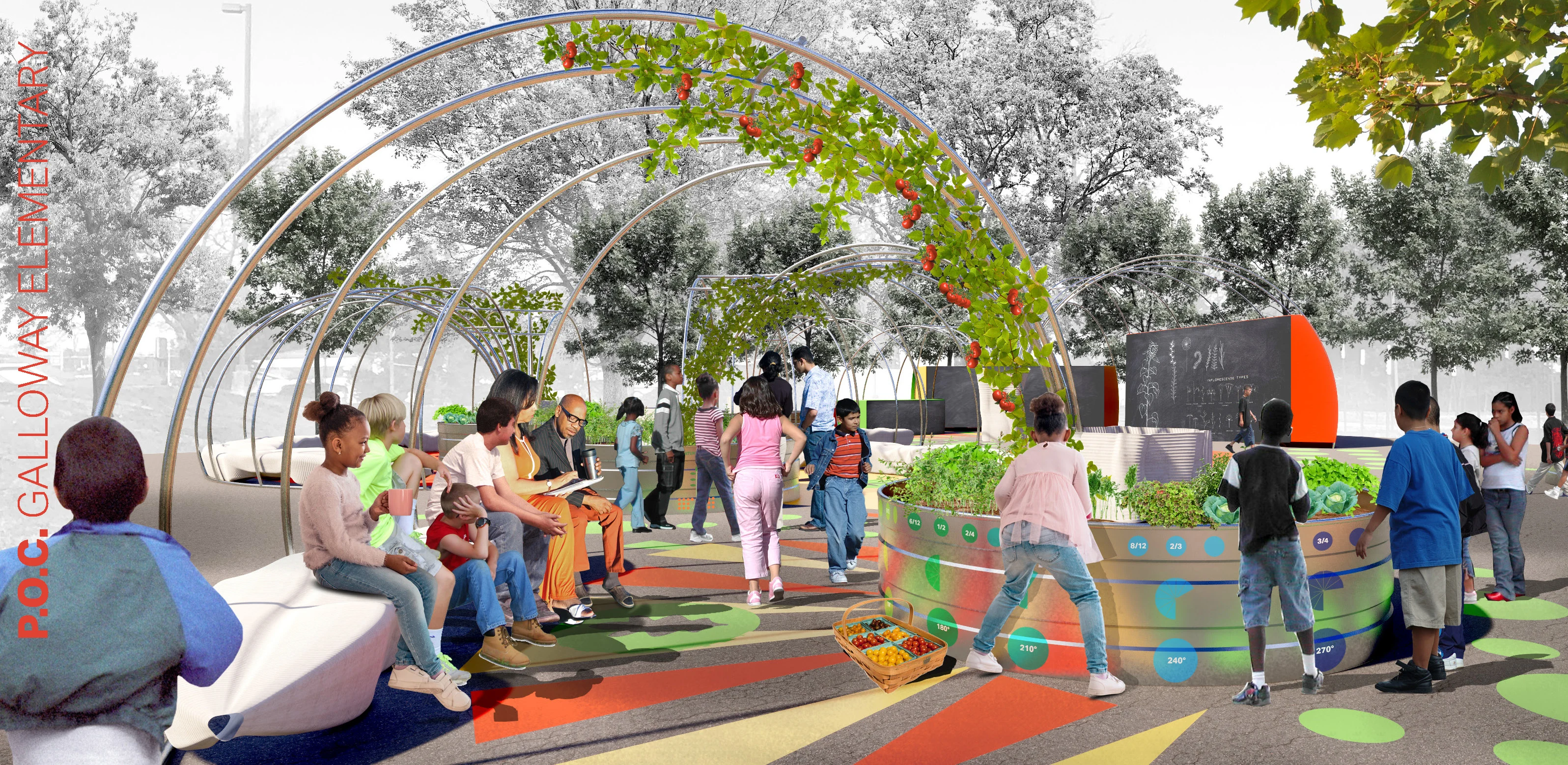The K through 5th grade Galloway Elementary school is located in a USDA classified food desert, surrounded by fast-food chains. The existing school is extremely limited in funding and resources. With a $25,000 budget from an arts grant, the team started the process by engaging the 5th graders in a creative workshop on food nutrition to generate inspiration for the design. An abandoned asphalt playground adjacent to the gym provided the perfect platform for the garden. It was also an opportunity to explore how the typology could be improved to make it more dynamic in terms of design and experience, more flexible in terms of instruction and course delivery, and more interesting in terms of excitement and fun for the students. The garden was planned to be implemented at the end of the semester with volunteers but was delayed due to COVID 19 until the fall. However, all of the components have been fabricated by students and are awaiting installation.