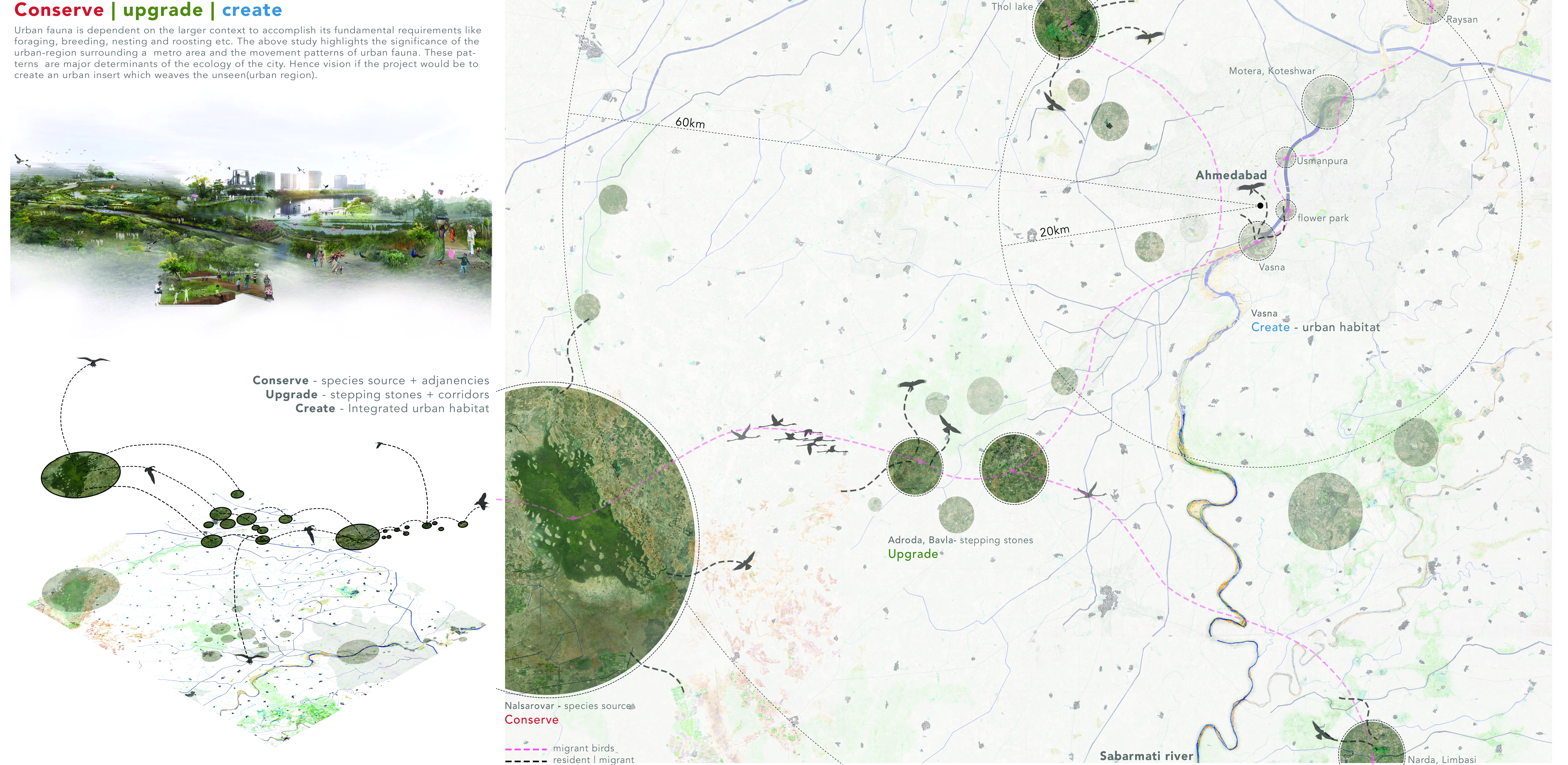 In the midst of rapid urbanization and climate change, wildlife habitats have become indispensable components of the urban fabric and landscape of cities. Ahmedabad, one of the ten largest cities in India by population, experiences a semi-arid dry climate but has a rich resource of fauna and flora. But, the expanding city tends to fragment the remnant habitats, forested patches, and to transform extensive areas into isolated islands within predominant urban environments. Hence, where they remain isolated and small, the chances of maintaining high wildlife diversity are relatively small. In this scenario, movement of urban fauna has to be considered as an essential need for its survival in the longer run. The project investigates the possibility of an interwoven network of habitats (species sources, stepping stones, urban habitats) which would facilitate movement across the urban region and its adjacencies. It envisions to integrate the remnant urban habitats into a system of linked patches that incorporates the ‘unseen’ components of the Eco-system.