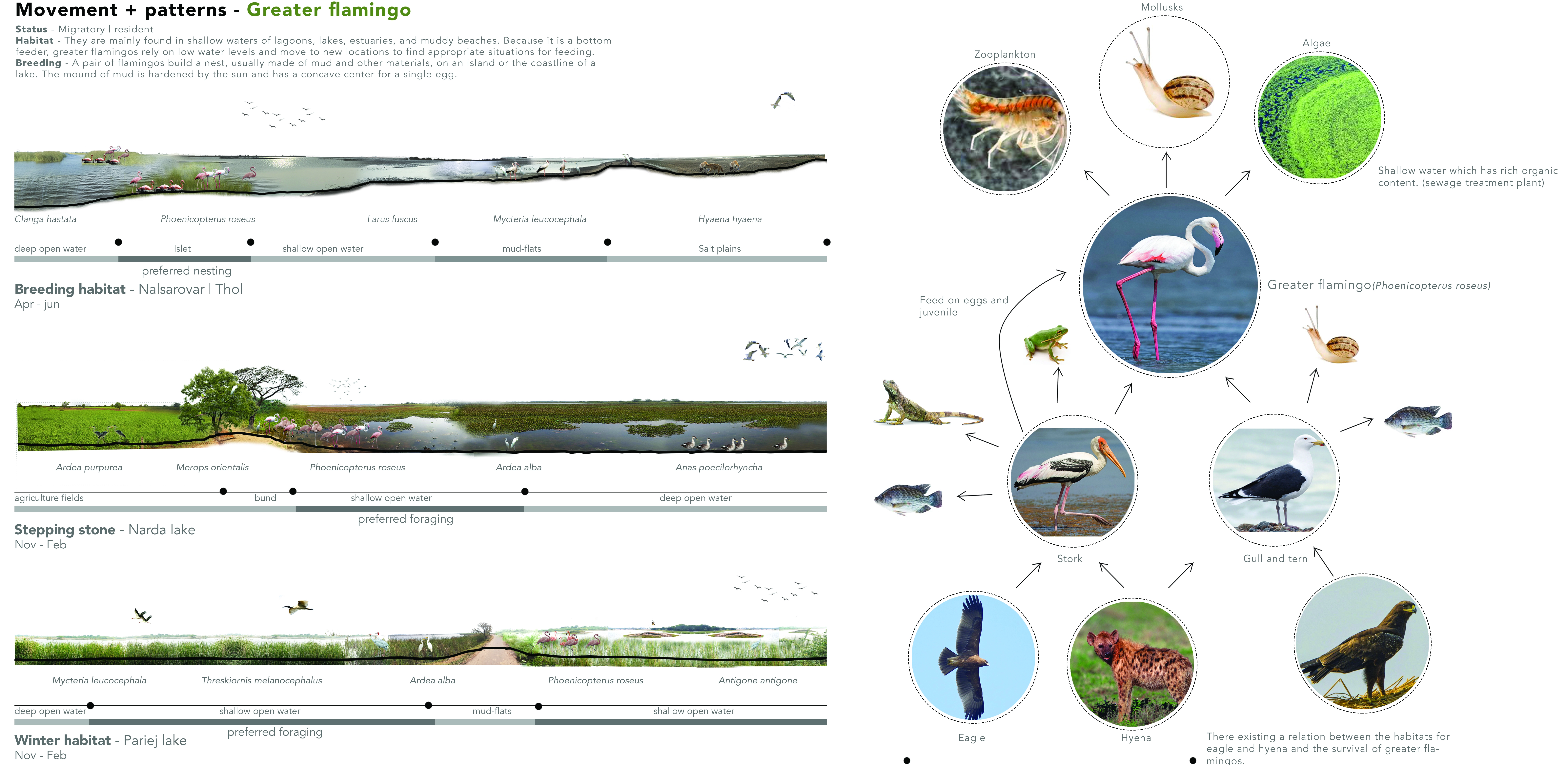 Species reserves/sources are large contiguous natural areas that sustain a large pool of native species that move across to an urban area. Typically, a large natural/semi-natural patch is either within or adjacent to the all built metro area. Nalsarovar is located 60 kilometres to the southwest of the city of Ahmedabad. It is the biggest species reserve/source within the urban region and is a critical destination for migratory birds which travel along the Indus flyway to the Indian subcontinent. Certain patches of landscapes within Nalsarovar are important breeding sites for many resident and migratory birds including the greater flamingos.