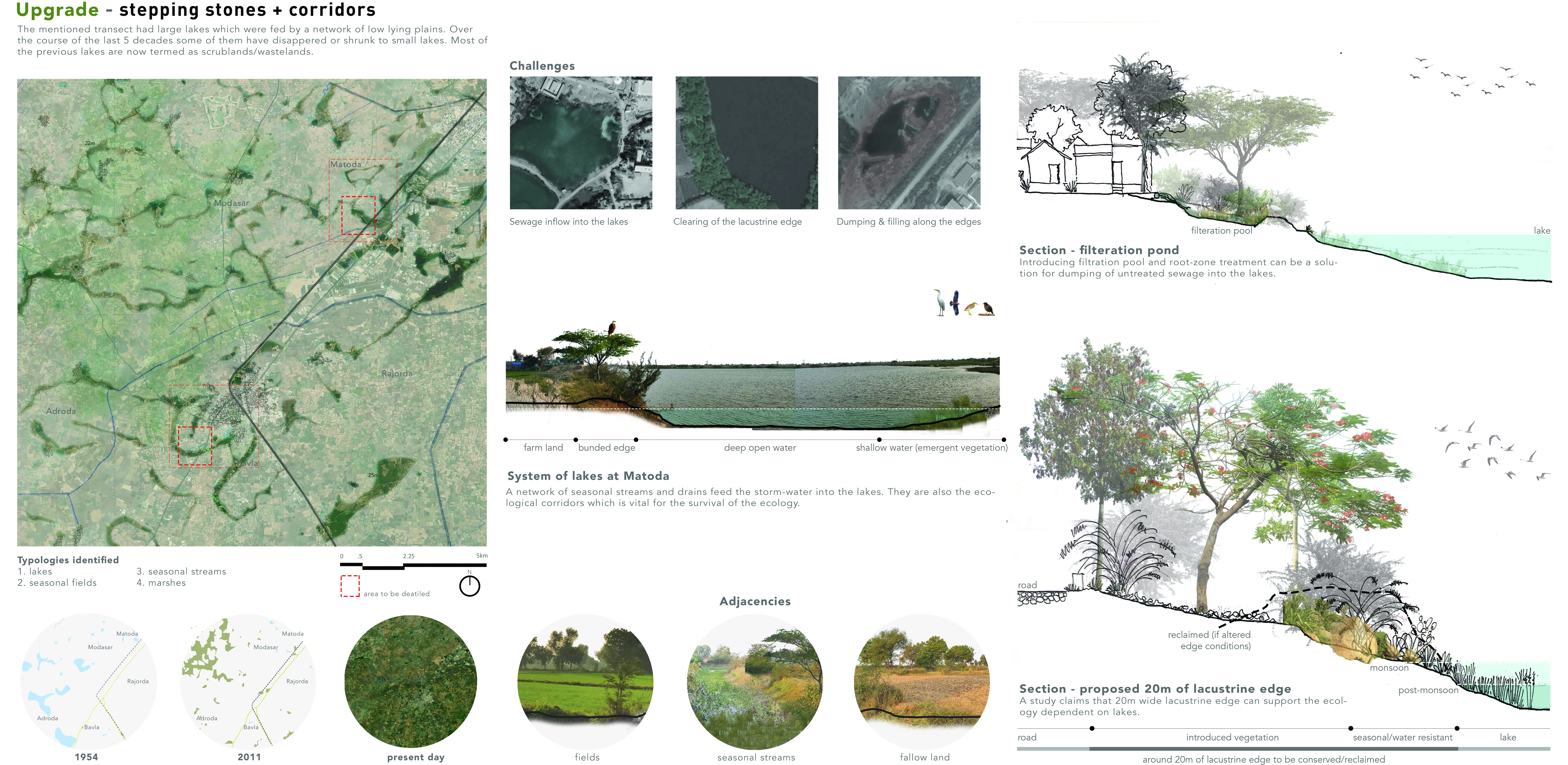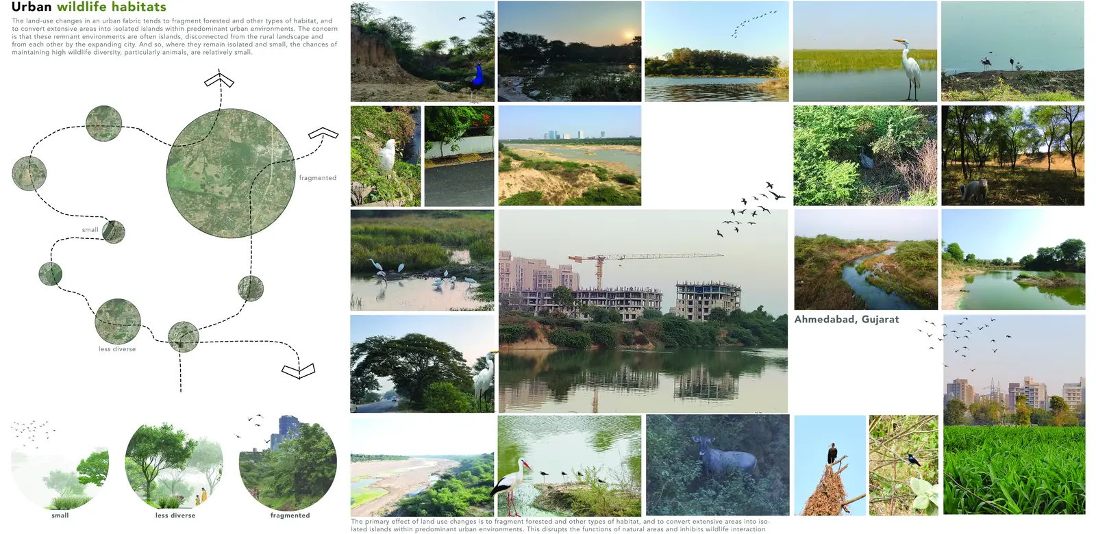 As the city of Ahmedabad, India, continues to grow, its urban wildlife habitats are shrinking; moreover, they are becoming increasingly disconnected from each other, which threatens mobility among the species that inhabit them. Yet Ahmedabad’s surrounding region does boast several oases in the form of rivers and lakes that could be knit together to form a linked network of habitats. By creating stepping stones of hospitable environments between larger reserves, this study proposes implementable interventions that would create corridors to facilitate wildlife movement, while also preserving and restoring pockets of nature within the city.