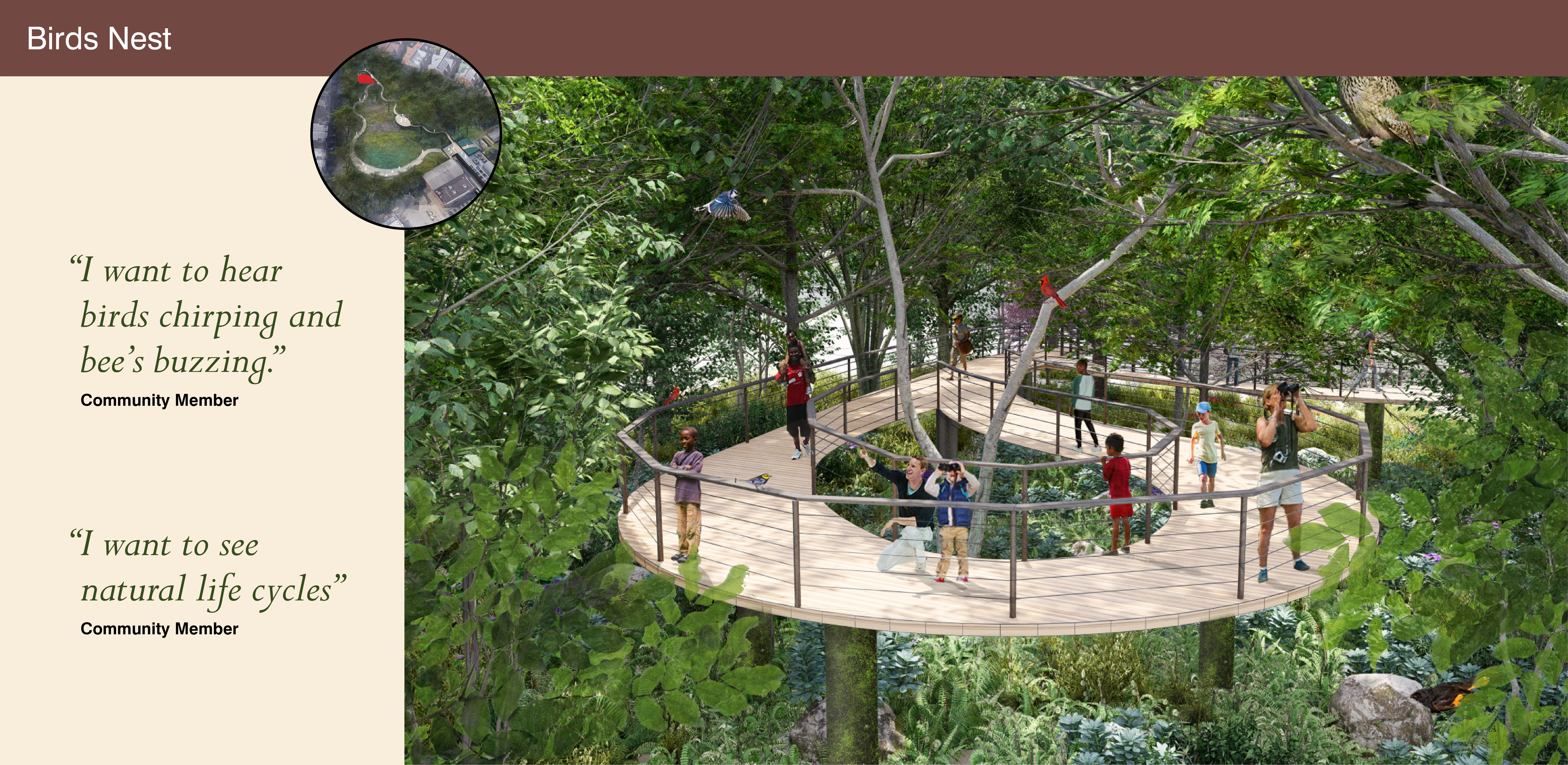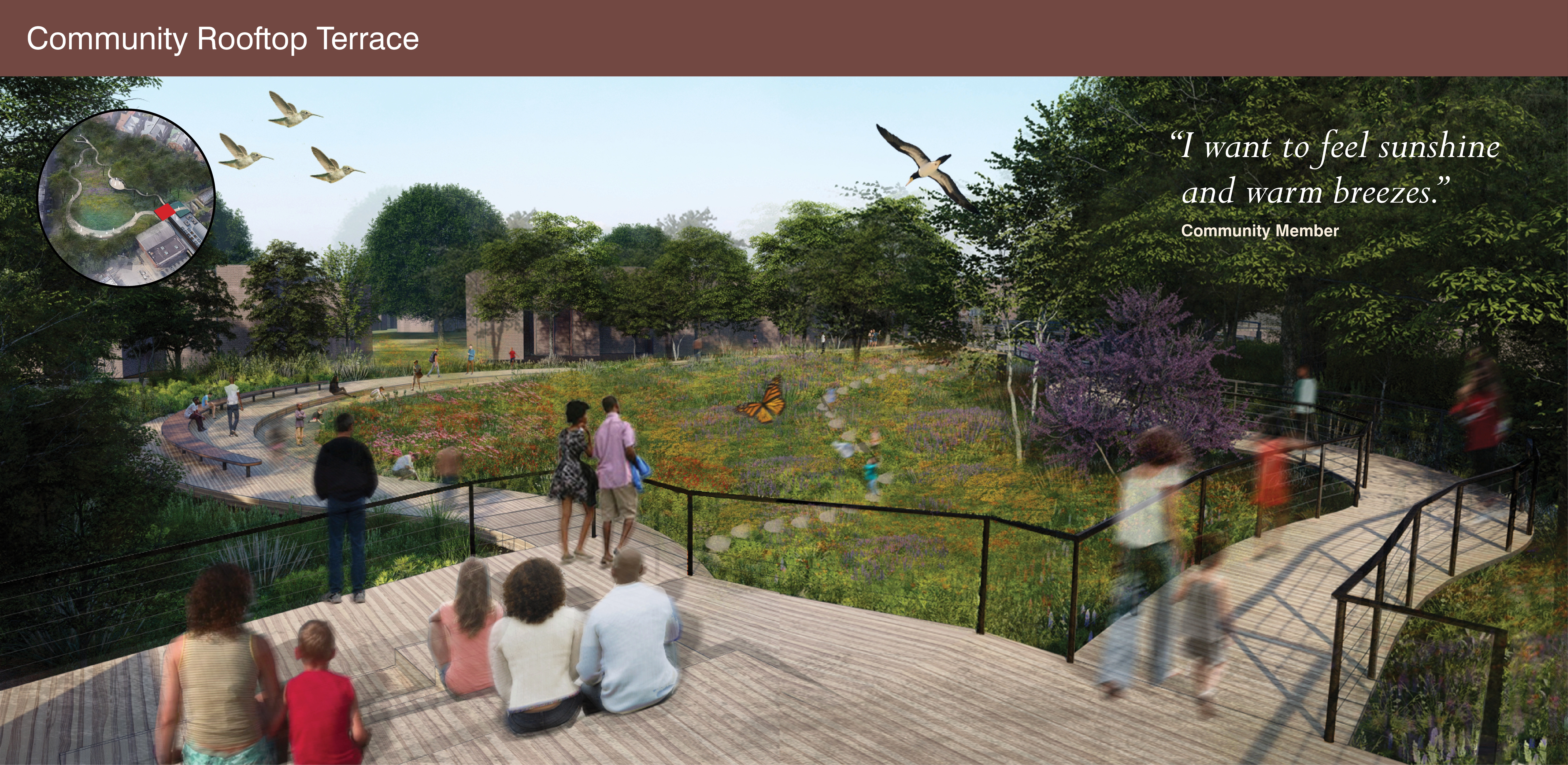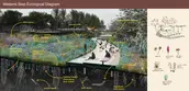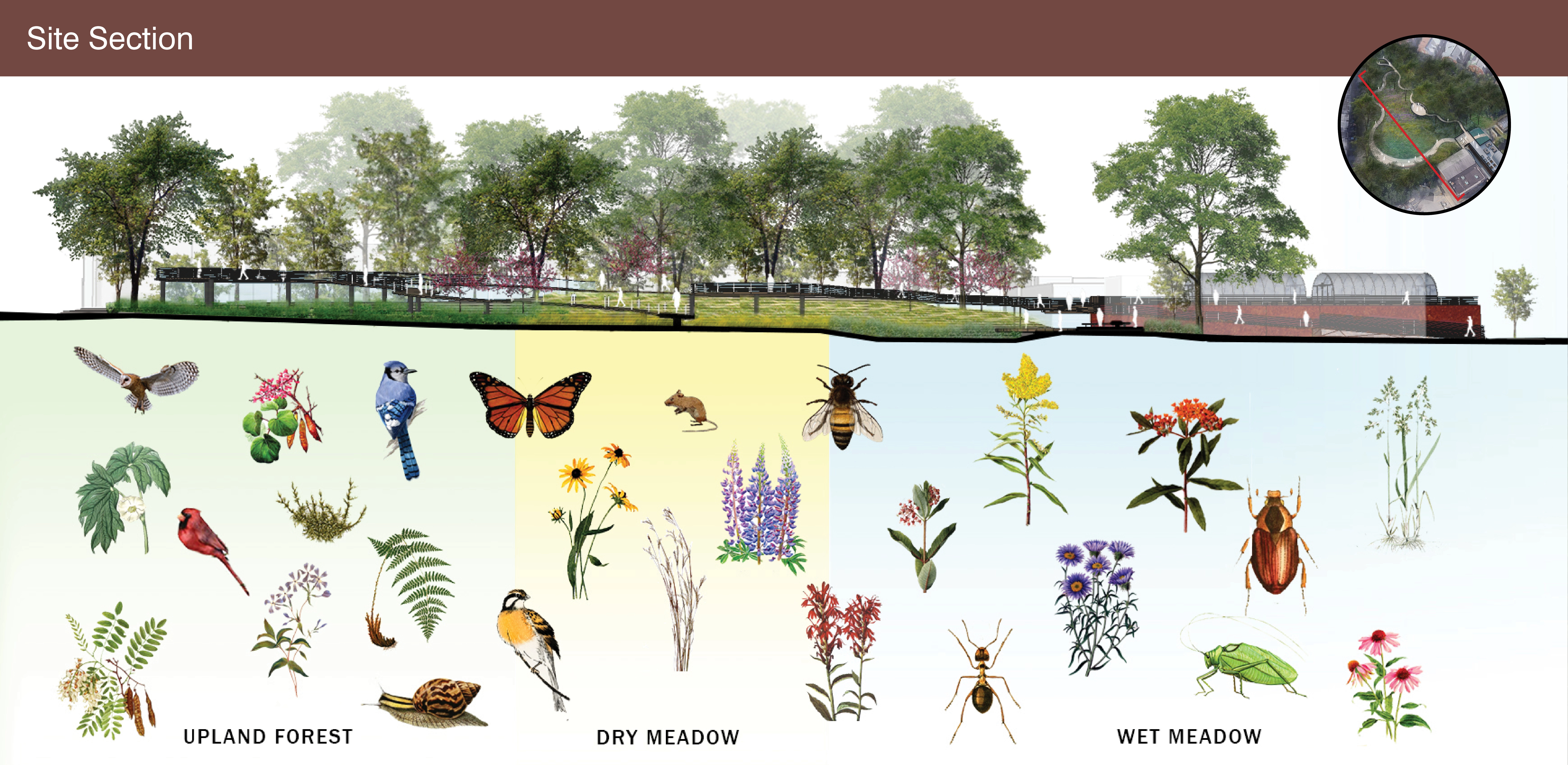 West Philadelphia’s Overbrook neighborhood lacks access to green space, but a proposal aligned with the Overbrook Environmental Educational Center would transform a vacant brownfield site into a multi-sensory nature park spread across three habitat types. Using a former creek as a point of departure, the design weaves together upland forest with dry and wet meadows to create a slice of biodiversity in Overbrook’s collective back yard. The community expressed desires for ample sunlight, sounds of water, and a broad spectrum of audible and visible flora and fauna, which led to development of a tree canopy pathway elevating visitors above the forest floor, both physically and spiritually.