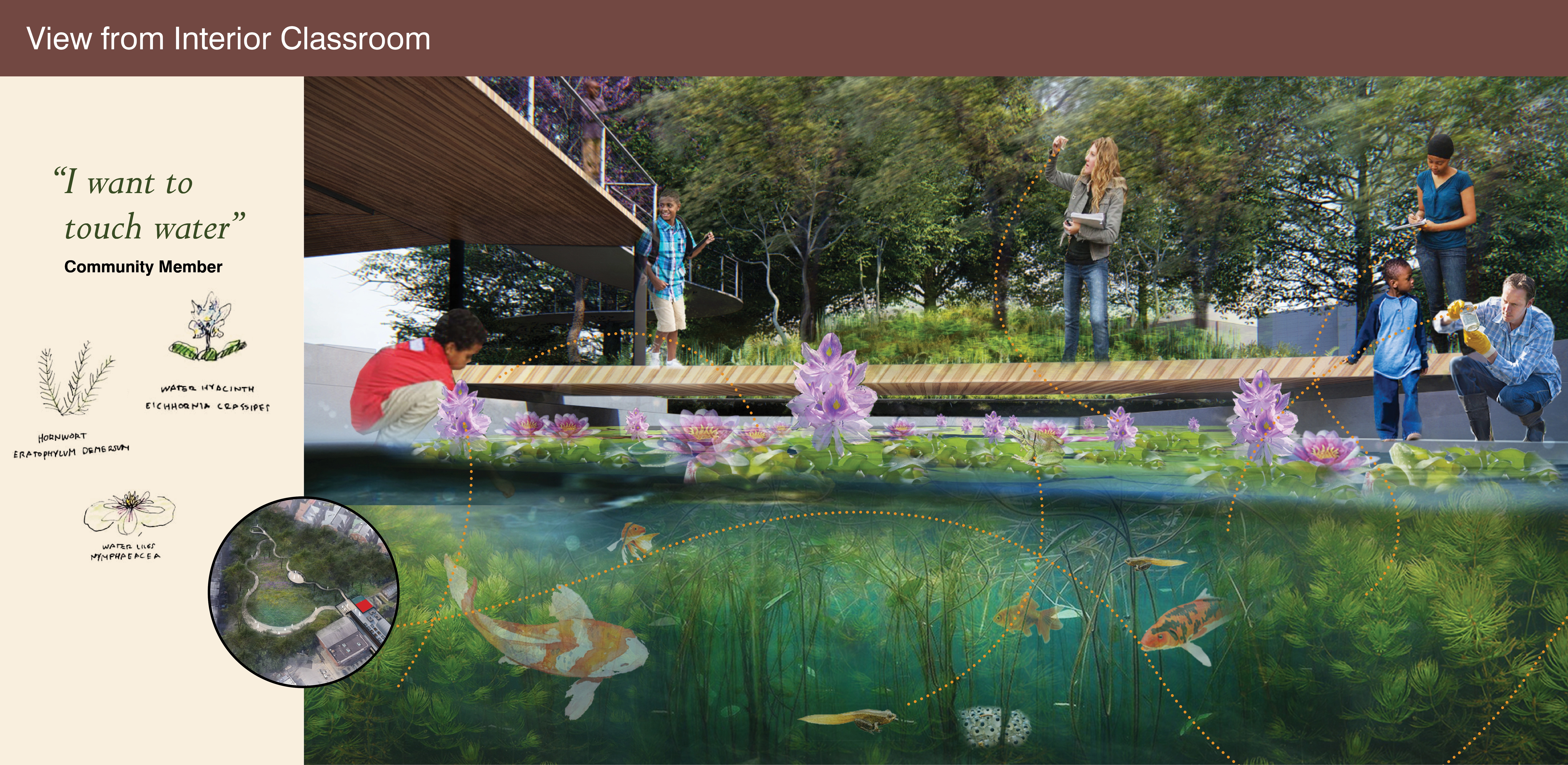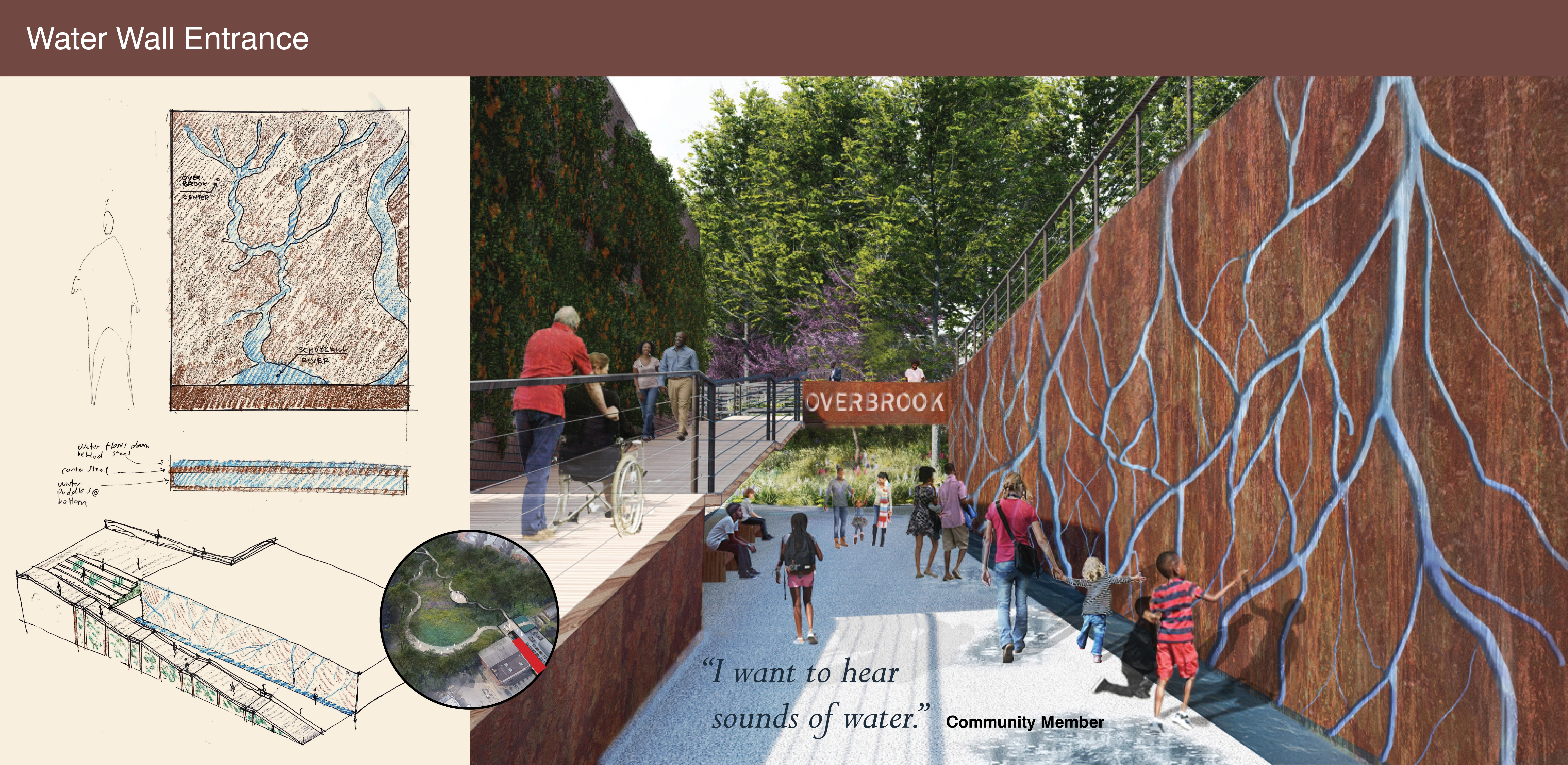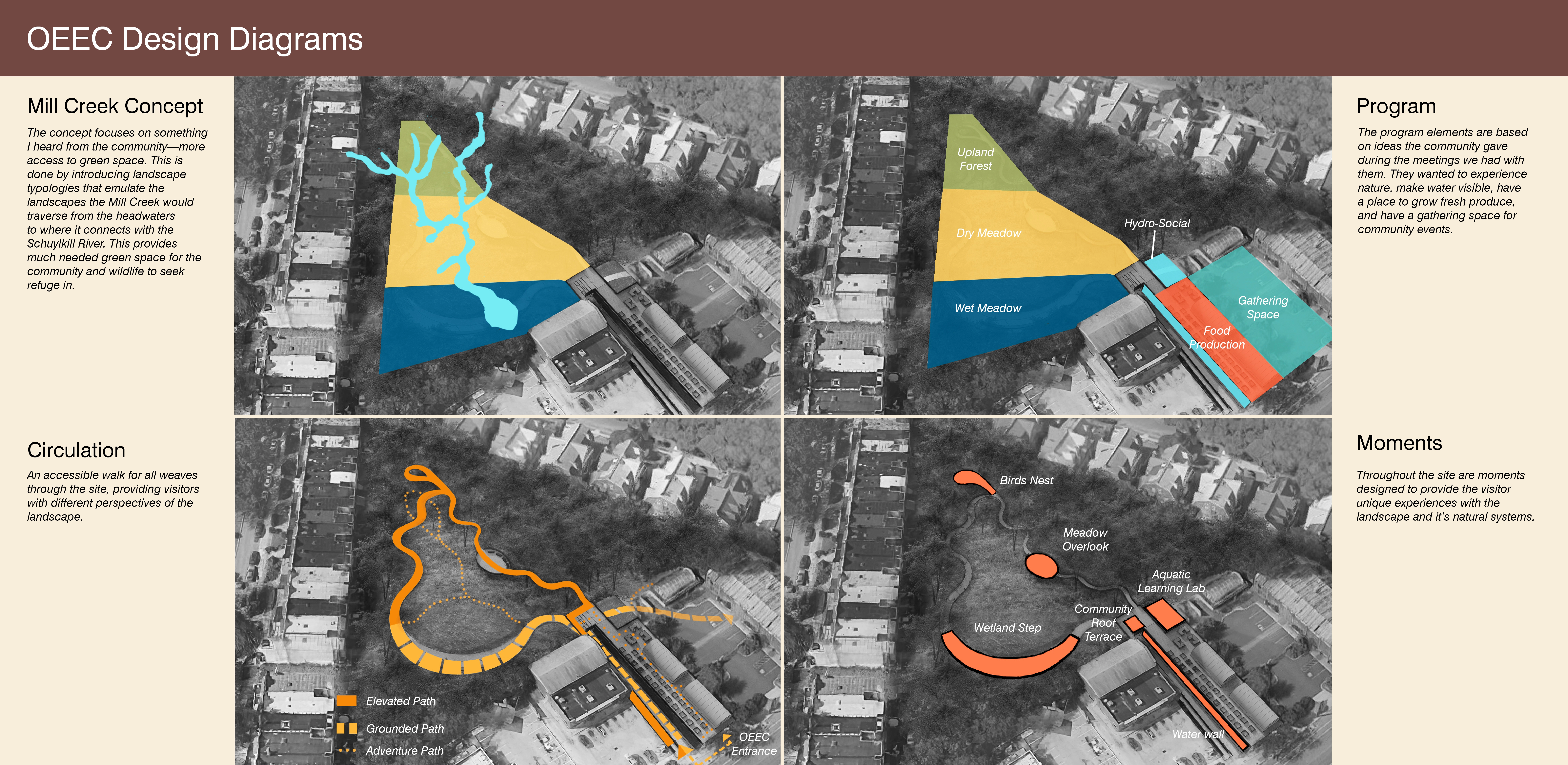 The community of Overbrook is located in West Philadelphia and is a dense neighborhood with lots of row homes but very little access to high-quality green space. Our client, The Overbrook Environmental Educational Center (OEEC) main mission is to provide an education center that gets the community outside to experience nature, improve quality of life, remediate potential environmental hazards and celebrate place. Where the OEEC is located on Lancaster Avenue creates an interesting socio-economic situation in that, five blocks to the south is one of the poorest areas in Philadelphia, while five blocks to the north is one of the wealthiest. Lancaster Avenue has made Overbrook a drive-thru neighborhood, people use Lancaster Avenue to commute to and from work bypassing the communities alongside it. We were approached by the OEEC to help create a vibrant ecological space for visitors to experience urban ecology and improve the life of residents. The studio was focused on working with a newly acquired 1.1-acre brownfield site behind the OEEC building. The OEEC director wanted the design to create a sense of wonderment and reveal ecological processes from a different perspective.