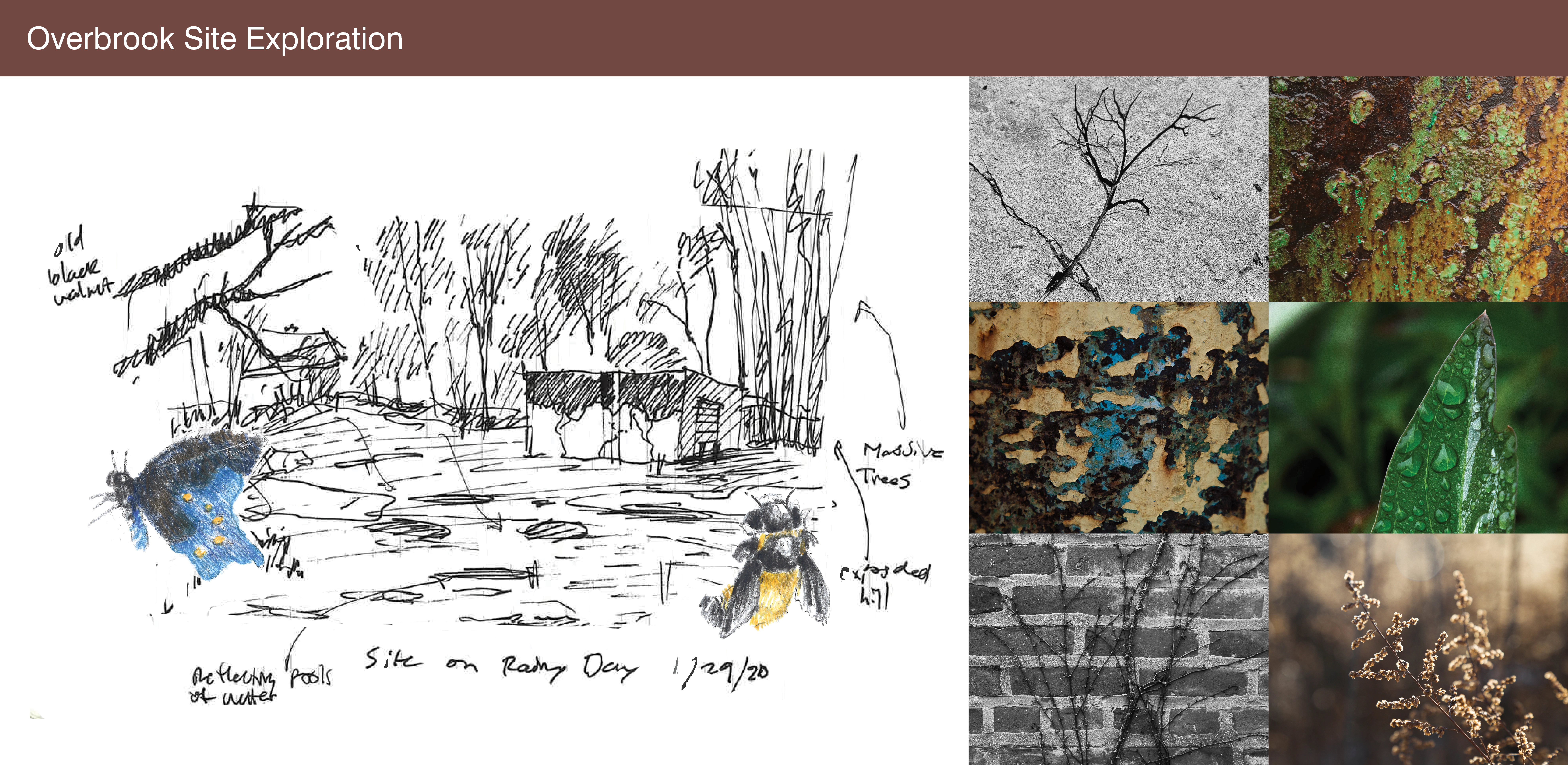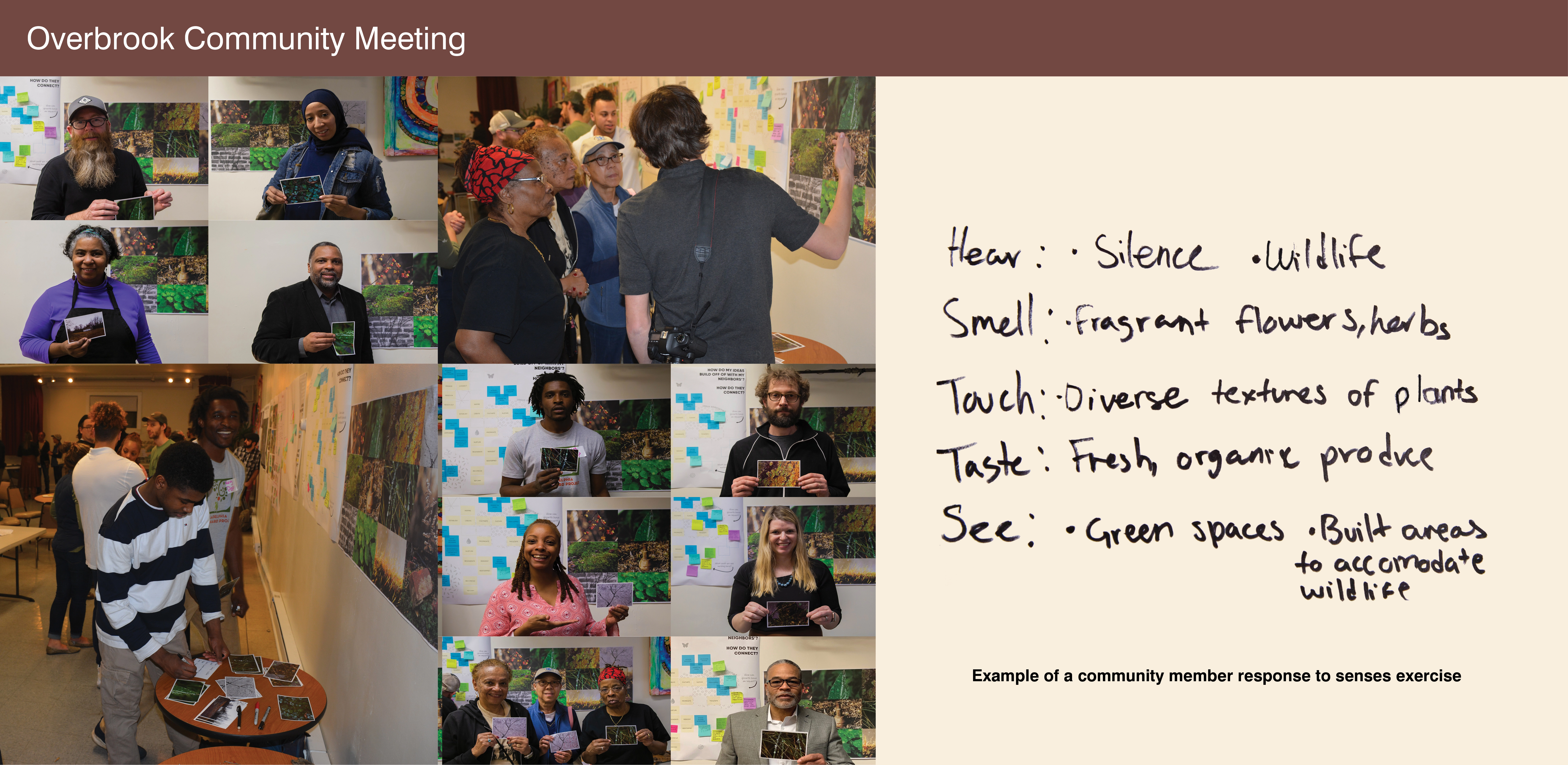 The community is the expert of their neighborhood and as such, we respect the wisdom of their voices. Our studio operated on the premise that the community was critical in the design process and so, with the help of the OEEC leadership, we held community meetings for input from the residents of Overbrook. The first meeting was structured around introductions and listening to initial design ideas from the community. Our job was not to tell them what we thought what was best, but instead to listen to everyone’s thoughts, concerns, and dreams. The second meeting, we presented some of our findings and research. The goal was for verification of the information as well as to prompt more discussion about their vision for the neighborhood and for the site design. Based on feedback, I was very focused on connecting residents to the site through sensual experiences and compiled a series of photographs from the site to see what discussion it might prompt. Overwhelmingly, people were able to articulate their desire for a connection to nature and all of its benefits. They spoke about hearing wildlife, smelling flowers and trees in bloom, touching diverse plants and textures, tasting fresh vegetables, and having greenspaces for humans and wildlife to co-exist. The community input gave direction to the design¬¬ -it was no longer just my design--it was our design.