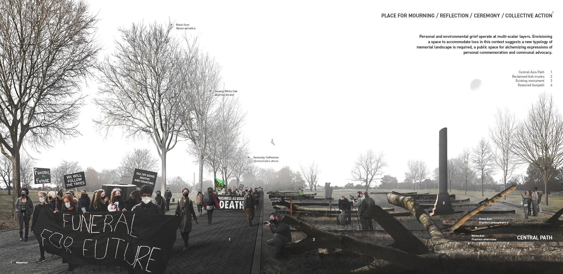 In the context of mass extinction, climate change and global pandemic, an environmentally ethical funeral practice fuses the loss of individual with the diffuse and existential nature of ecological loss. These layered forms of grief operate at multiple temporal scales and suggest a new typology of memorial landscape that engages natural cycles of a duration that exceeds the human life. To address these forms of grief, this funerary landscape offers biodiverse public spaces that meaningfully rejoin bodily death to broader natural cycles of ecological metamorphosis. Rituals of commemoration, management, and activism would alchemize to unexpected results when program of memorial, ecological preserve, and space for collective action merge. -