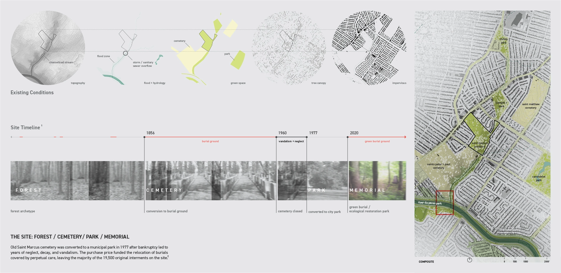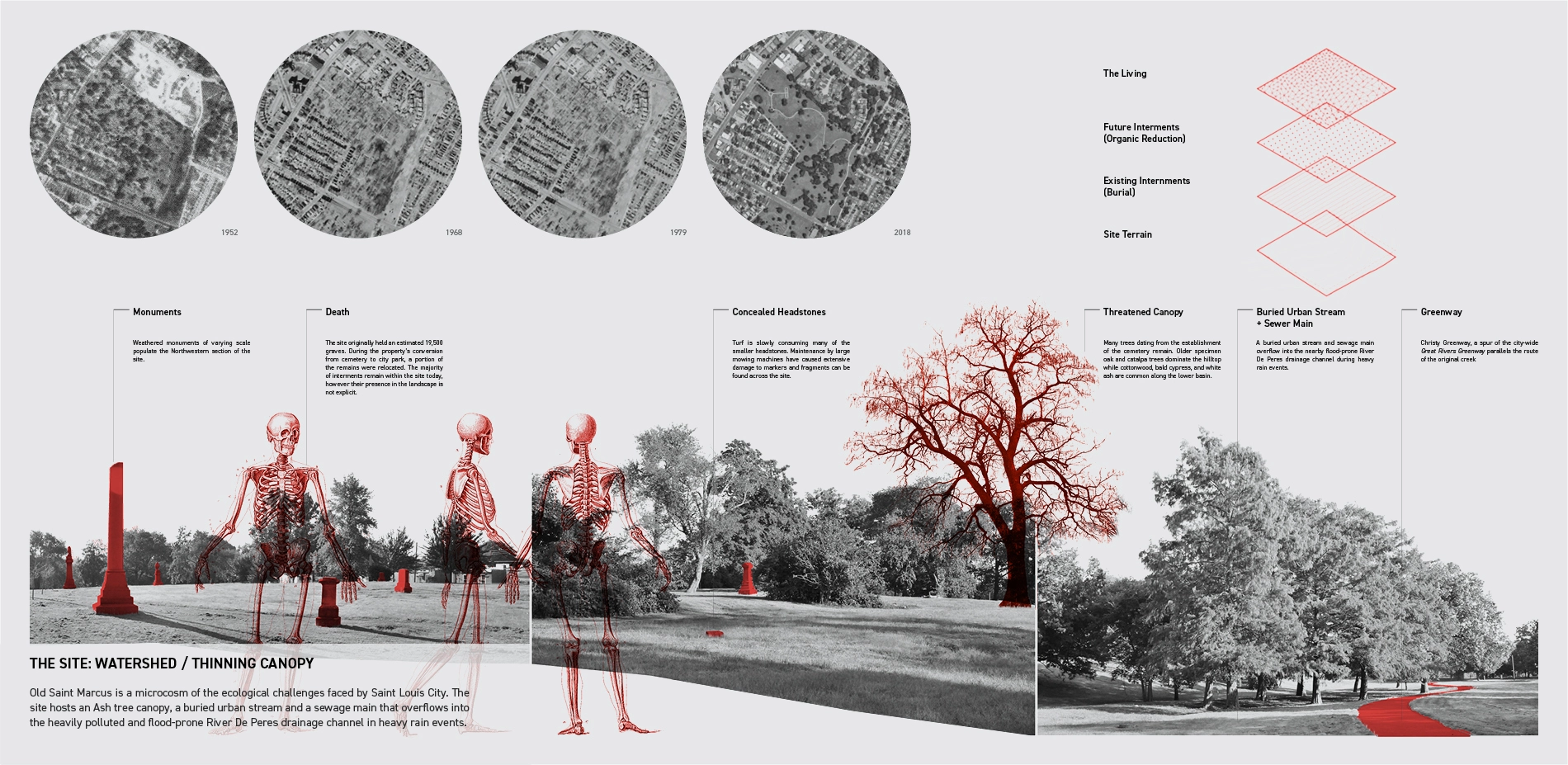 Saint Marcus was converted to a city park in 1977 after bankruptcy led to years of neglect, decay, and vandalism. The purchase funded relocation of burials under perpetual care, but left the majority of the original 19,500 interments on site. The original layout of cemetery paths and roads were removed and a curving path was installed to link the commercial Gravois Avenue to the North with the greenway and residential neighborhoods to the South. Large scale monuments and headstones remain on site though turf is slowly consuming many of the smaller markers. Saint Marcus hosts a microcosm of ecological challenges faced by the Saint Louis region. The most critical is the deterioration of the city’s urban tree canopy and an increasing frequency and severity of flood events.