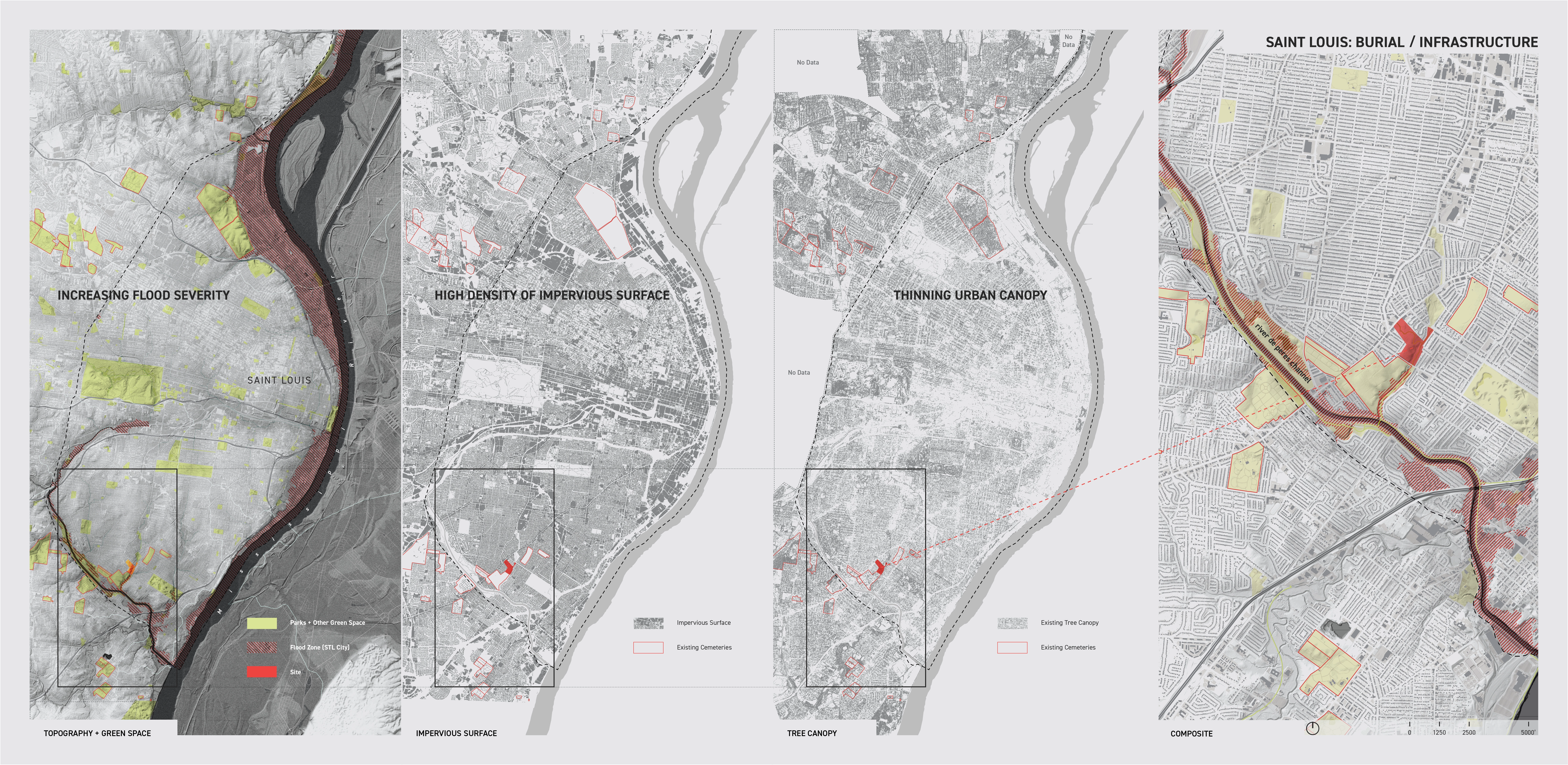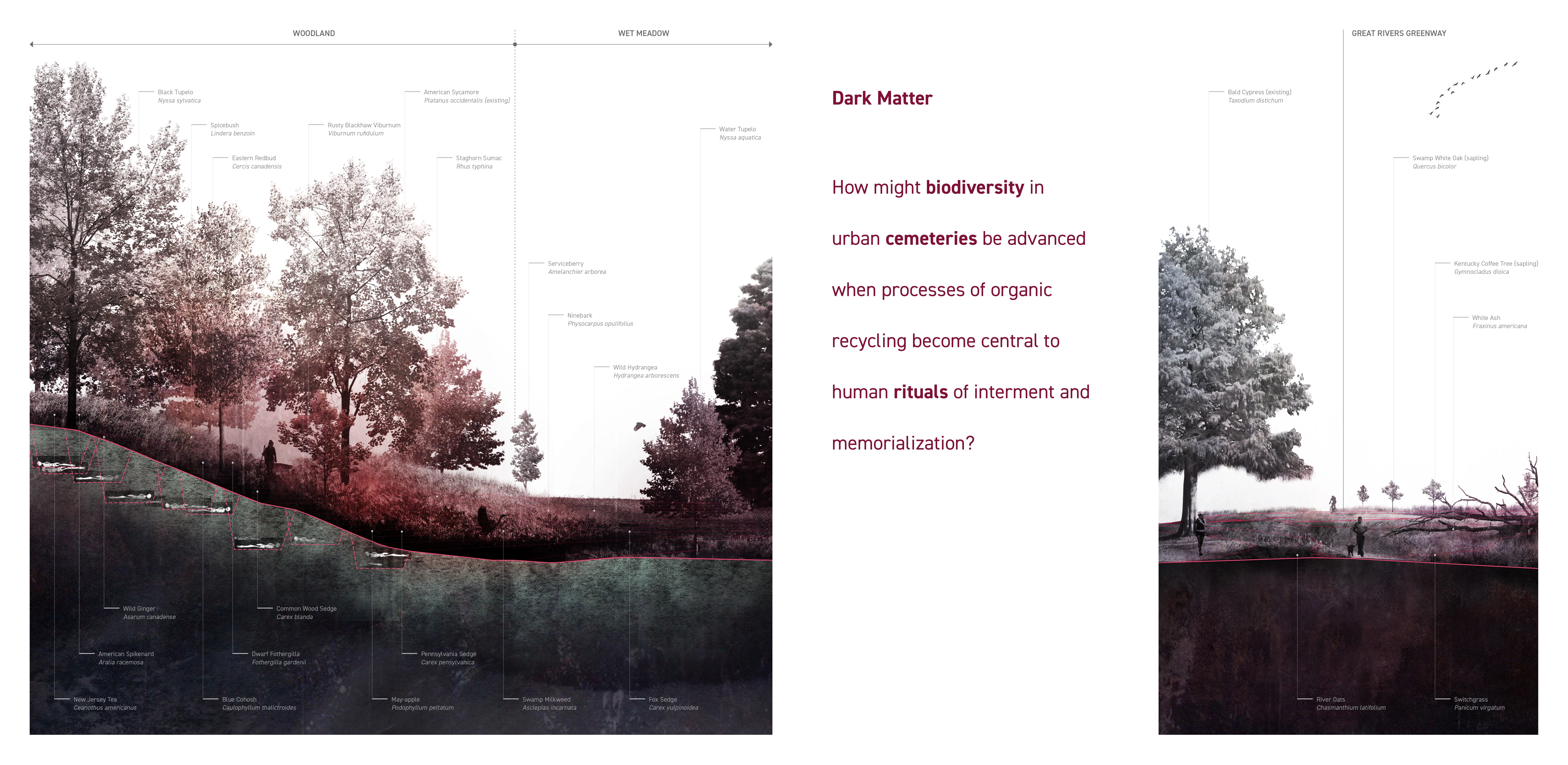 Dark Matter, a research by design thesis, investigates organic reduction (composting) of human remains as a means of promoting biological and cultural diversity in urban cemeteries. The project is a comprehensive application of technological advancements within the green funeral industry to a site in the Boulevard Heights neighborhood of Saint Louis, Missouri. While the project cites and assumes the physical realities of the method pioneered by Katrina Spade and her company Recompose, the proposal imagines an accompanying landscape that accommodates the material application, the subsequent adaptation of cultural practices and the concerns of the recently deceased who have opted for this environmentally ethical funeral process. The design intervention seeks to dovetail this new typology of memorial landscape into the complexities of an existing burial site, neighborhood and city.