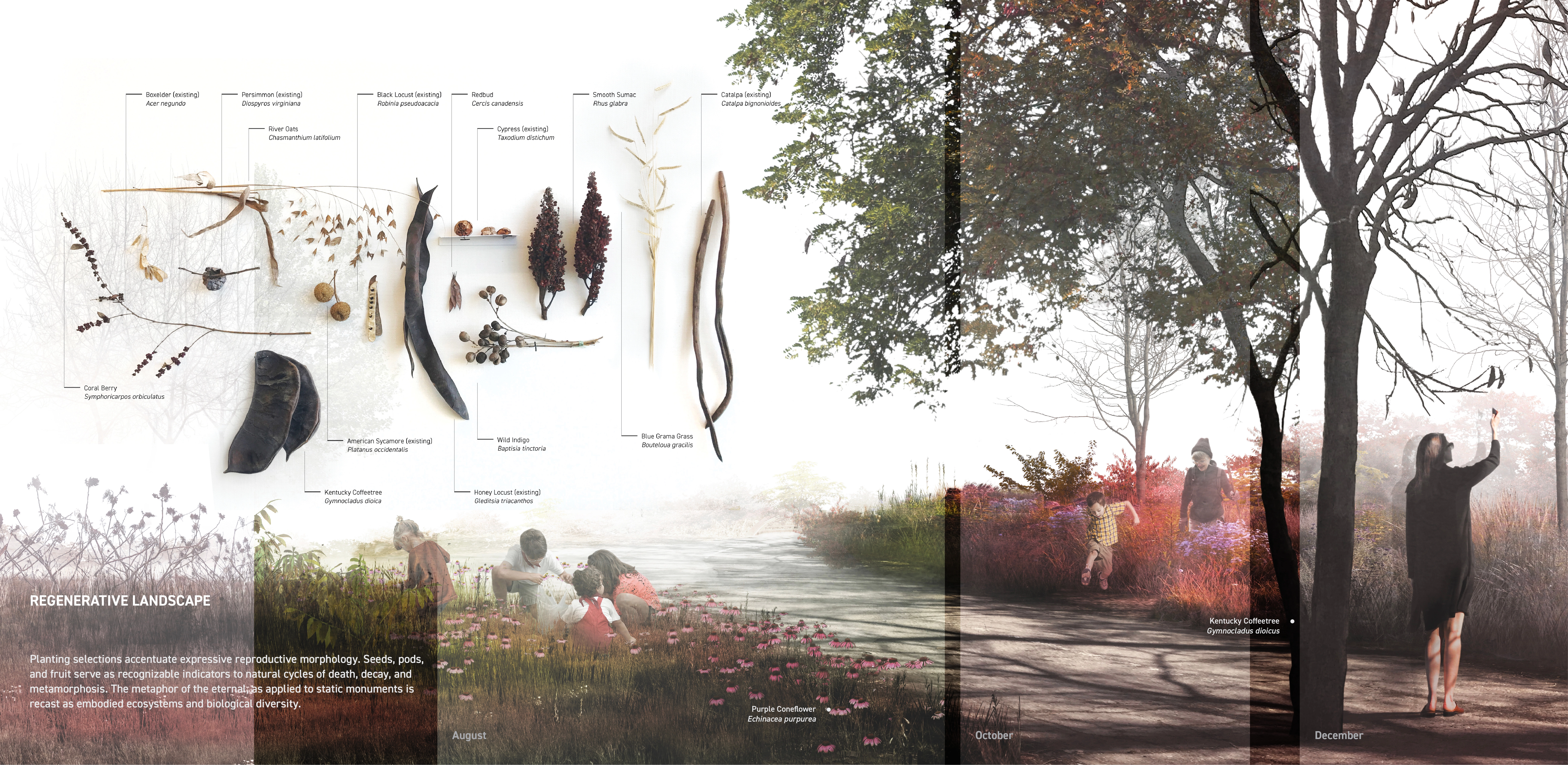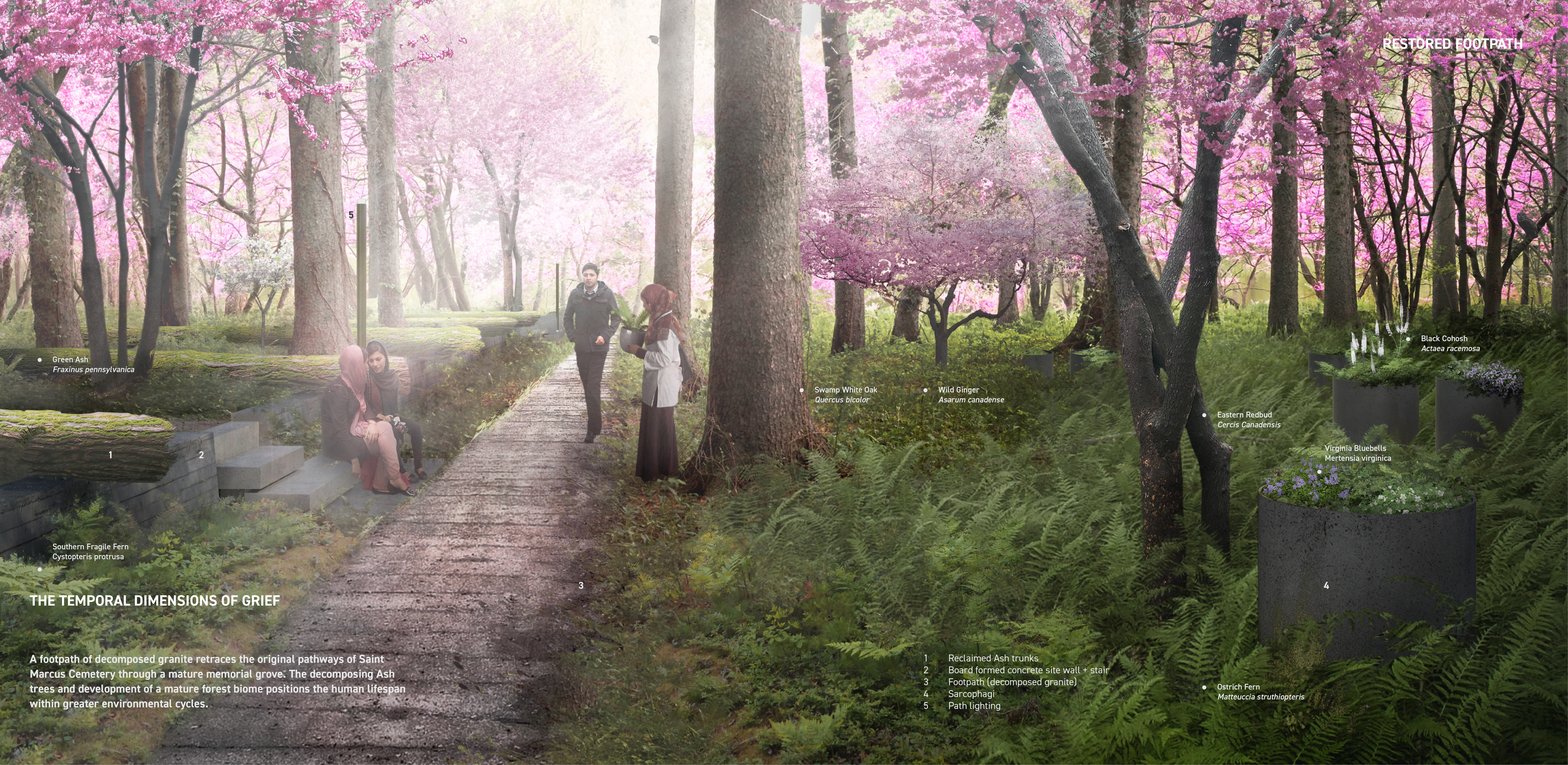 Katrina Simon has written that cemeteries “exist to be read” and that funerary landscapes “reflect as well as shape human experience, in all of its diversity and ambiguity, and what we know or believe about death will shape the landscape of death, as well as how we read or experience it.” The redesigned Saint Marcus Memorial Preserve provides a variety of loosely programmed spaces as settings for families and communities to adapt traditions and practices to designed ecosystems. A variety of ecological and spatial settings provide families the opportunity to choose where and how a loved one’s remains are committed to the earth and the systems that sustain it. The site’s designed plant communities accentuate expressive reproductive morphology. Seeds, pods, and fruit serve as recognizable indicators to natural cycles of birth, death, decay, and metamorphosis. Idiomatic rituals of interacting with landscape through planting, pruning, seasonal burning, seed collection and removal of invasive species take on greater meaning as acknowledgments of a loved one’s memory and last wishes. These unplanned ‘cultural overlays’ will deepen the experience of place and contribute to fostering biodiversity. -