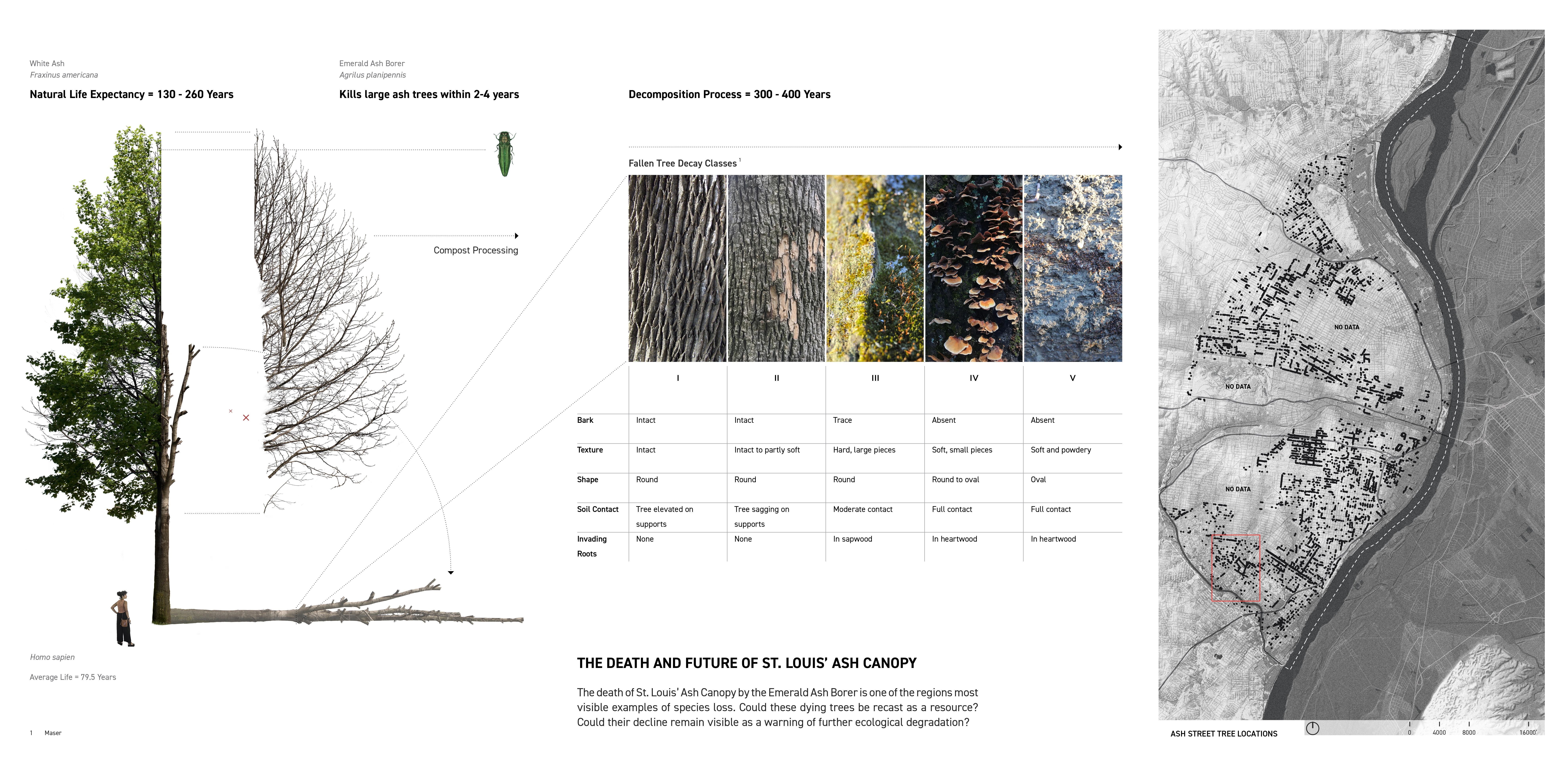 The death of Saint Louis’ Ash trees by the Emerald Ash Borer is one of the regions most visible examples of ecological loss. Fraxinus spp. are the most prolific street tree in the city, over 18% or approximately 15,000 Ash shade the city’s avenues and parks. Dark Matter refashions the city’s lost Ash canopy as a resource and catalyst for ecological and cultural change. Ash trunks removed from around the city will be strategically distributed across the site. Their concentrated presence will initially register as a visible tabulation of the city’s loss and a warning against future ecological catastrophe. Over the following 300-400 years, as the site transforms into a mature woodland ecosystem the decomposing trees will serve as a source of nutrients supporting micro-organism, fungal, plant and insect biodiversity.