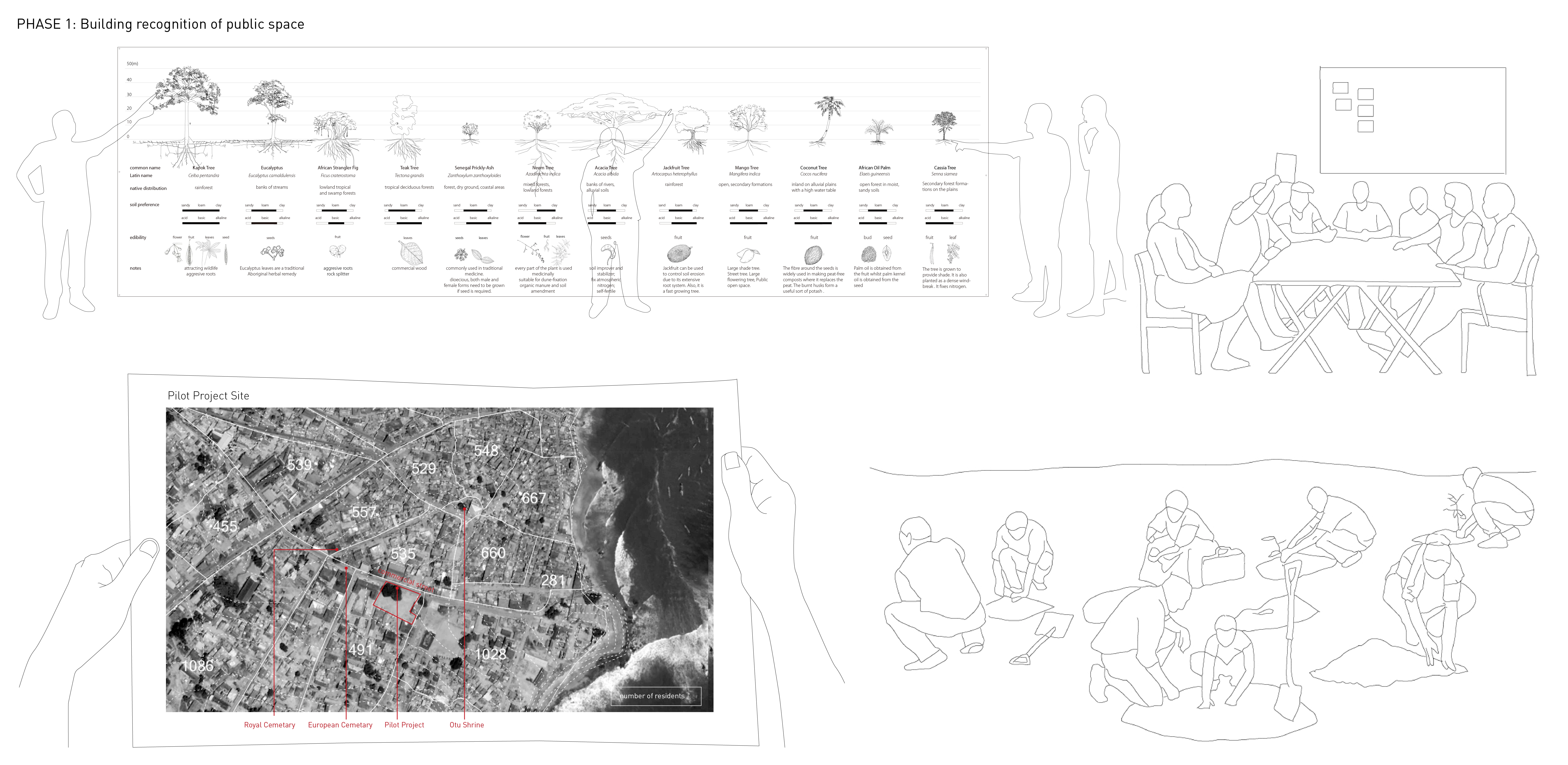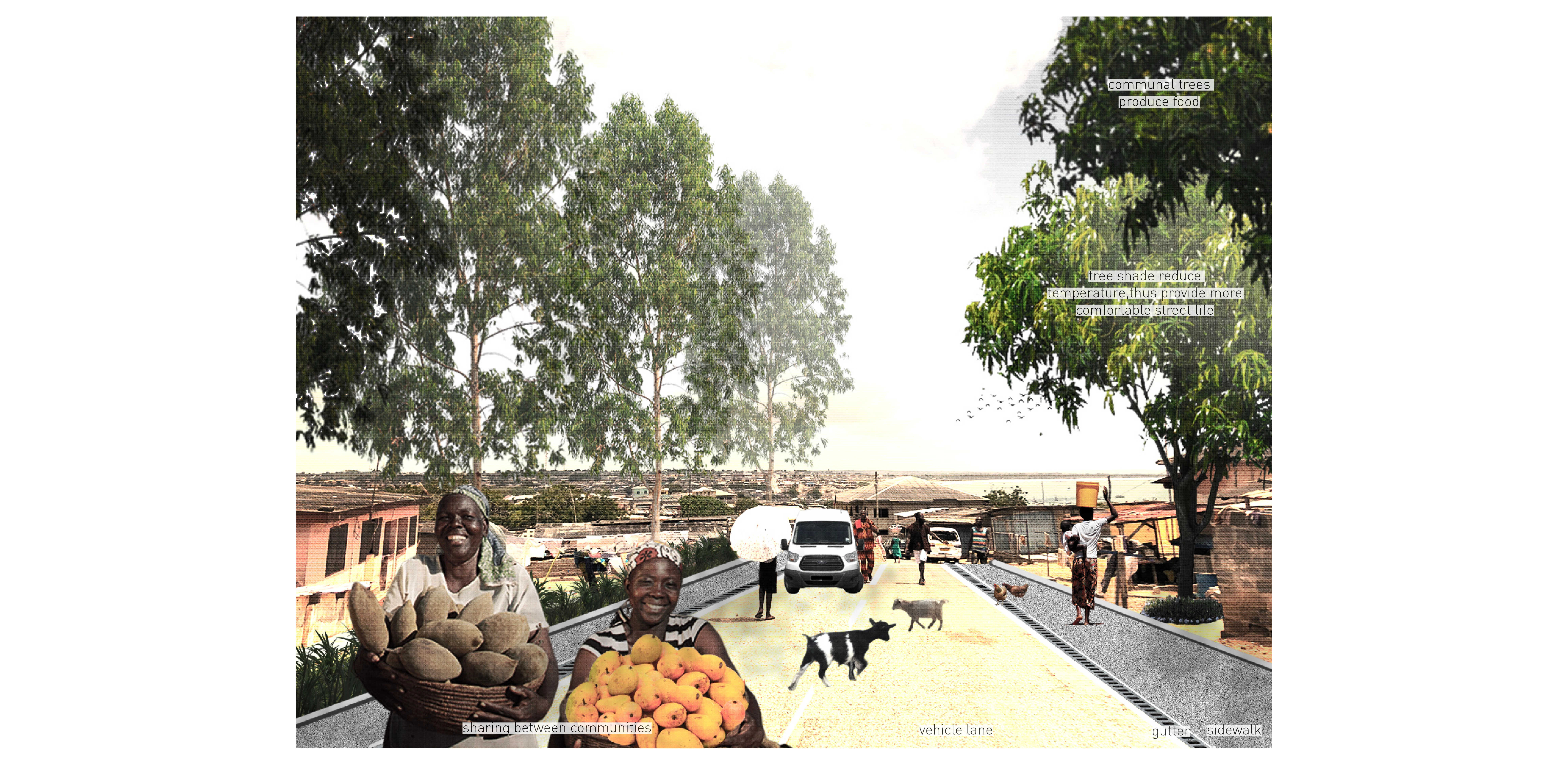 In Ghana trees indicate the existence of gathering space for many reasons, culturally and sensorially, therefore trees are considered as essential design elements to demarcate the site for public use.