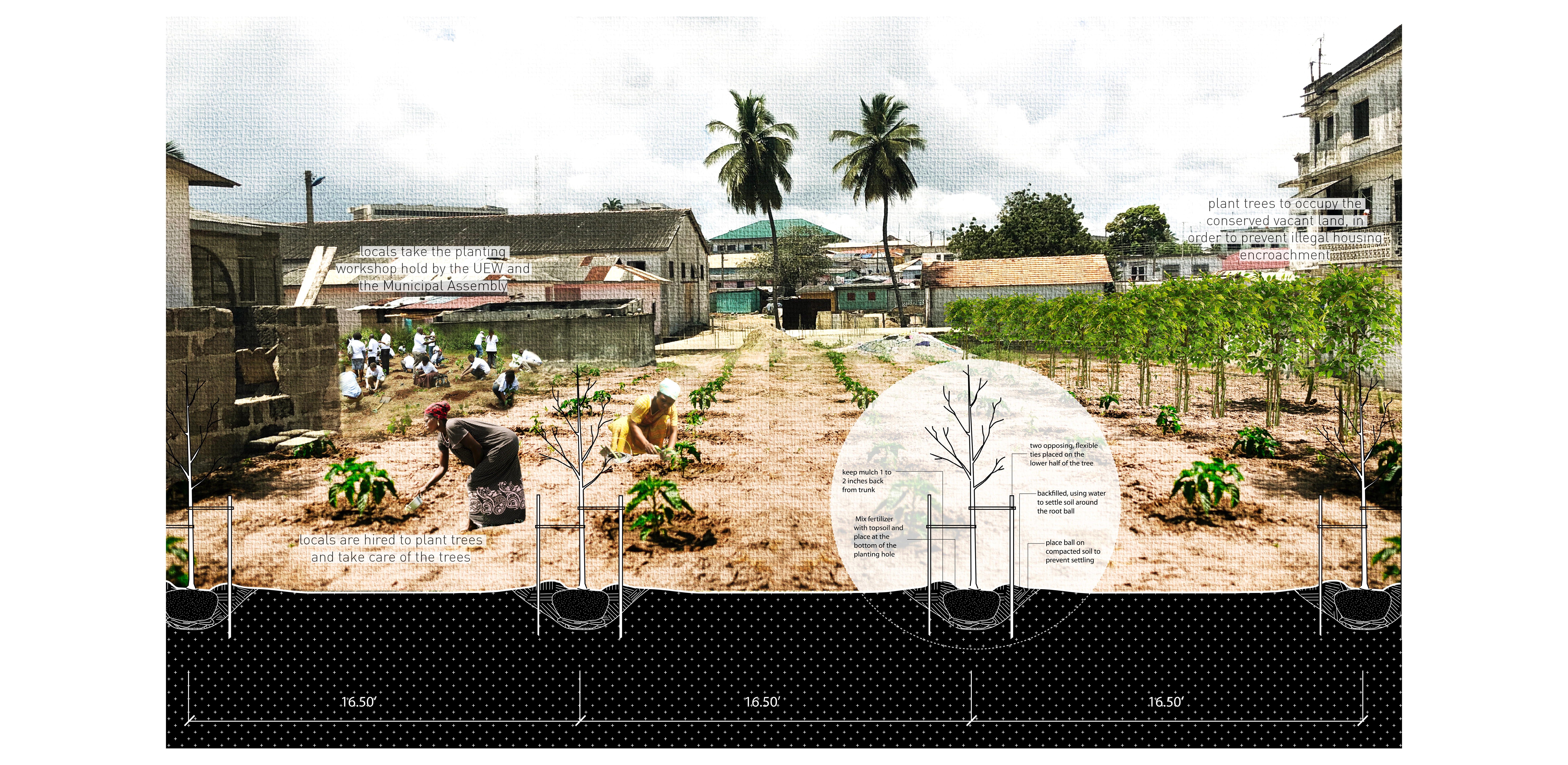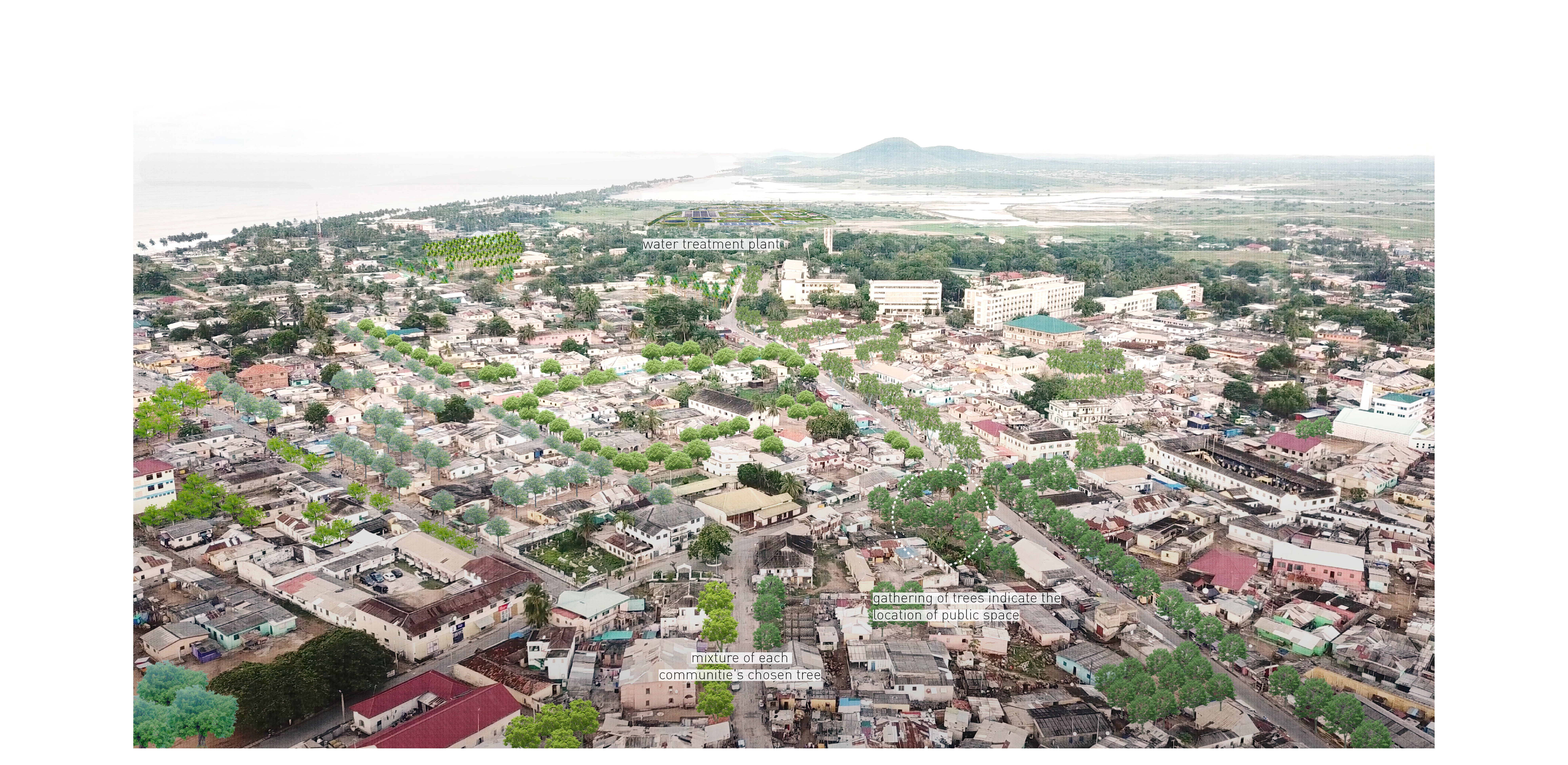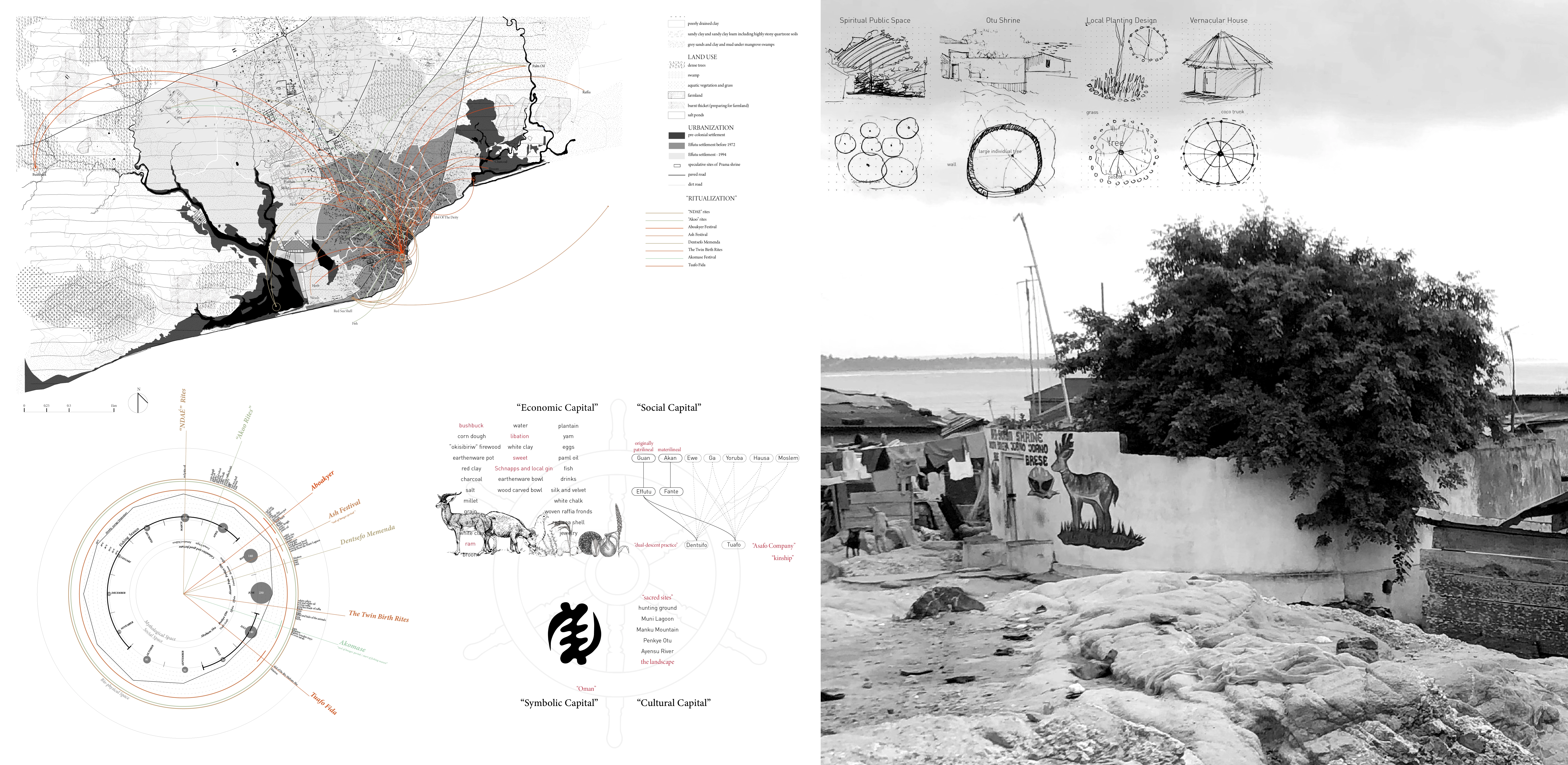Winneba, just like other coastal cities in West Africa, is suffering from enormous social and ecological challenges, such as inadequate infrastructure, water sanitation, food insecurity, environmental degradation, and social conflicts. This project initiates from understanding the socio-ecological role of Ghanaian public space. Research into community power in conservation, in particular, that of sacred groves, reveals its unique role in legitimizing social arrangements, addressing a sense of belonging, and reconcile differences. The success in maintaining these small eco-systems through local efforts can inform better policy-making.