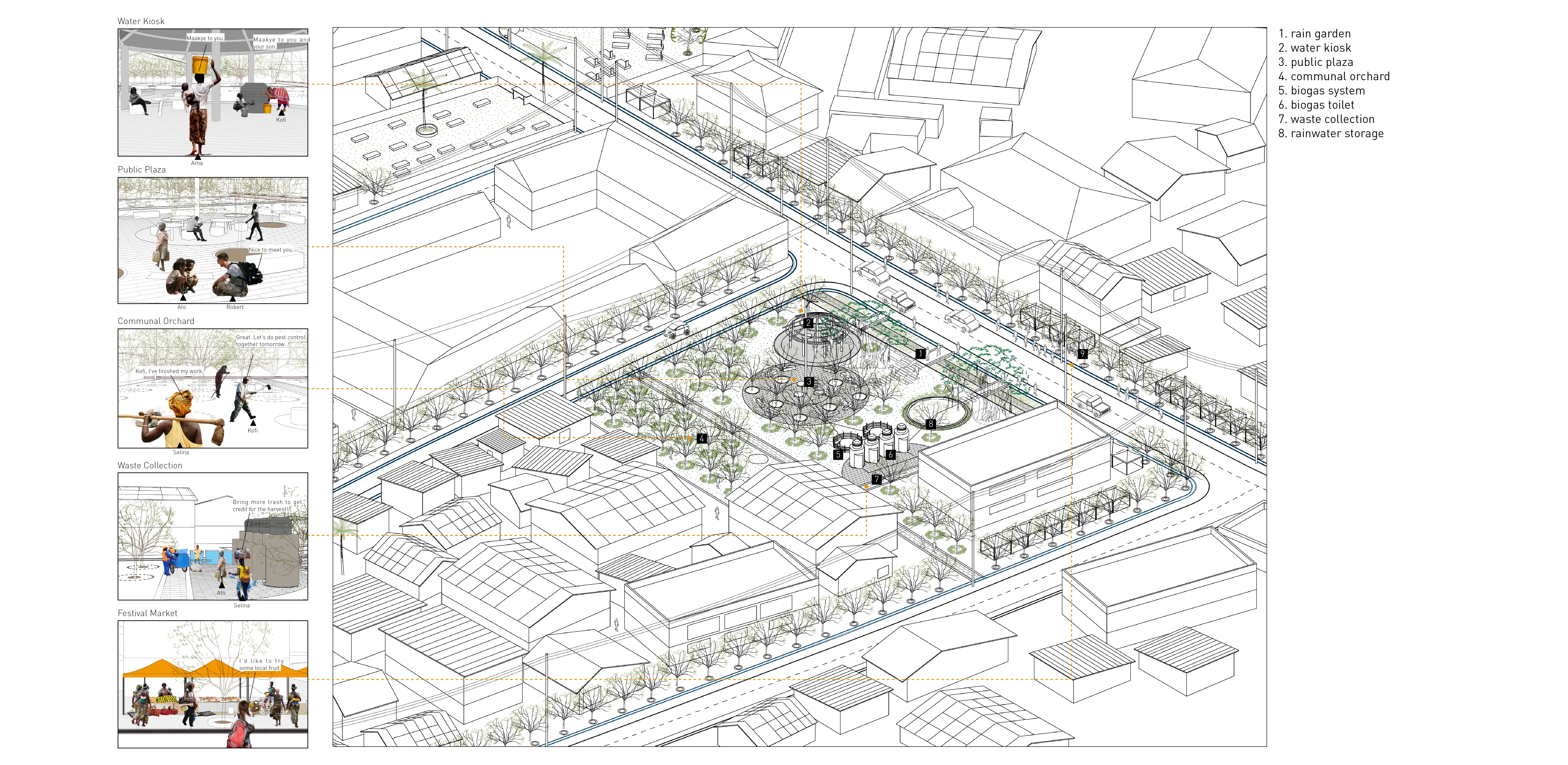 As an alternative to top-down government-led projects, this project calls for residents to build sanitation infrastructures for their own communities. The proposal integrates a gutter system, rain garden, water kiosks, orchard, communal biogas toilets, and waste collection system into its landscape design.