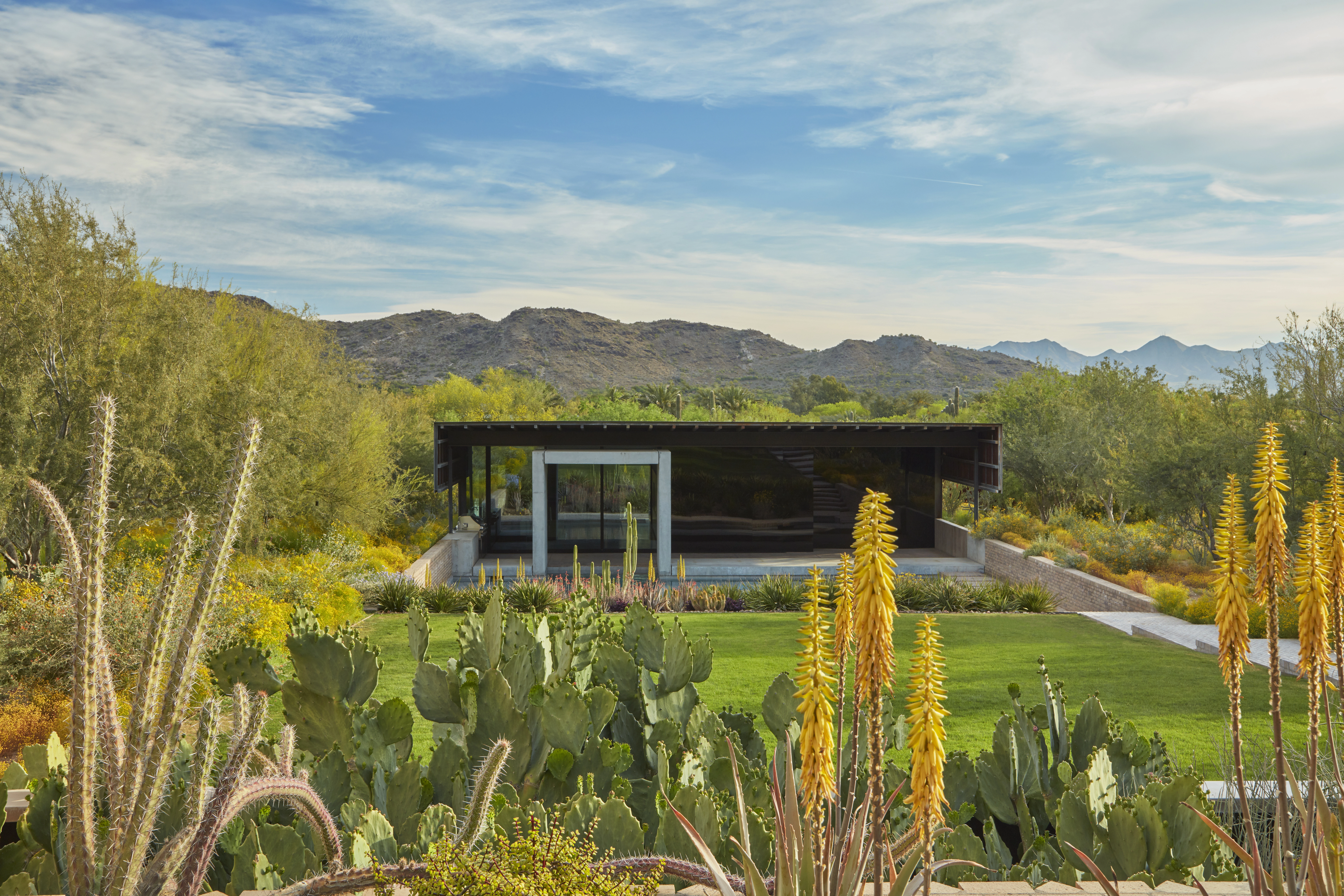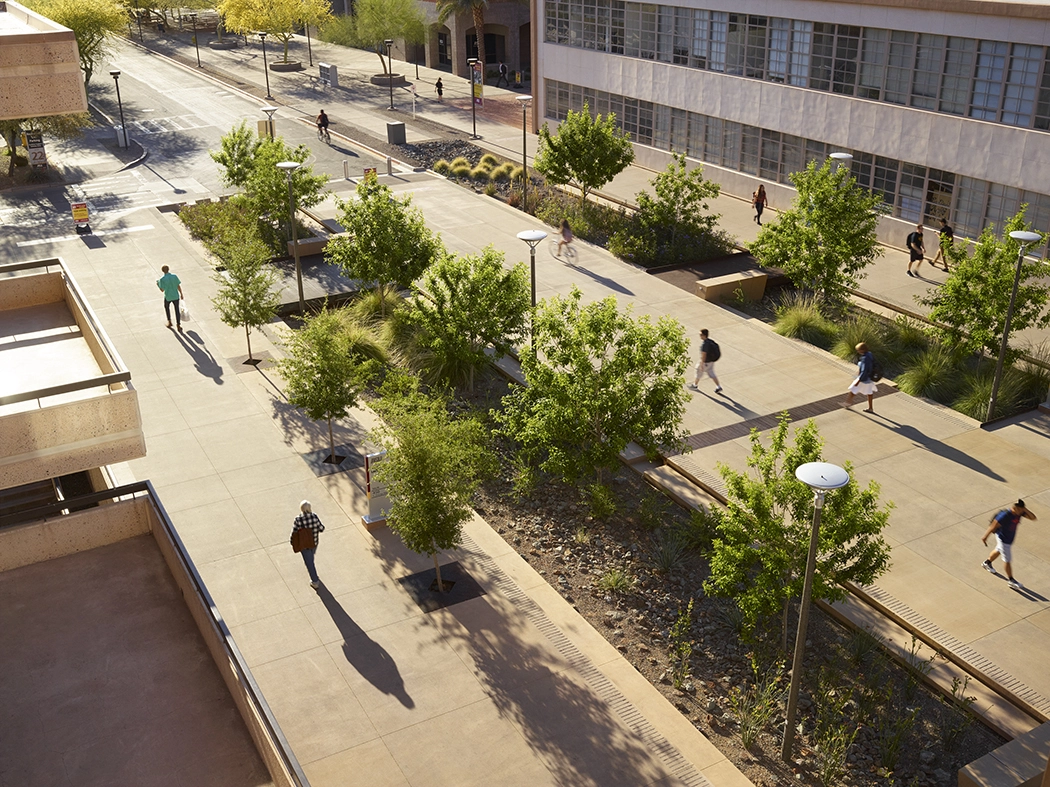Sustainability, a priority from the outset, led to early microclimate testing, the inclusion of locally sourced pollinator species, and abundant absorbent surfaces that manage stormwater runoff from entering the critical watershed. A complex planting palette, comprised of more than 70 native species, provides an ever-changing and abundant display of regional flora along meandering paths, within secluded nooks, and, most transformational, upon vertical architectural facades. Multidisciplinary collaboration informed design decisions to ensure habitable spaces were tempered from the region’s intense sunlight and high-speed winds.