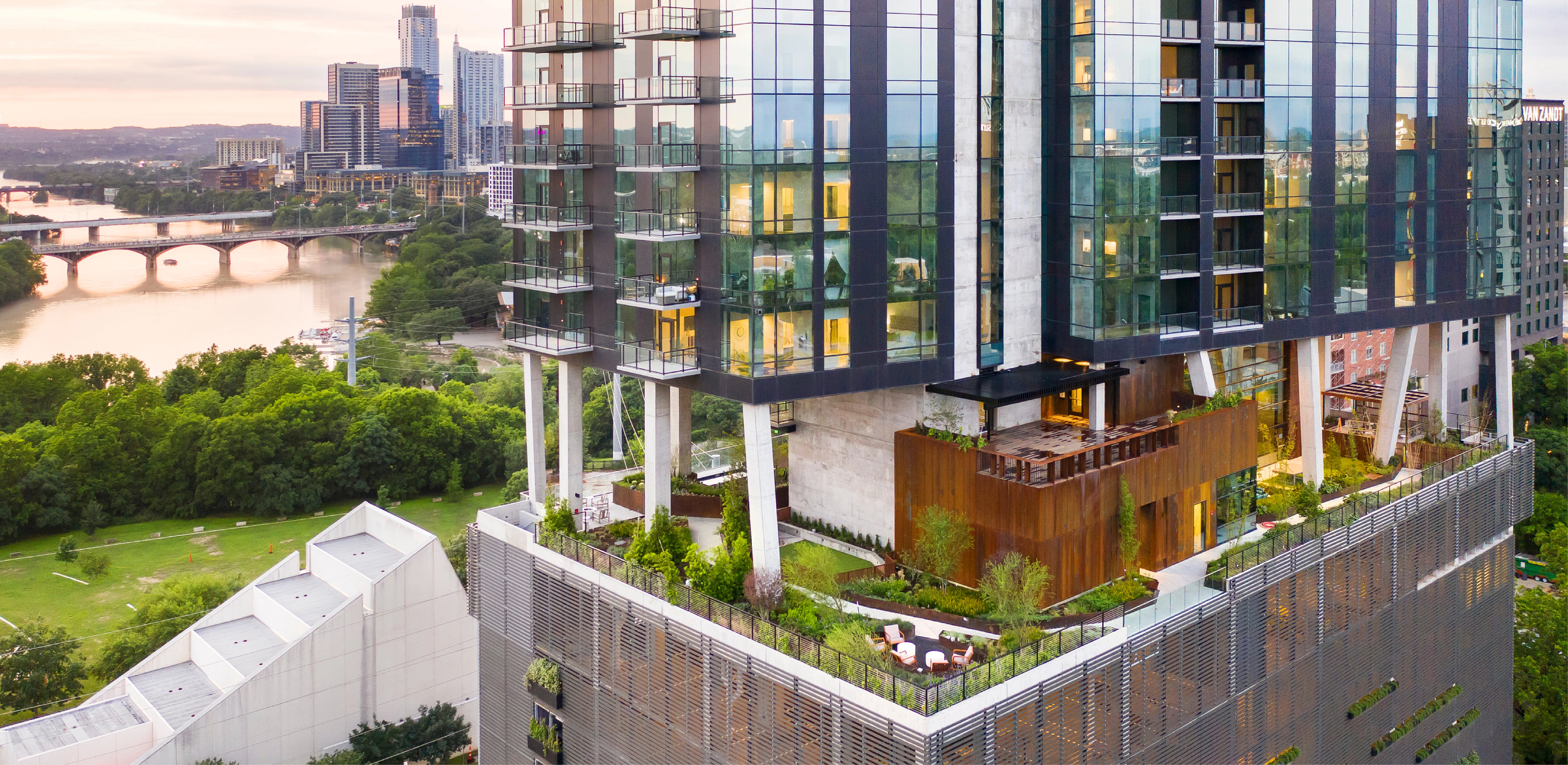 Soaring 100 feet above the shoreline of Austin’s Lady Bird Lake, 70 Rainey redefines multifamily urban living in a city experiencing rapidly changing technology, culture and innovation. Its Sky Garden, a verdant refuge devoted to recreation, leisure and contemplation, is defined by the diverse and native ecologies of the Texas Hill Country that weave together a sensorial outdoor living experience.