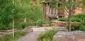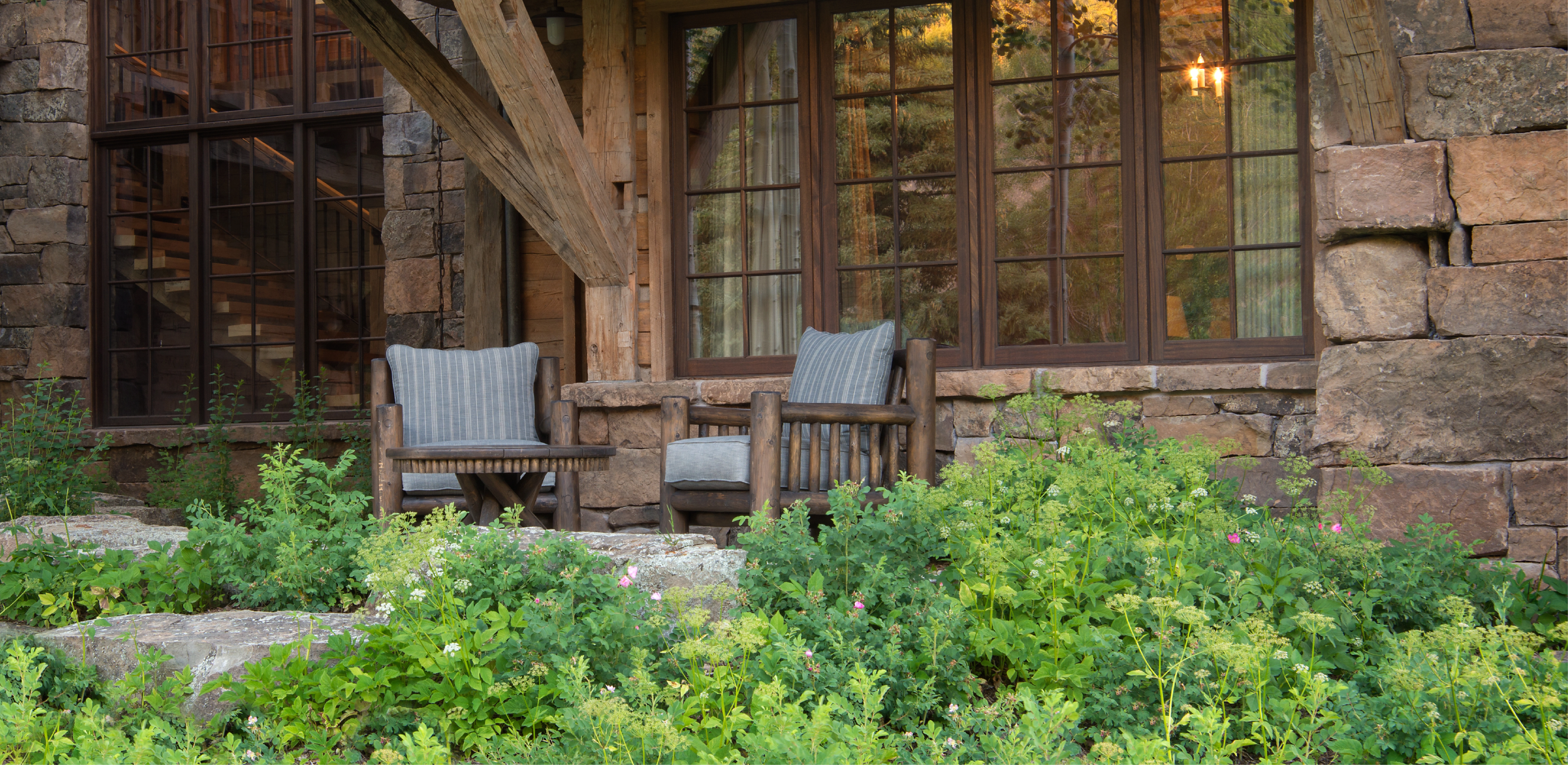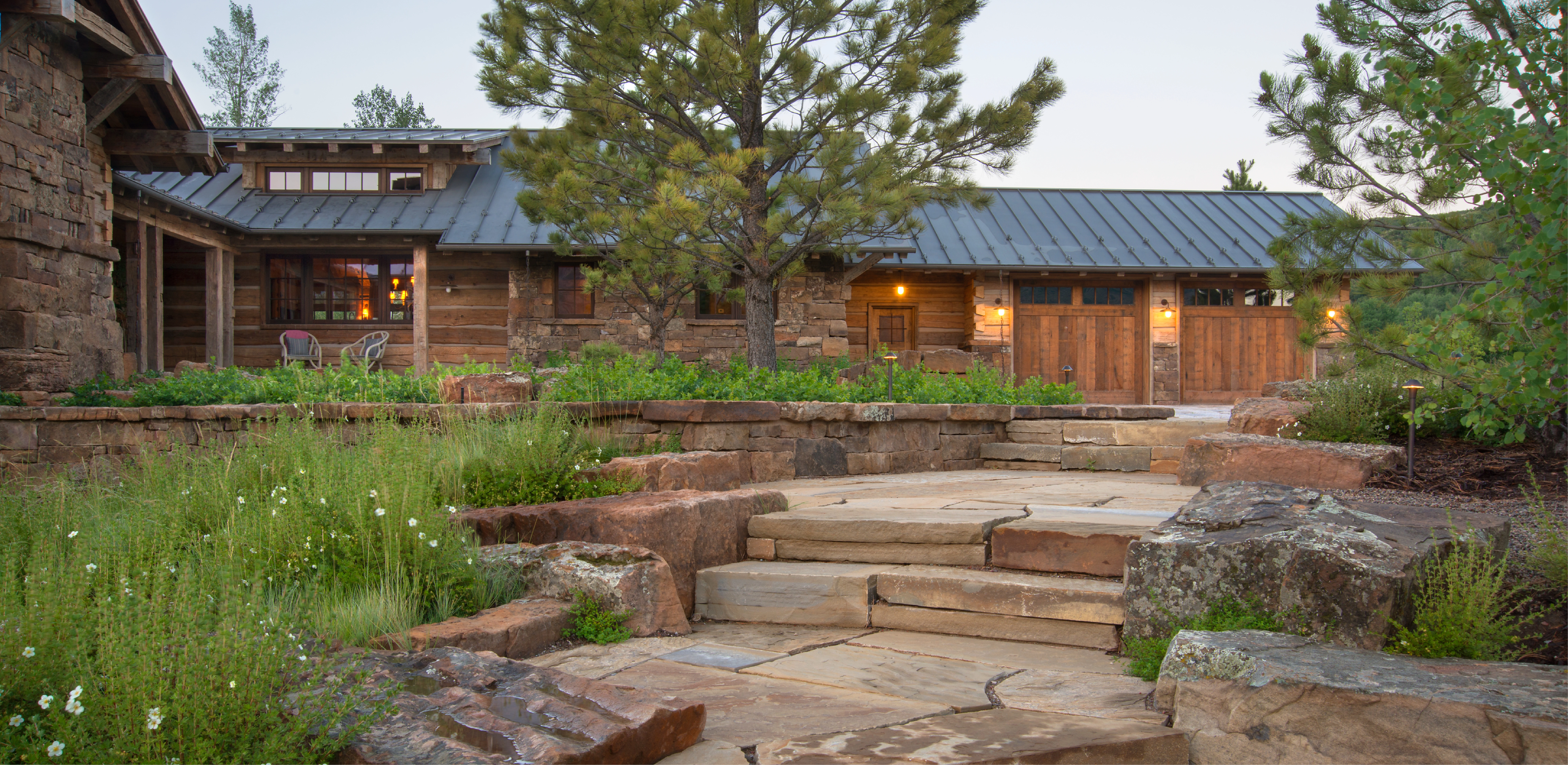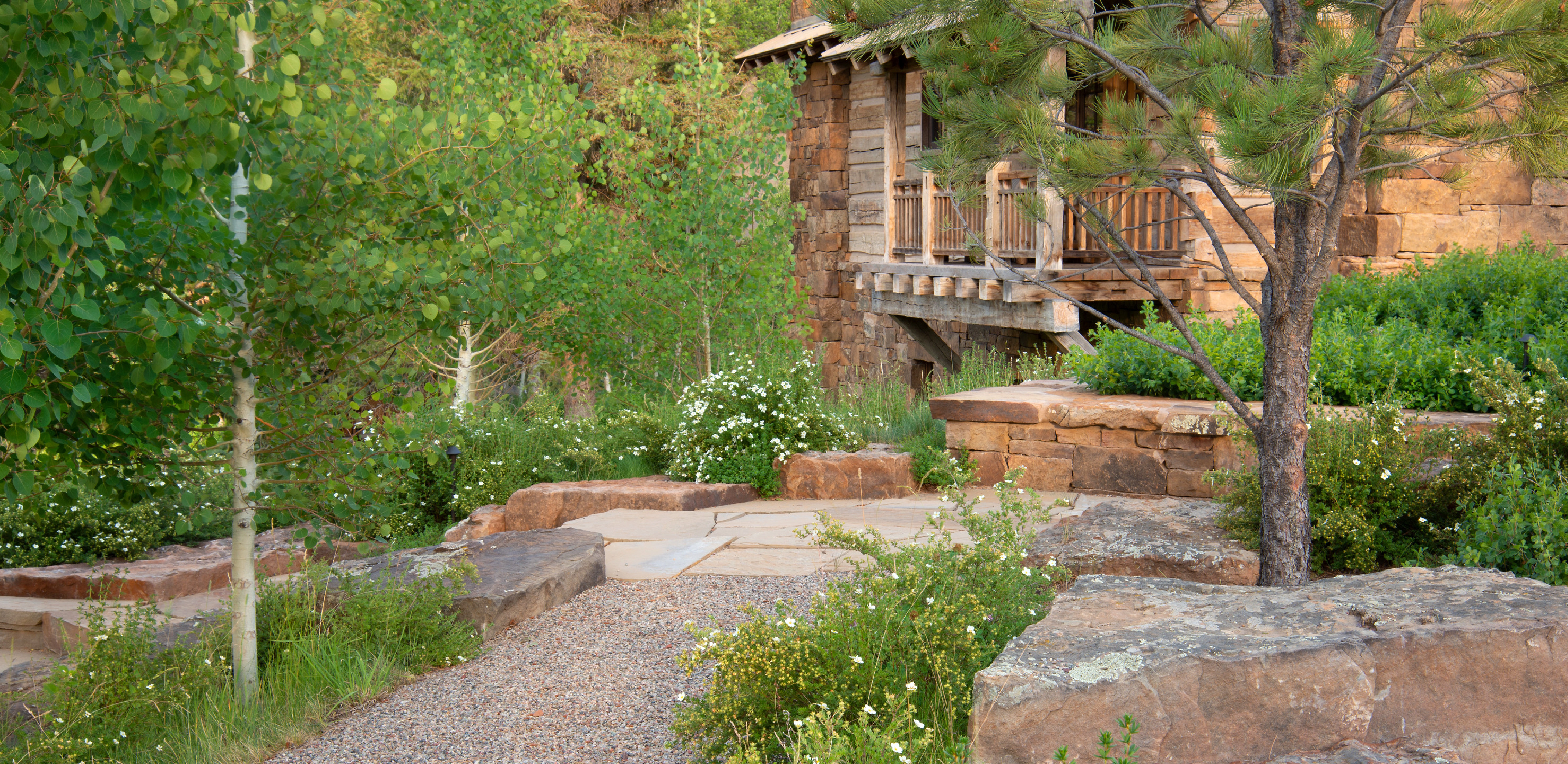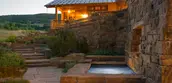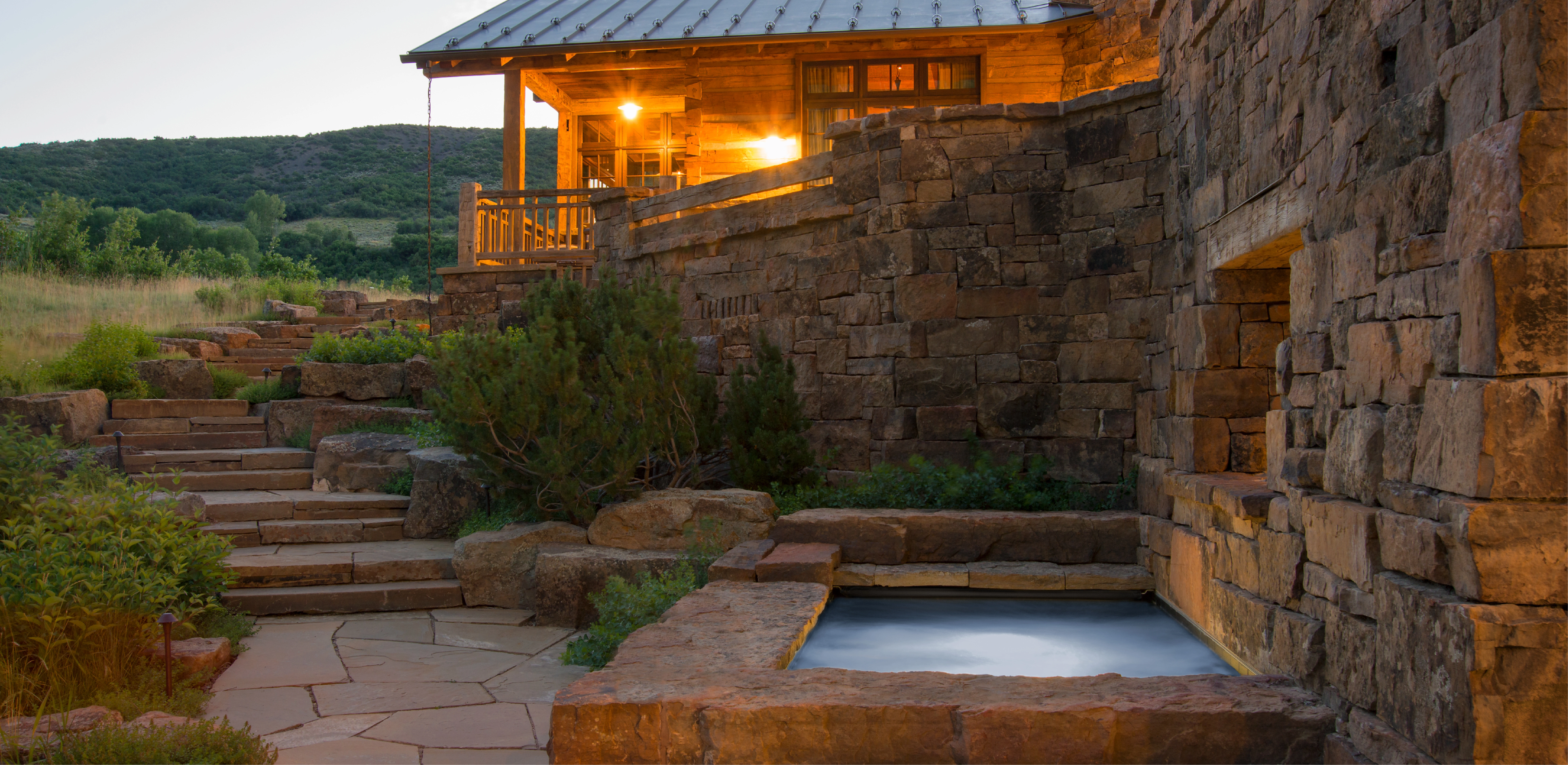 From the outset, the landscape architect emphasized restraint in material selection, color, and massing of any built structures. Regionally-sourced native materials, including reclaimed timber and lichen-covered stone, create a cohesive palette for architectural and landscape elements able to withstand the harsh mountain climate. During construction, the landscape architect developed subtle masonry details with the stone masons to communicate an authentic spirit of permanence including blending materials to achieve a graduated and organic appearance, and varying thicknesses on stair transitions. The result is a series of hand-built stone walls — a familiar element in Western ranch compounds — stairways, and outdoor gathering spaces that appear to disappear into the subtle tones and textures of the existing landscape. Tucked in a sheltered cove and bound by a trio of sandstone beams, a soaking tub rests beneath the branches of a twisted pine.