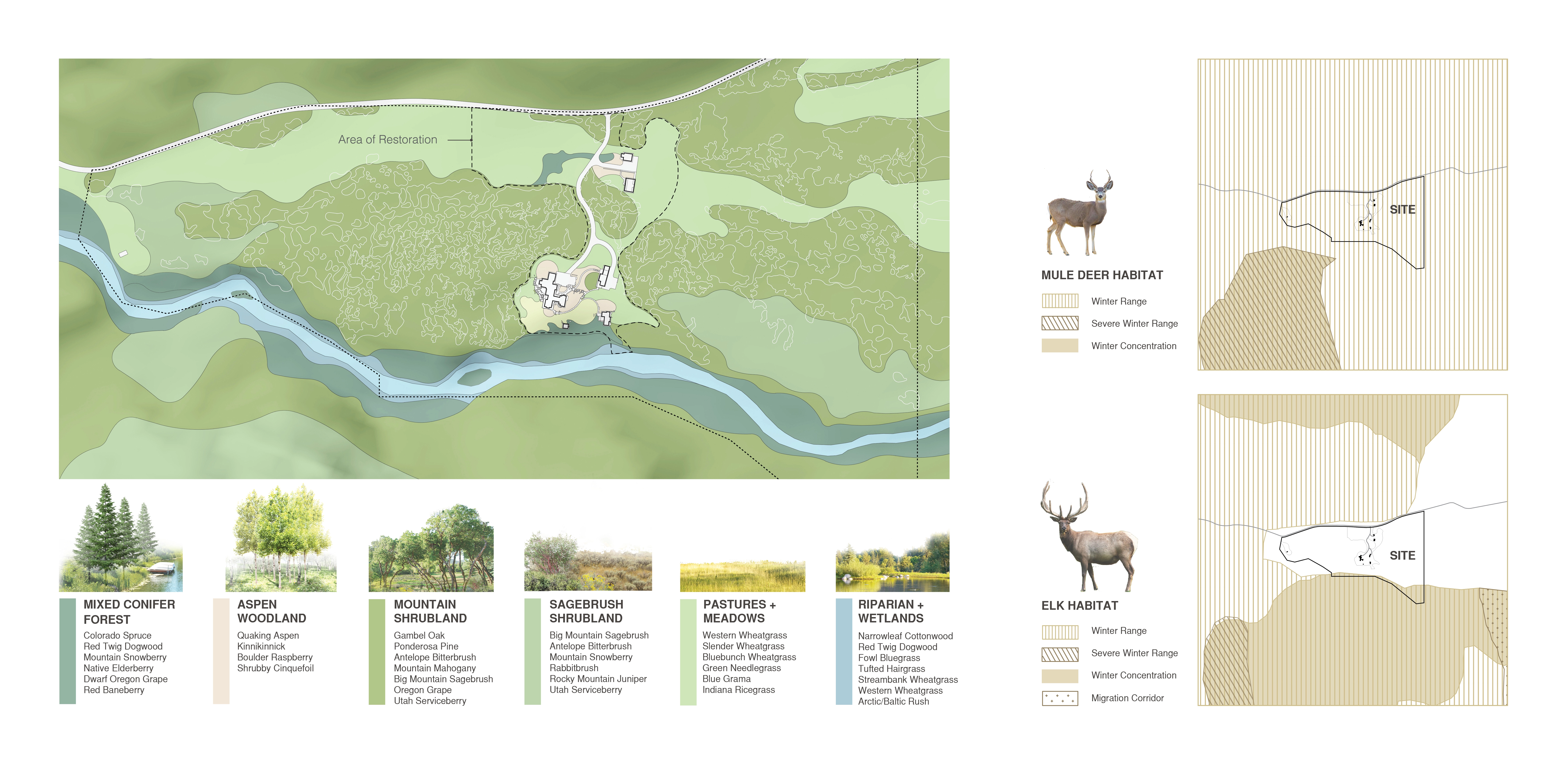 Restoration began with an analysis of regional and site-specific environmental conditions, including a detailed study of predominant plant communities, species composition, and density. At 7,700’ in elevation, the ranch is characterized by oak-mountain shrublands, a transitional ecosystem of the Southern Rockies Ecoregion defined by native upland vegetation consisting primarily of a mosaic of Gambel oak, serviceberry and sagebrush that provides critical wildlife habitat. Gambel oak is a slow-growing, drought-tolerant hardwood which offers critical nutritional value and shelter to indigenous wildlife, but absent of proper maintenance, turns into highly flammable fuel for wildfires. Interspersed within this zone are patches of sagebrush shrublands. Along the creek, mixed-conifer forests and riparian areas denote the presence of water. The remaining land consists of mountain meadows and pastureland. An ecological assessment identified disturbance to upland plant communities as a result of decades of agricultural activity and livestock grazing. Understanding these distinct ecologies – their conditions and relationships to each other – not only guided species recommendations and their spatial organization but ensured long-term performance to support biodiversity.