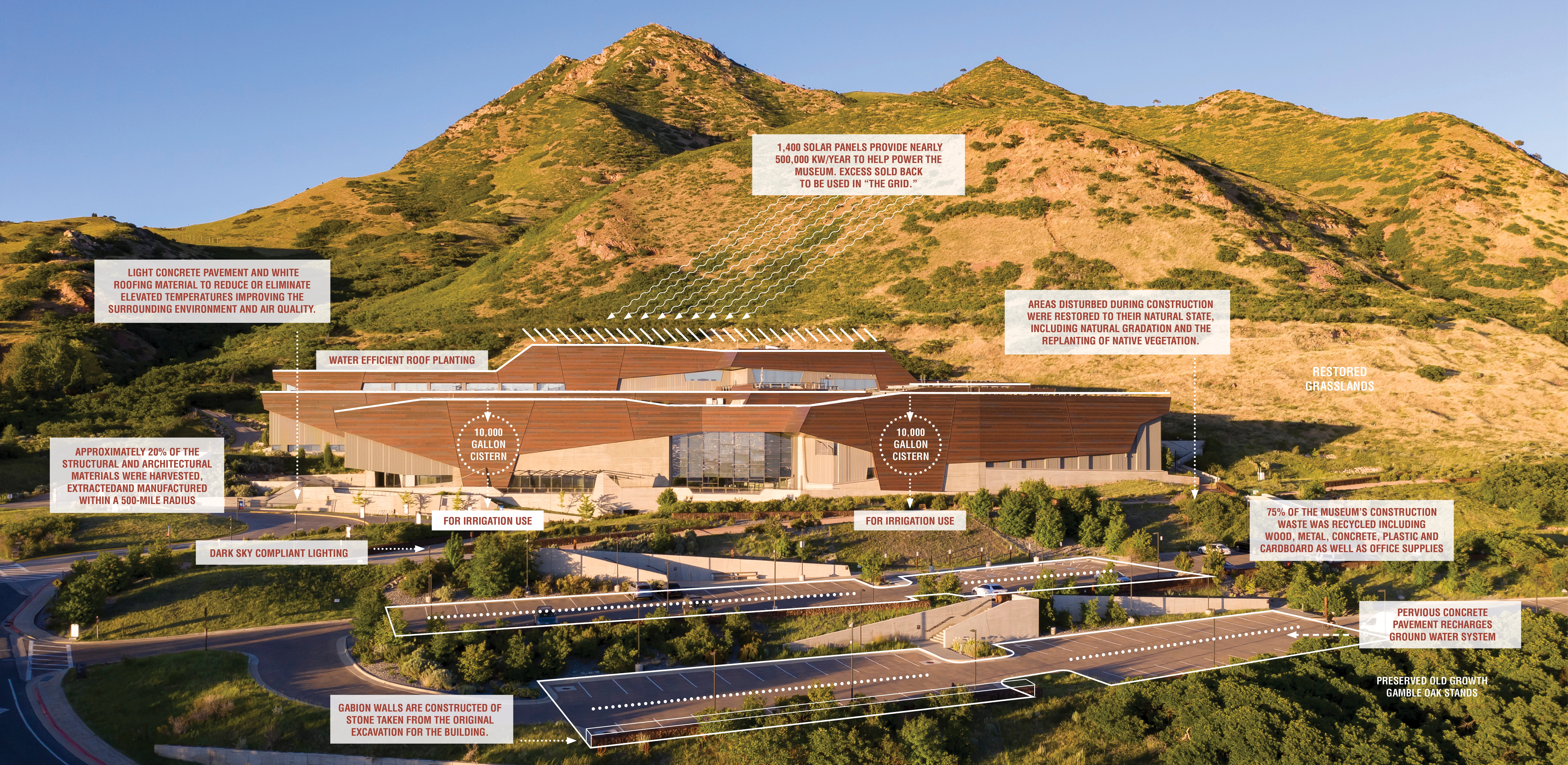 -- Responsible energy strategies reduce the site’s consumptive footprint. The Museum houses one of Utah’s largest solar panel installations; the use of light concrete pavement and green roofs lowers temperatures, improving the surrounding environment and air quality; and, dark sky-compliant lighting minimizes light pollution impacts on nearby sensitive habitats