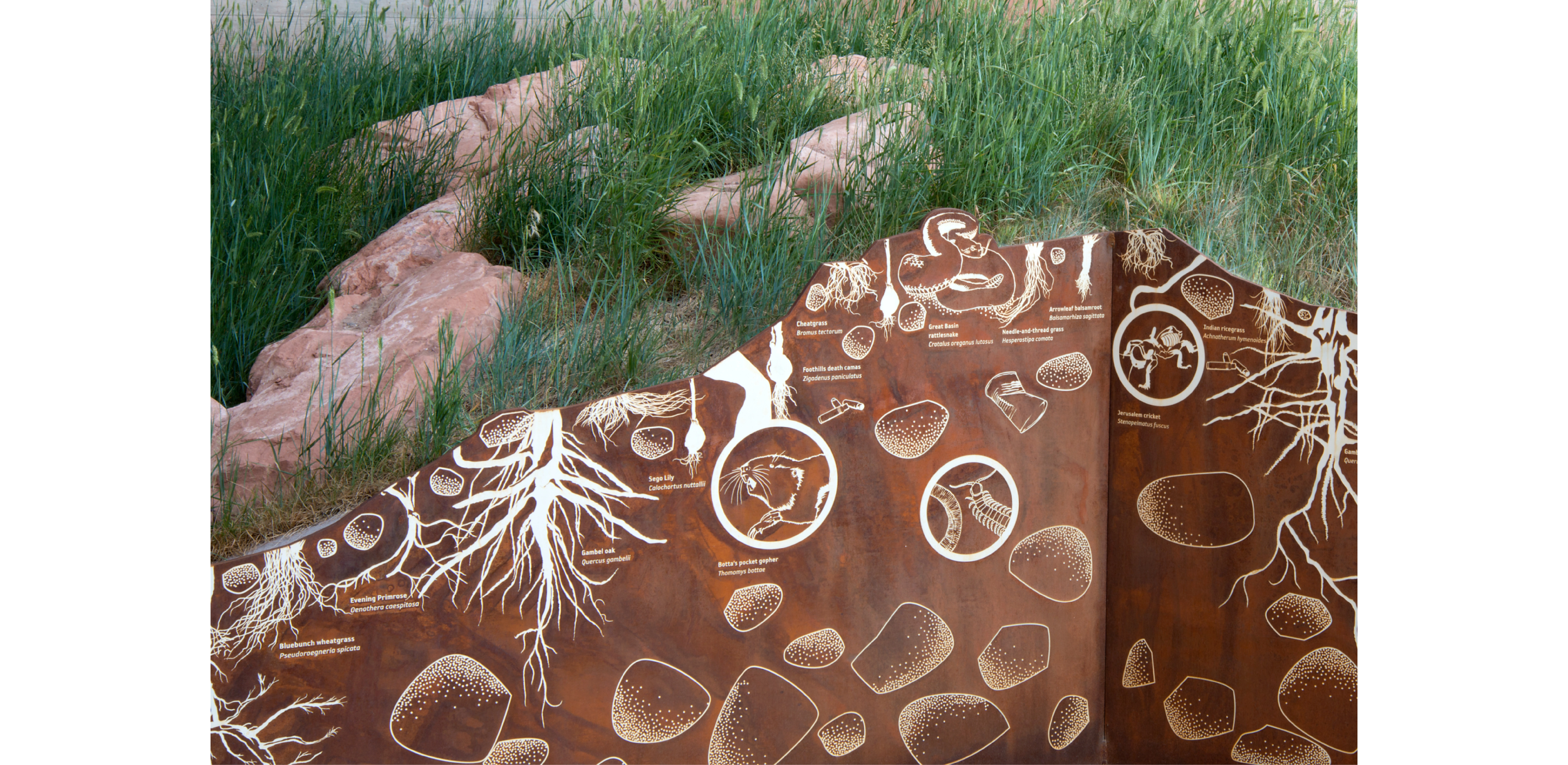 -- Regionally sourced materials invest in regional and local economies, reduce carbon footprint, and deepen the story of place. Gabion retaining walls are constructed of crushed red sandstone stockpiled during excavation; material color and form blends with the geological features of the Wasatch Mountains. To restore biological diversity, the team gathered seeds from the site prior to disturbance, later reintroducing them in a plant matrix that included additional species found on adjacent lands.
