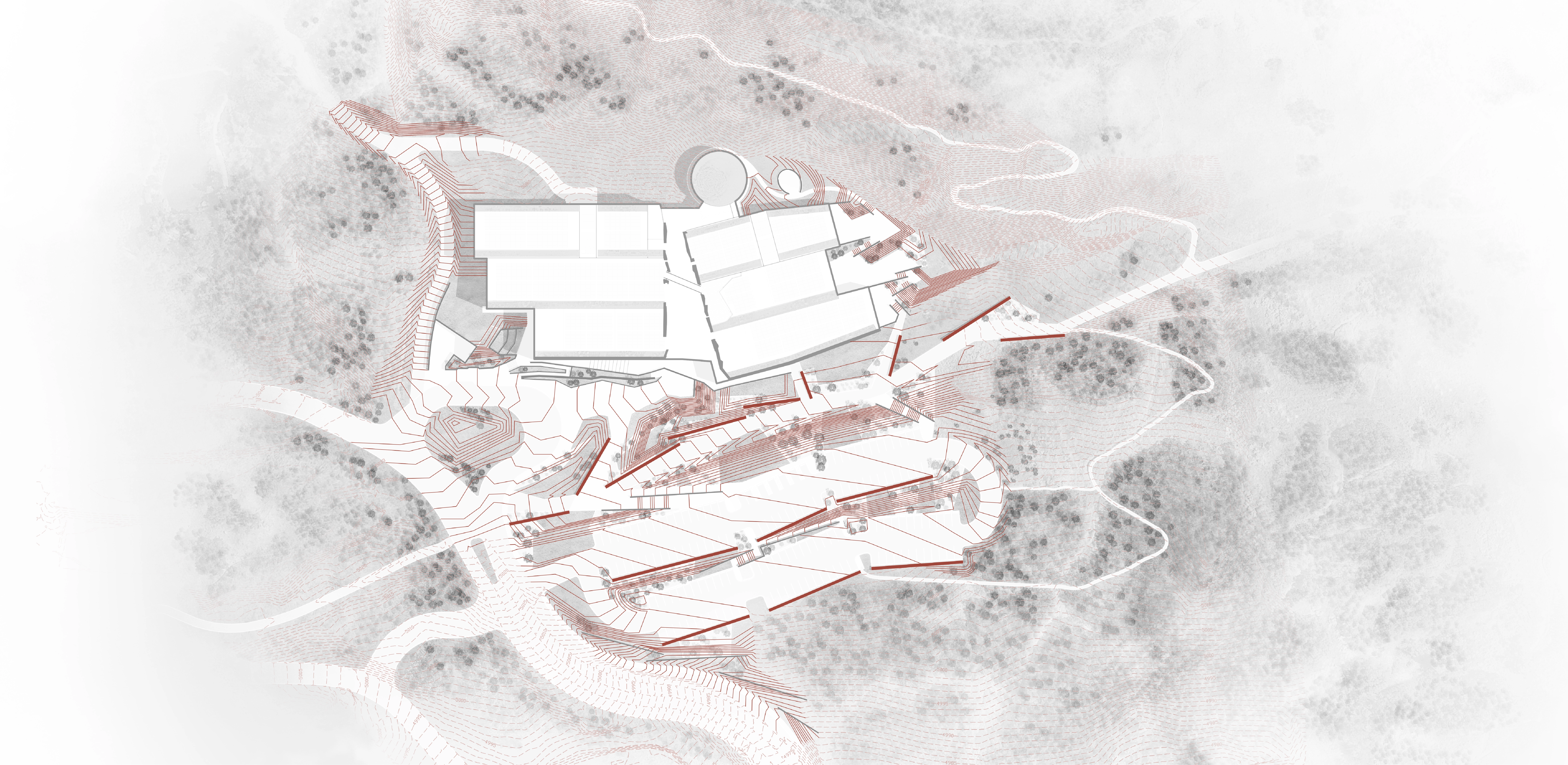 The landscape architecture successfully blurs the boundaries between built and natural environment through the development of a series of constructed terraces that step up the existing foothill contours with minimal disruption to the adjacent landscape. Accomplished through a series of digital terrain modeling exercises, the landscape architect seamlessly integrated the existing landscape and museum property, concentrating dramatically altered landforms near the building. Further away, the landform relaxes as it blends into existing contours and native plant masses. In determining how to shape the land in an abstract manner that also meets the needs of its users, the landscape architect successfully demonstrates how the design embraces its context.