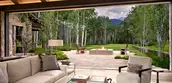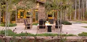 Inherent in the design is the cultivation of a crisply defined indoor-outdoor living experience for family and friends. Gracious, oversized doors cleverly retract into walls, granting a transparent and effective connection between indoor and outdoor entertainment opportunities. A stone firepit, sited under a dappled canopy of aspen trees, engages fleeting views of Hayden Peak and serves as a centerpiece for evening gatherings.