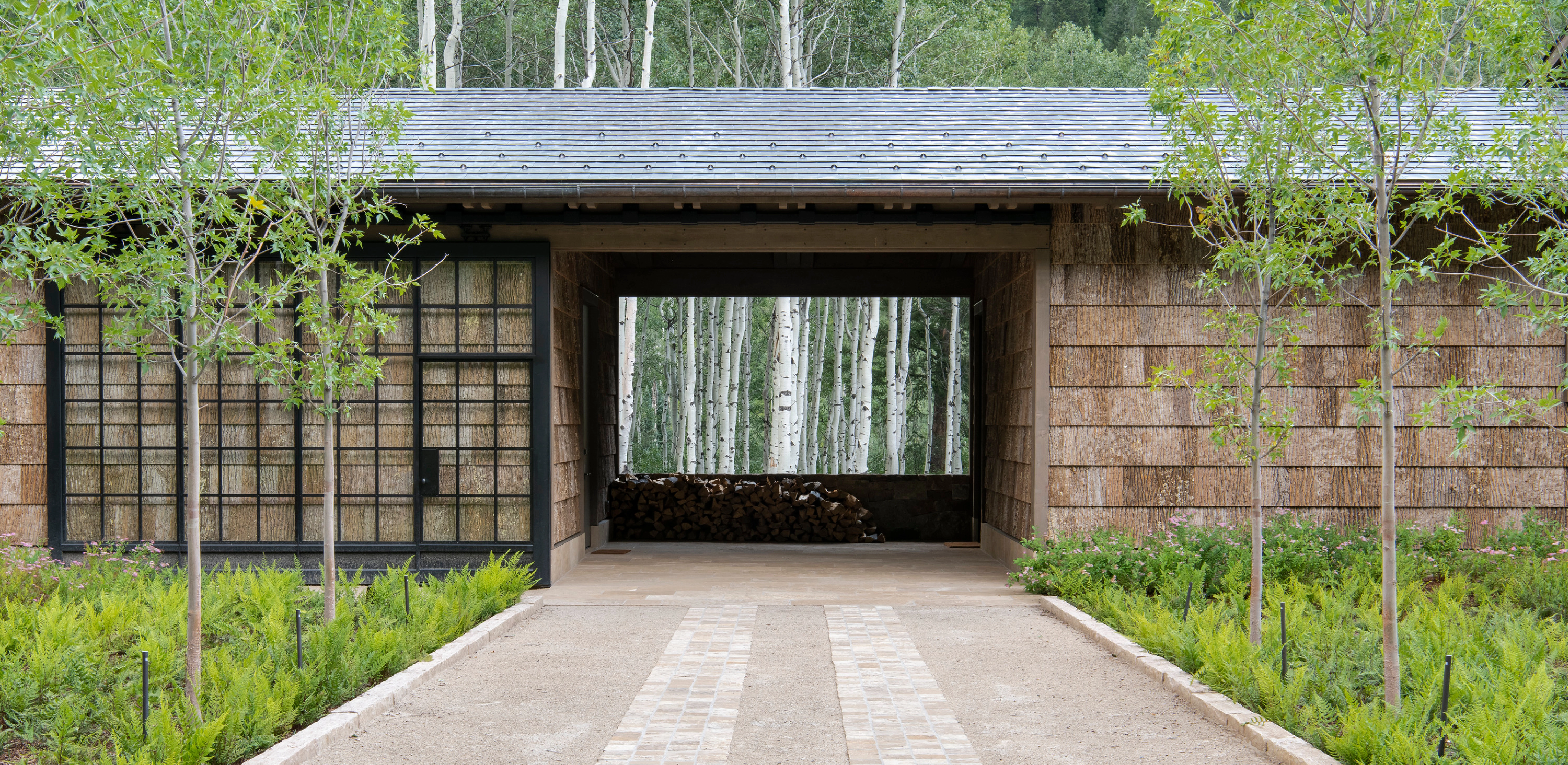The entry drive follows the natural contours of the site, its serpentine alignment gracefully negotiating over 70’ of vertical change, each turn in the road revealing layers of intricacy and beauty in the surrounding aspen forest. Striking an artful balance between year-round accessibility, slope retention, and minimal tree removal, the landscape architect’s grading plan was further refined with on-site staking to maximize tree preservation within several feet of the road edge, and avoid costly retaining walls. The rural character of the arrival experience is reinforced with an application of recycled asphalt, a by-product of an adjacent county road demolition project.