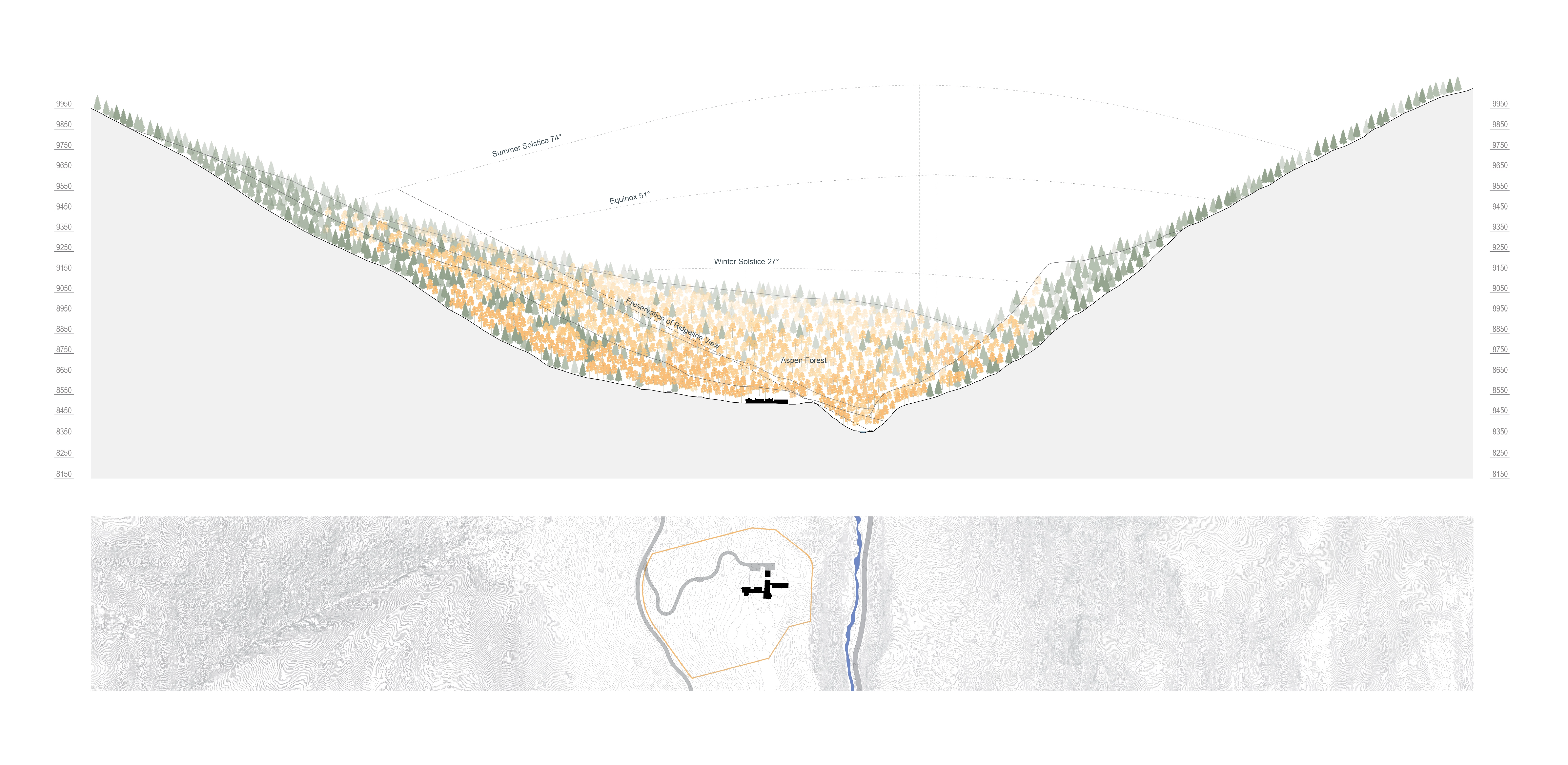 While rigorous land analysis provided a thorough understanding of macro-level site conditions, ground-truthing revealed important subtleties inherent in the existing landscape. Site reconnaissance efforts, purposefully conducted at different times of day and season, provided insights on the effects of light and shadow, snow and wind, and temperature extremes that would influence livability throughout the year. As a result of this analysis, the team collectively agreed to site the home at the northern edge of an existing meadow, a location that was especially appealing because of its relatively flat terrain and unobstructed view to 14,000’ Hayden Peak. At any other location, significant tree removal and extensive site grading would have been required. Additionally, in this location, the home is concealed from the adjacent stream and county road, preserving the integrity of the undeveloped ridgeline viewshed from a public corridor.