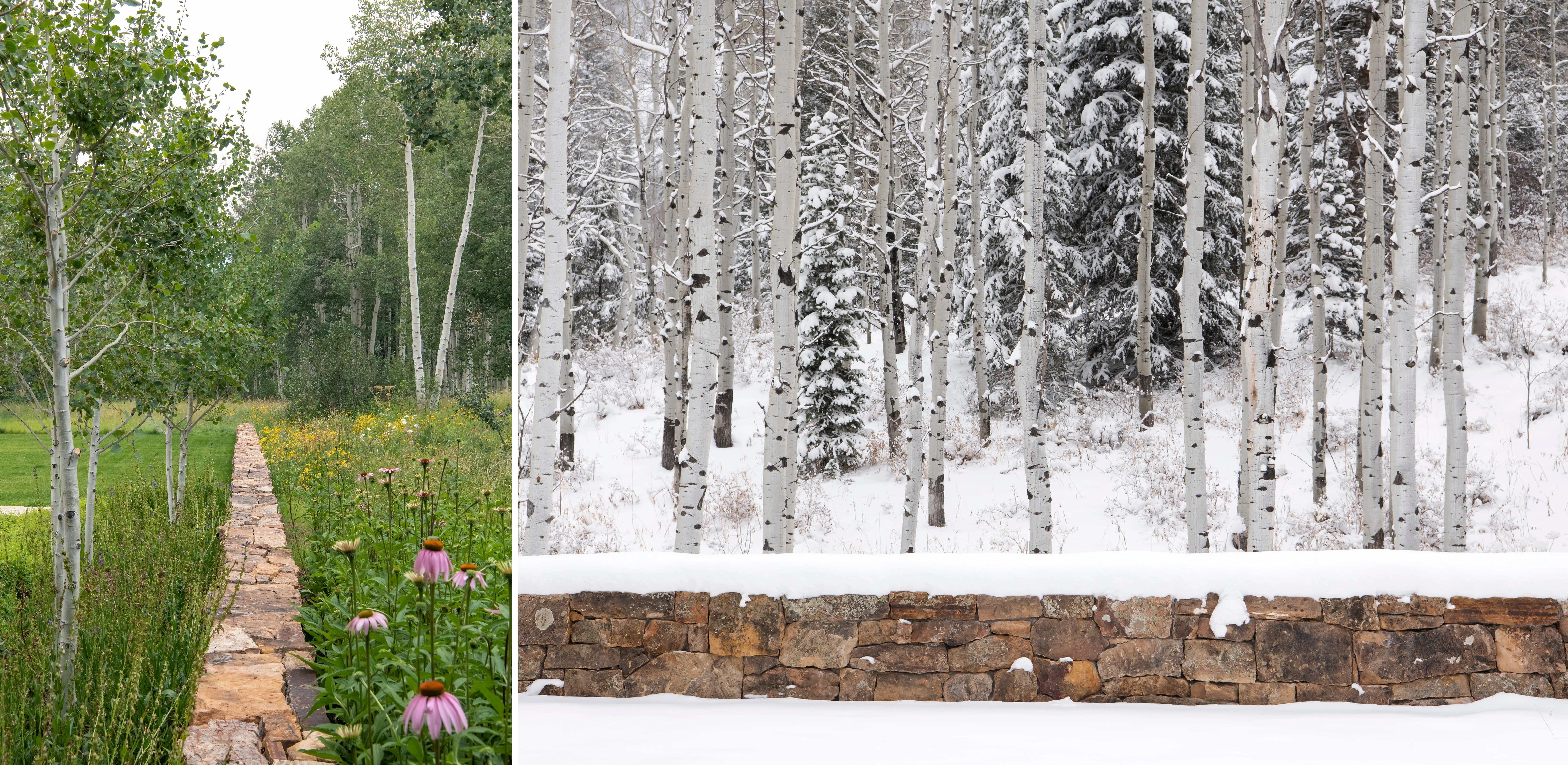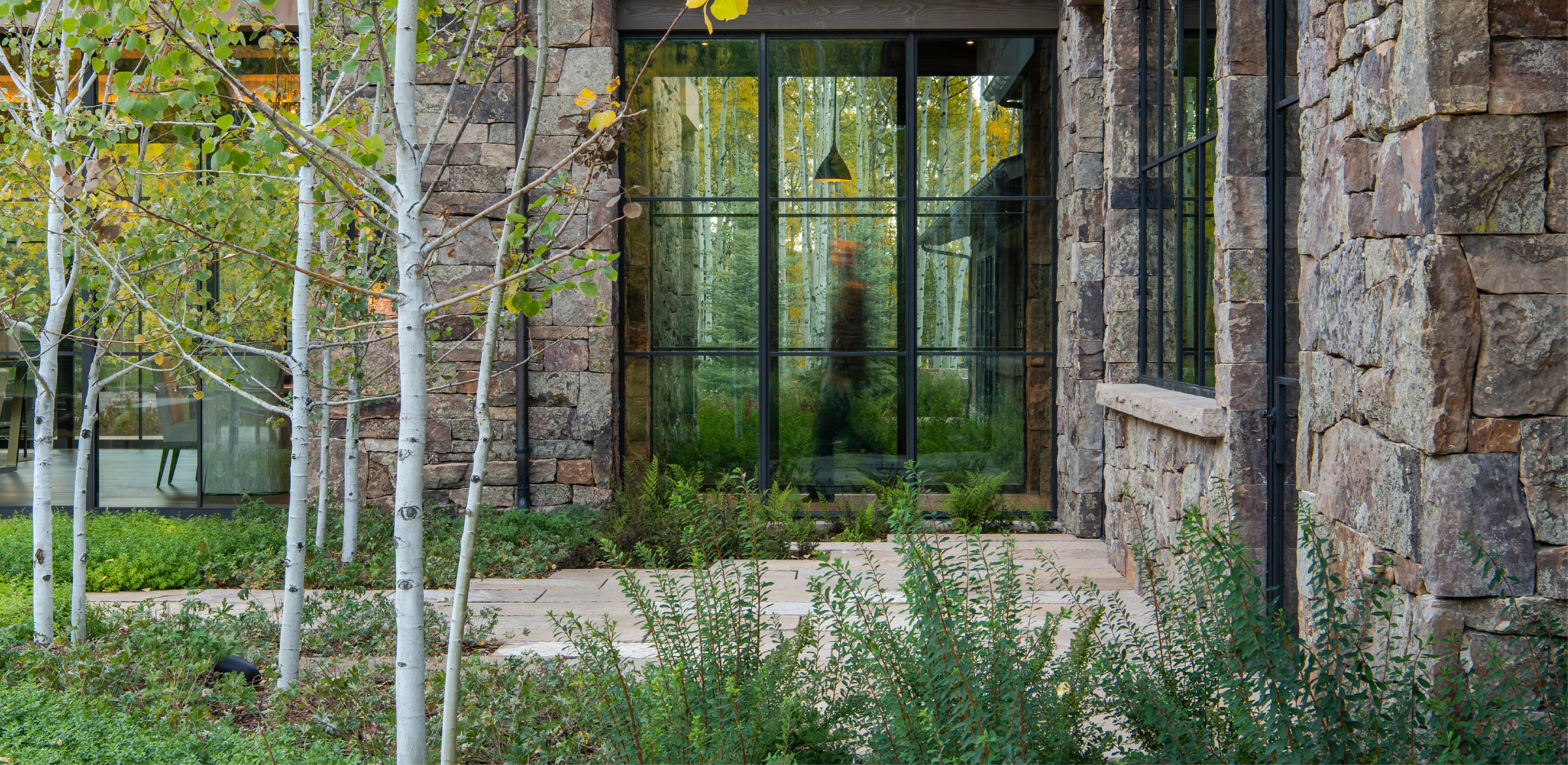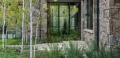 An arrival sequence, choreographed to introduce the woodland setting into the cultivated landscape, begins at the entrance court where a sensual and fluid relationship between architecture and landscape is immediately evident. A hand-carved stone fountain located at the convergence of two paths and framed by a grid of trees, forms a sculptural focal point within the garden. Beyond the low stone walls, a painterly vignette of columnar aspen trees unfolds, light and shadow enhanced by the flickering and trembling of leaves in the overhead canopy. A glimpse of restored wildflower meadows and distant forest through the front door ground the home in its setting, while a mass of flowering native shrubs flanking a set of gracious stone steps provide an entry sequence that is highly sophisticated, yet regionally appropriate and comfortably understated.