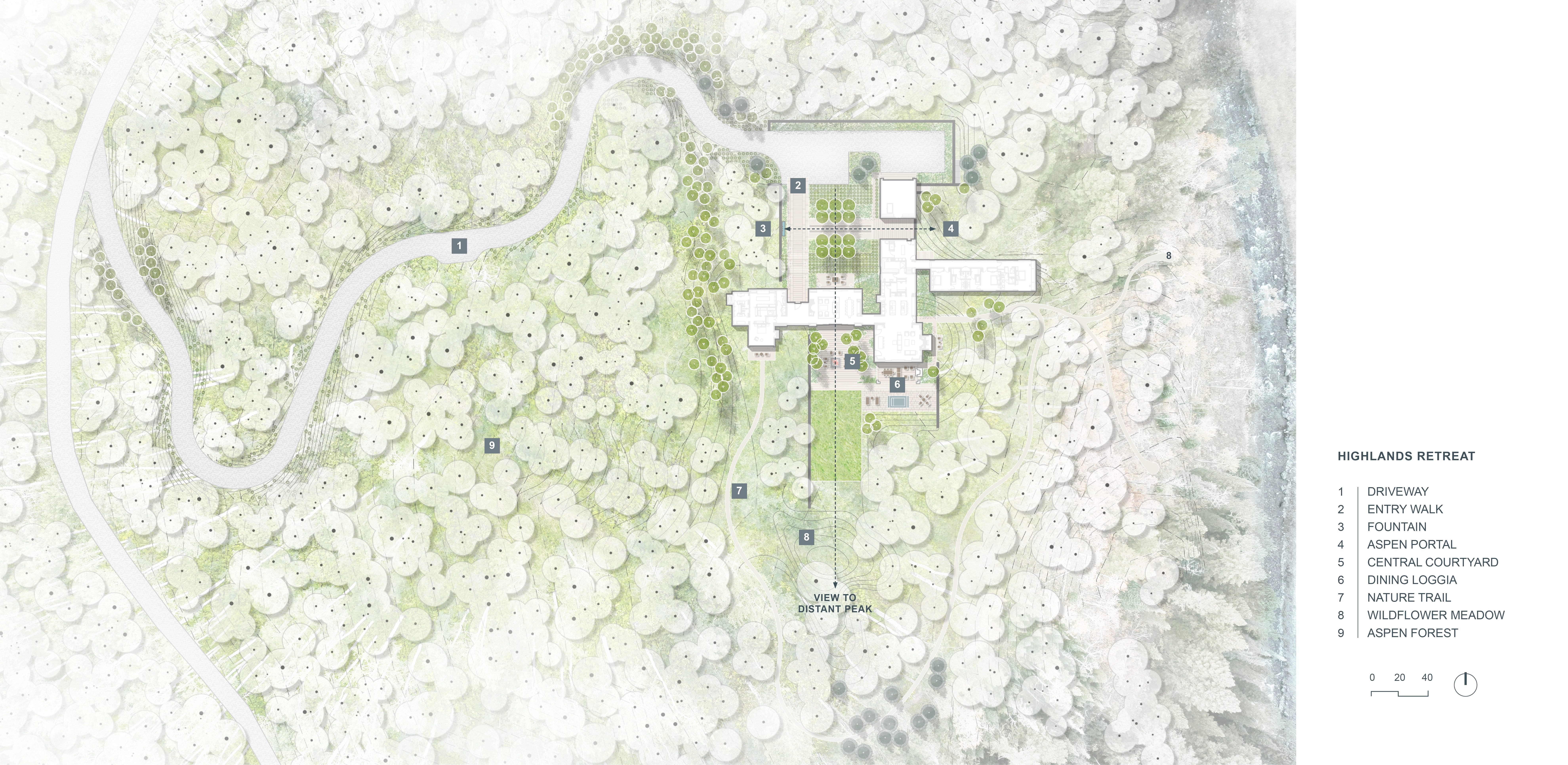 Nestled within an aspen forest, Highlands Retreat is the culmination of a fruitful collaboration between architect and landscape architect to stitch together the boundaries between natural and built environments. An open-air breezeway provides direct encounters with nature, while expansive glazing throughout the residence affords outward views through cultivated landscape into the surrounding woods, with gridded plantings at the building edges giving way to existing natural vegetation. Careful consideration of siting, approach, and understory management yield a mountain homestead deferential to its setting, yet this project seems to have a delineation of its immediate surrounds and then a release to nature where the feeling becomes one of total immersion.