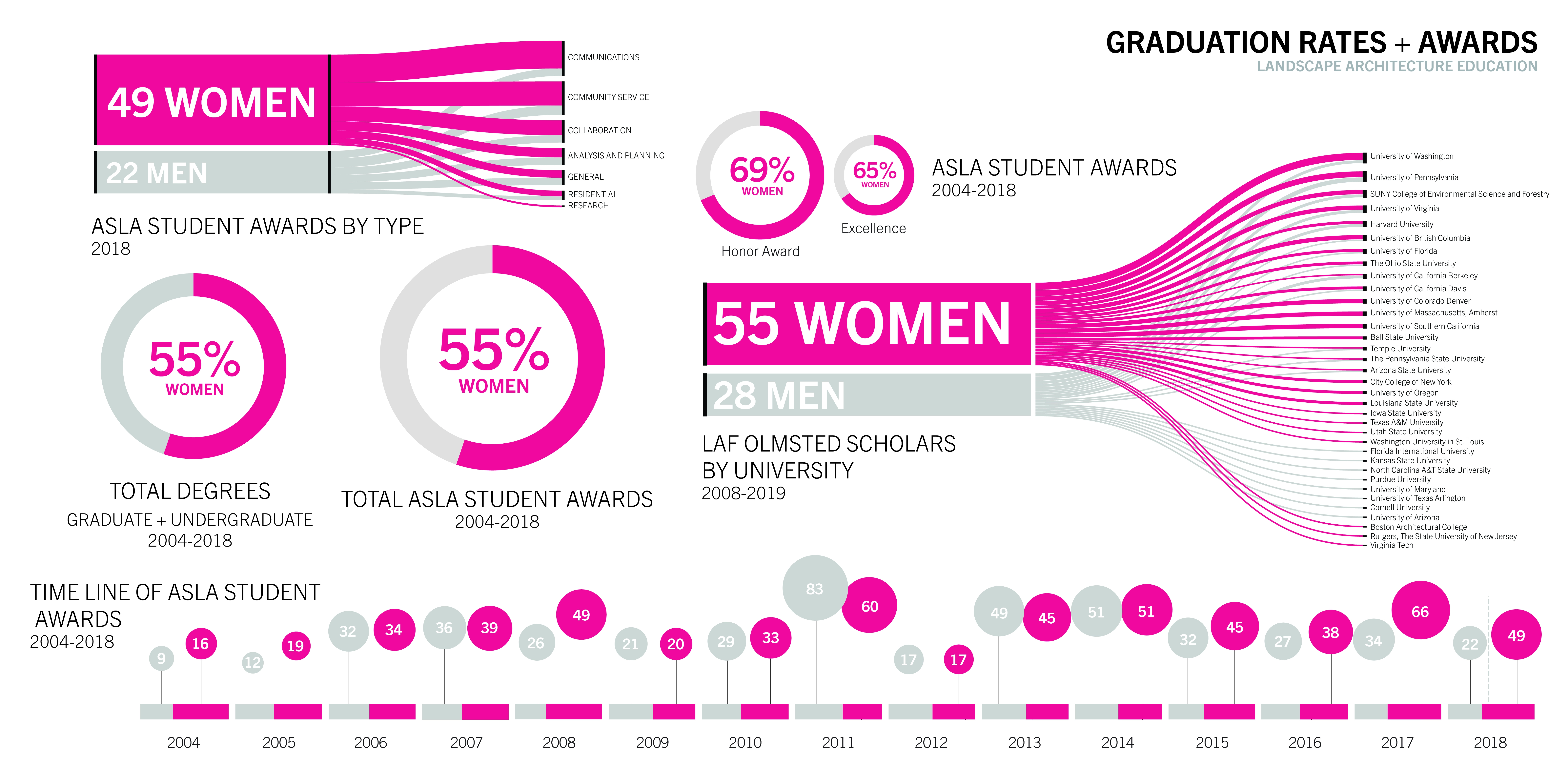 The overall data shows that women dominate in pre-professional narratives. More women enroll in and graduate (55%) with landscape architecture degrees, showing a nearly 10% gain from 2013 to 2017. In the ASLA student awards, women receive more recognition in the Communications, Collaboration, and Community Service categories while the General Design and Analysis and Planning categories have almost equal representation of both men and women. And 65% of the Landscape Architecture Foundation Olmsted Scholars are women. This momentum and representation drastically dissipate as women enter the workforce and navigate through their professional careers. After graduation, the amount of women actively pursuing licensure through CLARB drops almost 10%. And within CLARB's 2018 active, licensed landscape architects database, only 27% identify as women. As the pool of mid-level and senior-level women practitioners decrease, so do the residual effects in leadership and recognition.