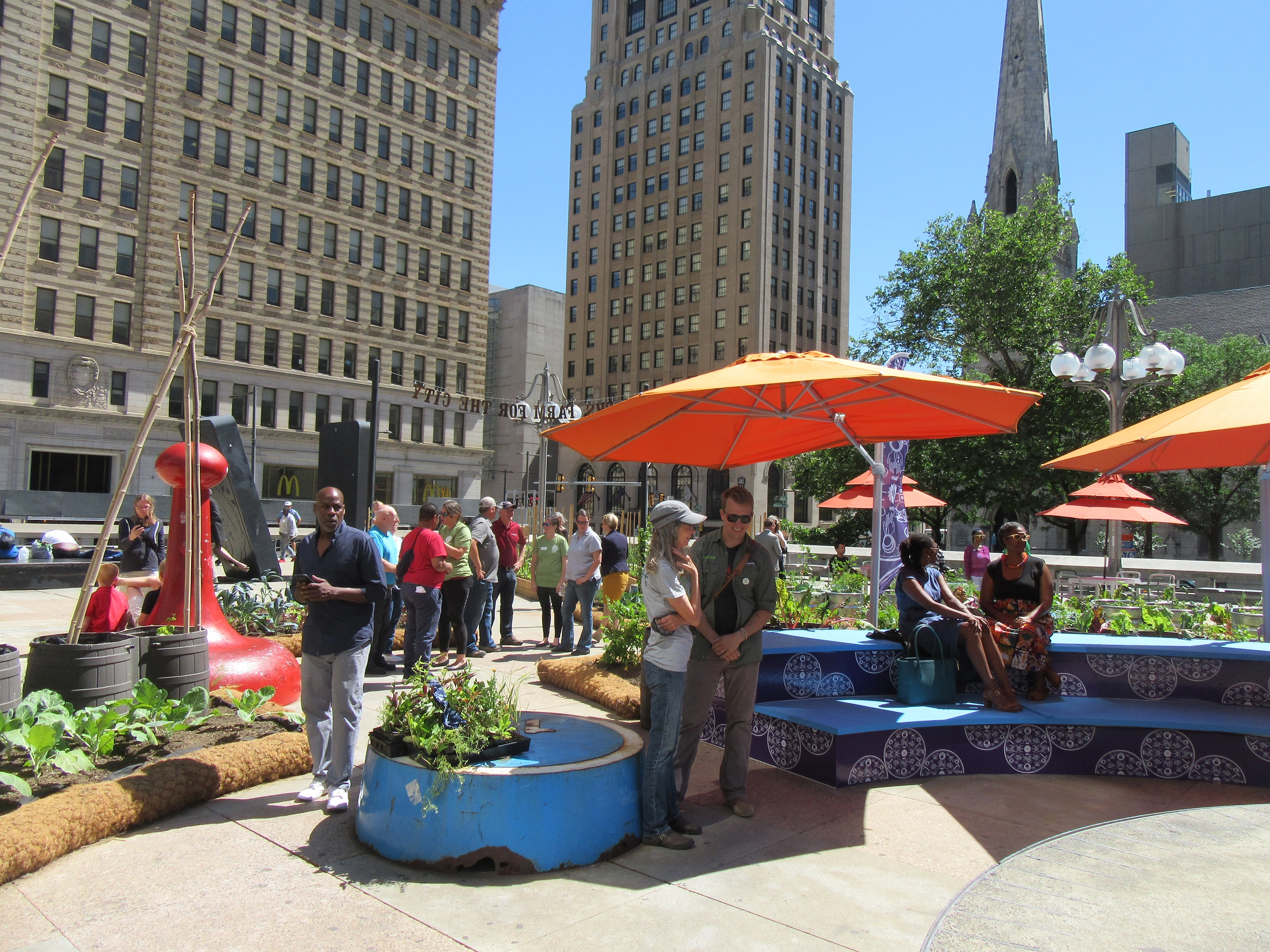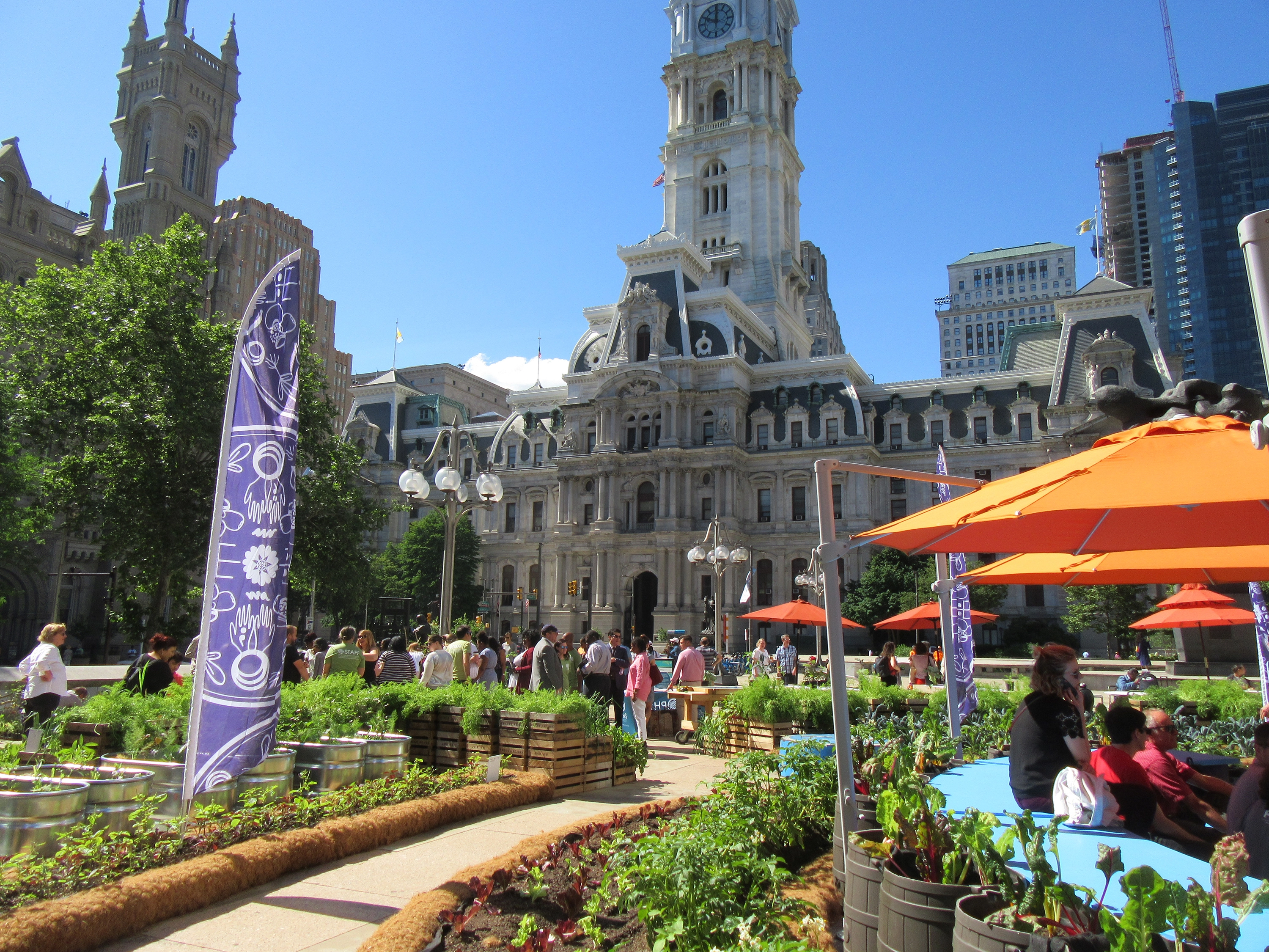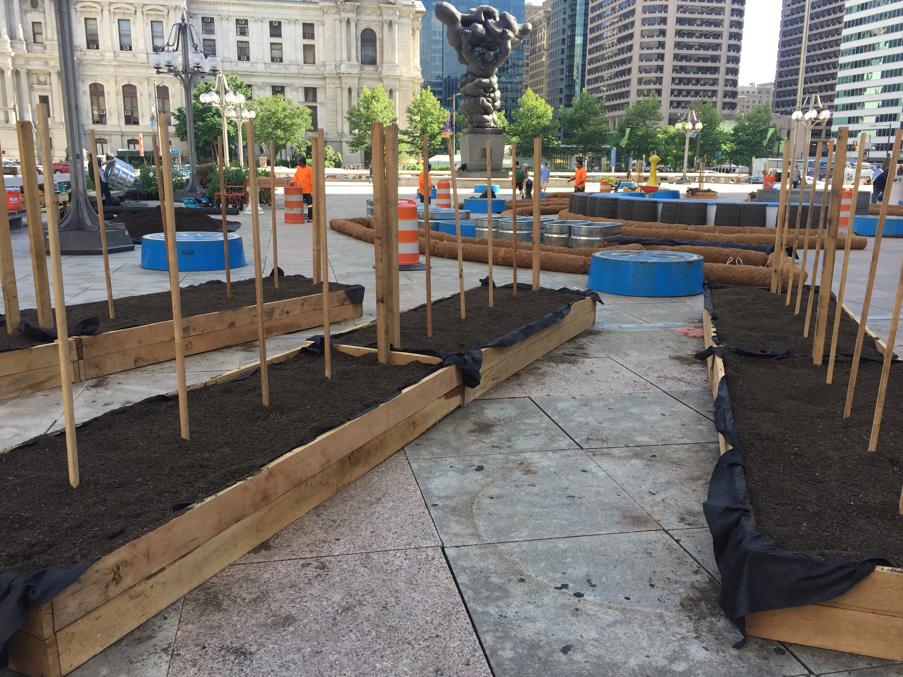 The farm produced over 1200 pounds of produce. The produce was delivered to a meal center, located just five blocks south, where it was prepared by professional chefs providing food for 8600 men and women who are homeless, at risk of being homeless, or of low-income. Two community dinners – featuring food grown on the farm – brought 150 people from different backgrounds together at the farm to dine and discuss food security and healthy community building. The designers and farmers were careful to respect the community of people who were already spending time on the plaza. “I think, too, as a lot of areas in Center City have been developed, a lot of housing-insecure folks have been pushed out, and pushed, and pushed, and all those spaces are disappearing. And as all that money is being poured into those projects, I don’t think there’s an equally large enough amount of money being poured into providing services for folks,” one of the farmers said.