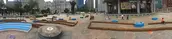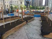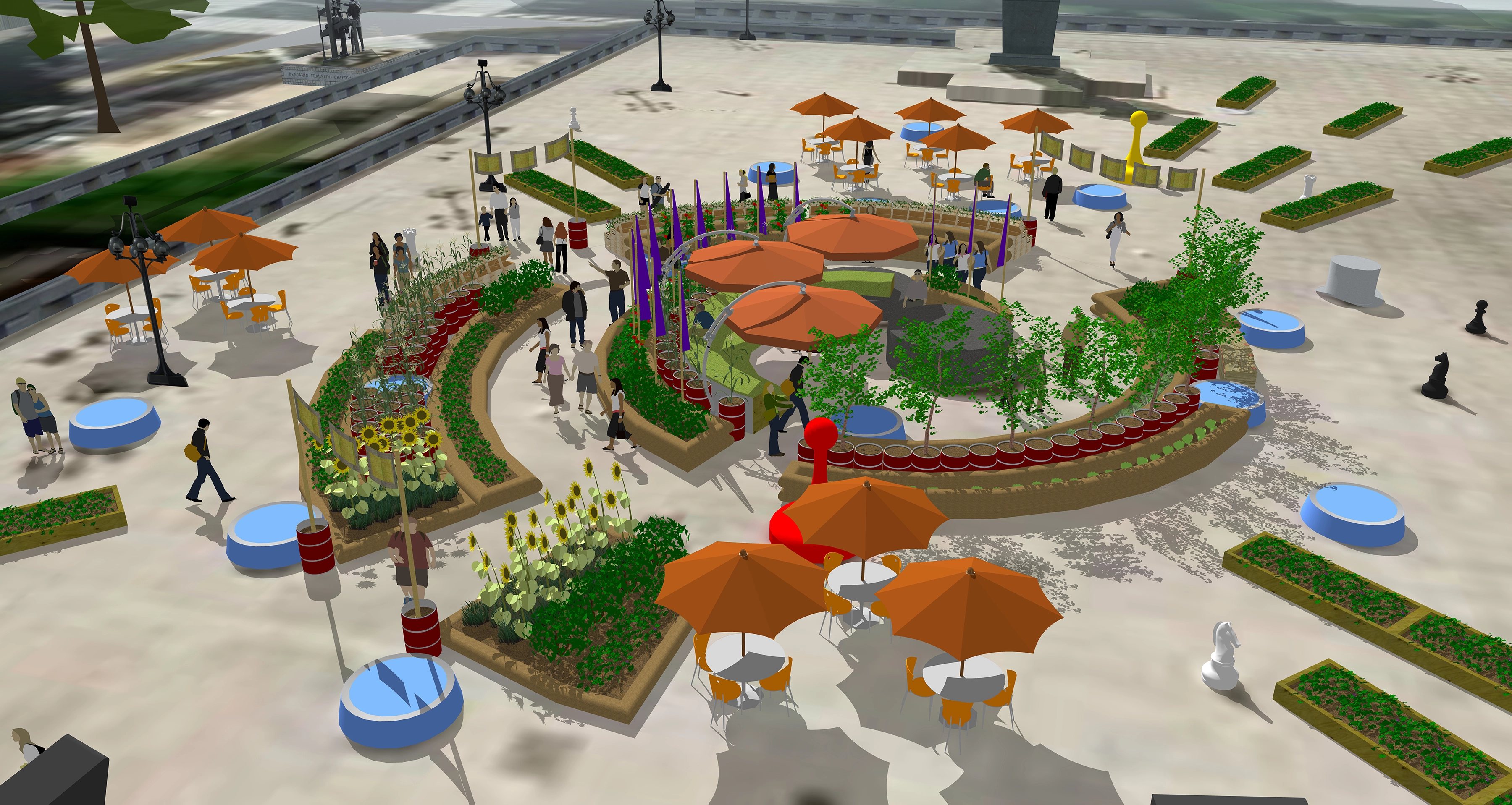 Project materials were an interpretation of those used in community gardens and selected for the ability to have a second life in new homes. Everything was built and inspected off-site and carried up to the plaza by hand. All of the pieces and parts of the garden were recycled and relocated into gardens across the city after garden disassembly. Garden beds were made from coir logs and wooden planters. Container Gardens were made in metal troughs, recycled plastic barrels and wooden produce boxes with stenciled client contact graphics. Flags were printed with community designed graphics to announce the farm to street-level passersby. The amphitheater used the same graphics and provided a vibrant centerpiece. Tables and chairs were carefully selected from the client’s warehoused stockpile. Umbrellas from the same stockpile provided vital shade. The soil was a split mix of compost, topsoil, and composted pine bark. The pine bark assisted with drainage and to prevent root rot. Designers minded strict weight and wind load requirements as the plaza floor is also the roof of city offices located below.