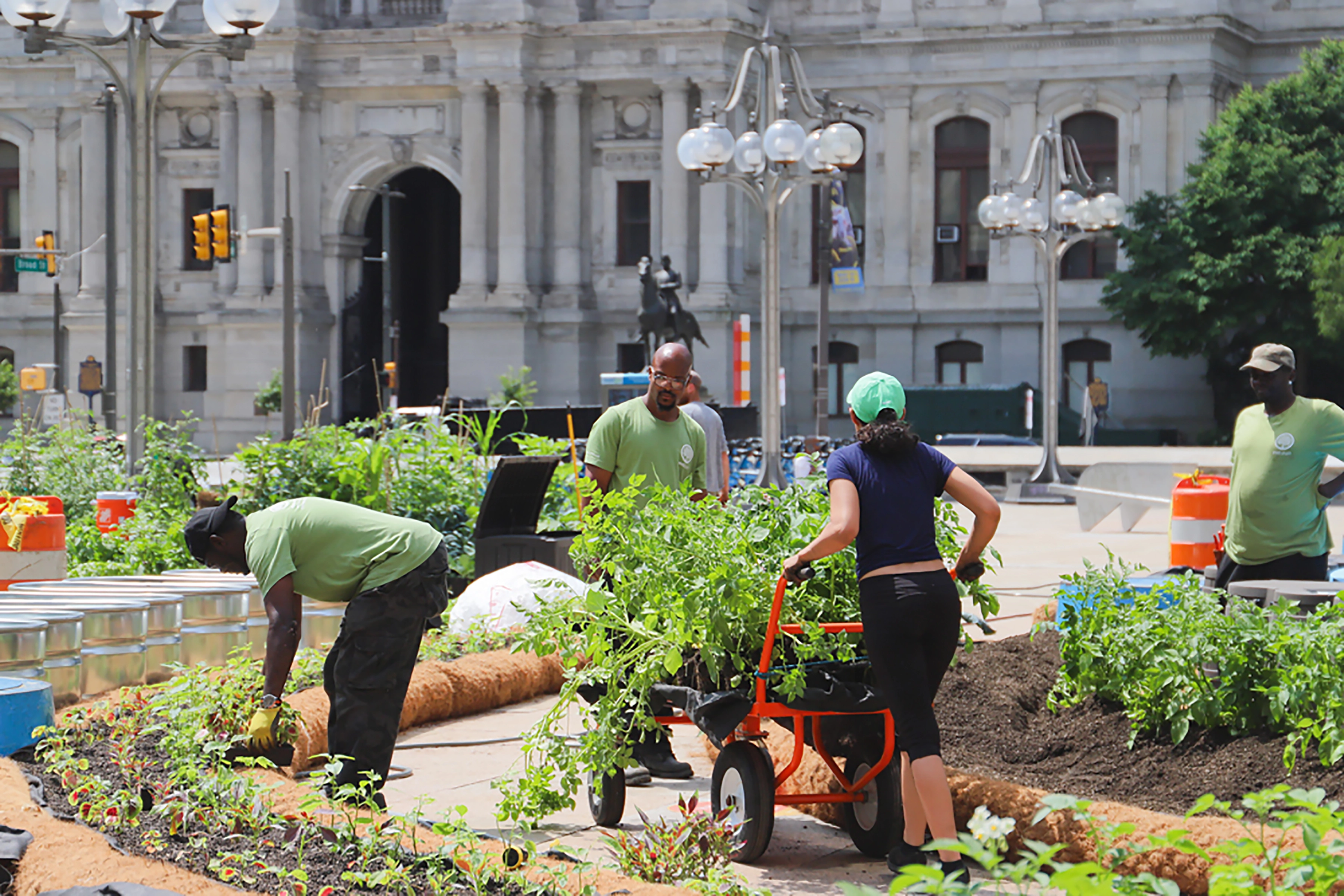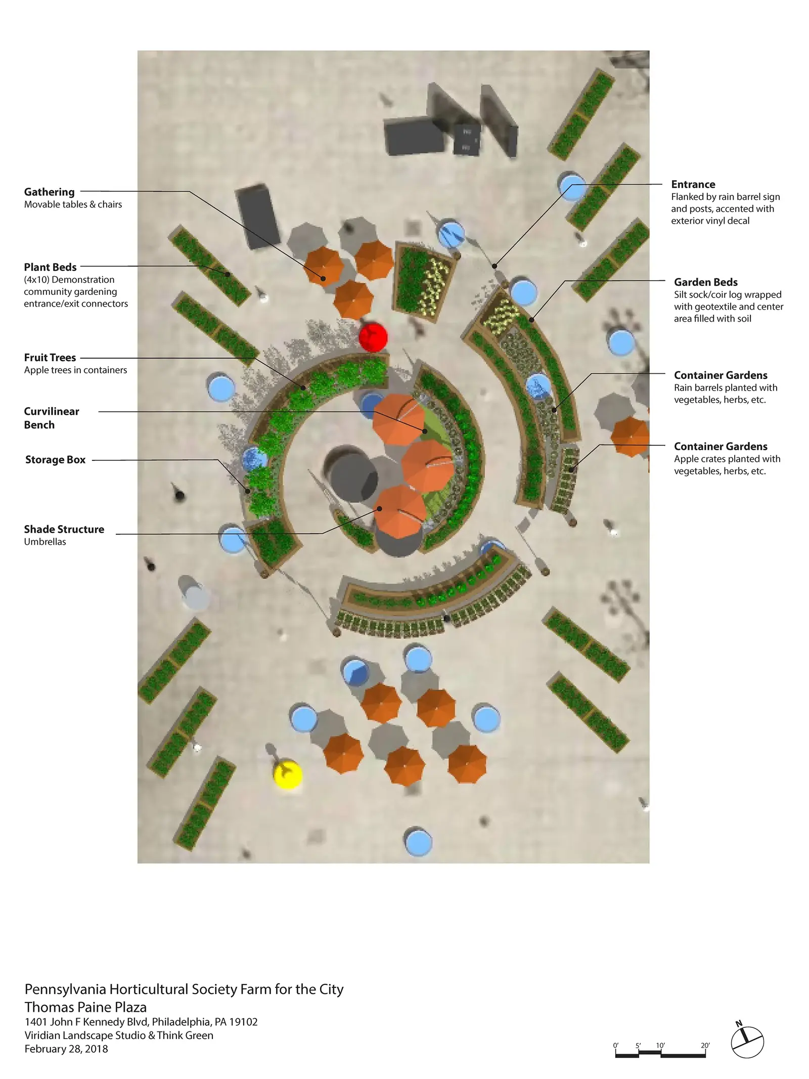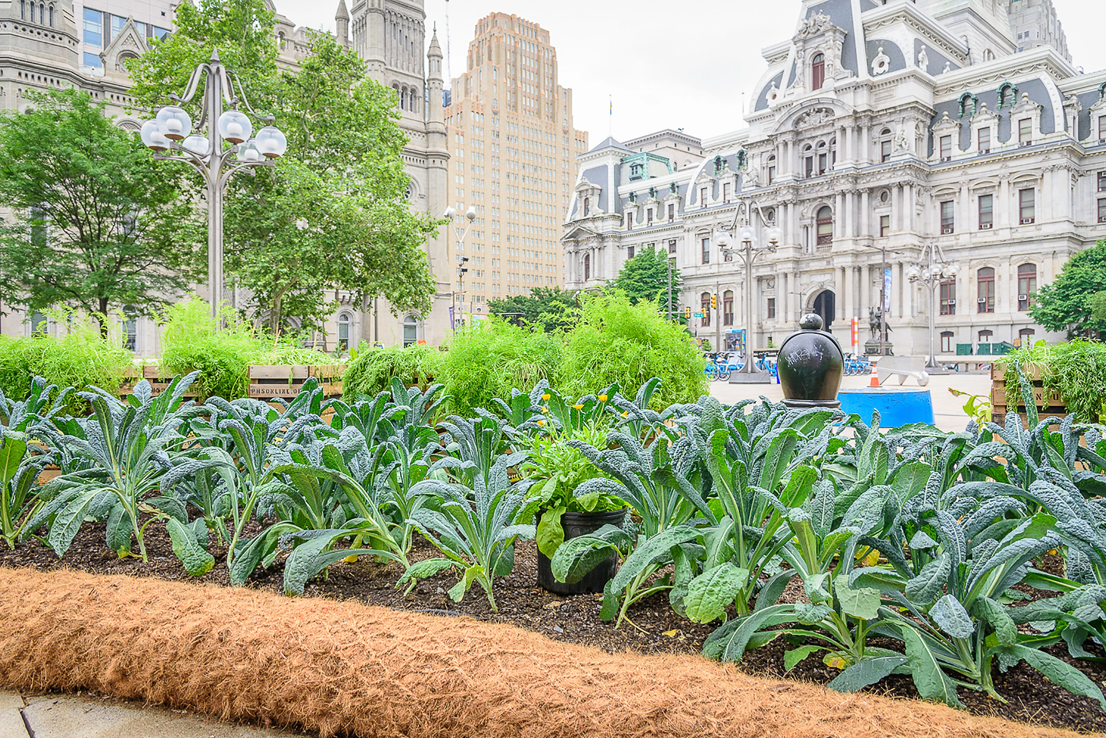 The client and design team transformed Thomas Paine Plaza, Philadelphia PA, into a beautiful, 2000 sf production farm. One in five Philadelphians is food insecure and the projected aimed to demonstrate how city residents can harness the power of horticulture to enrich and strengthen their communities and help make healthy food more accessible to those in need. The project bolstered both the clients’ and designers’ work to transform under-utilized spaces into community assets. The Farm was an example of how a vacant lot or empty urban space can be repurposed, even temporarily, into a verdant garden or green space that can benefit the neighborhood and the city at large.