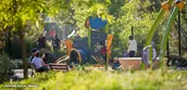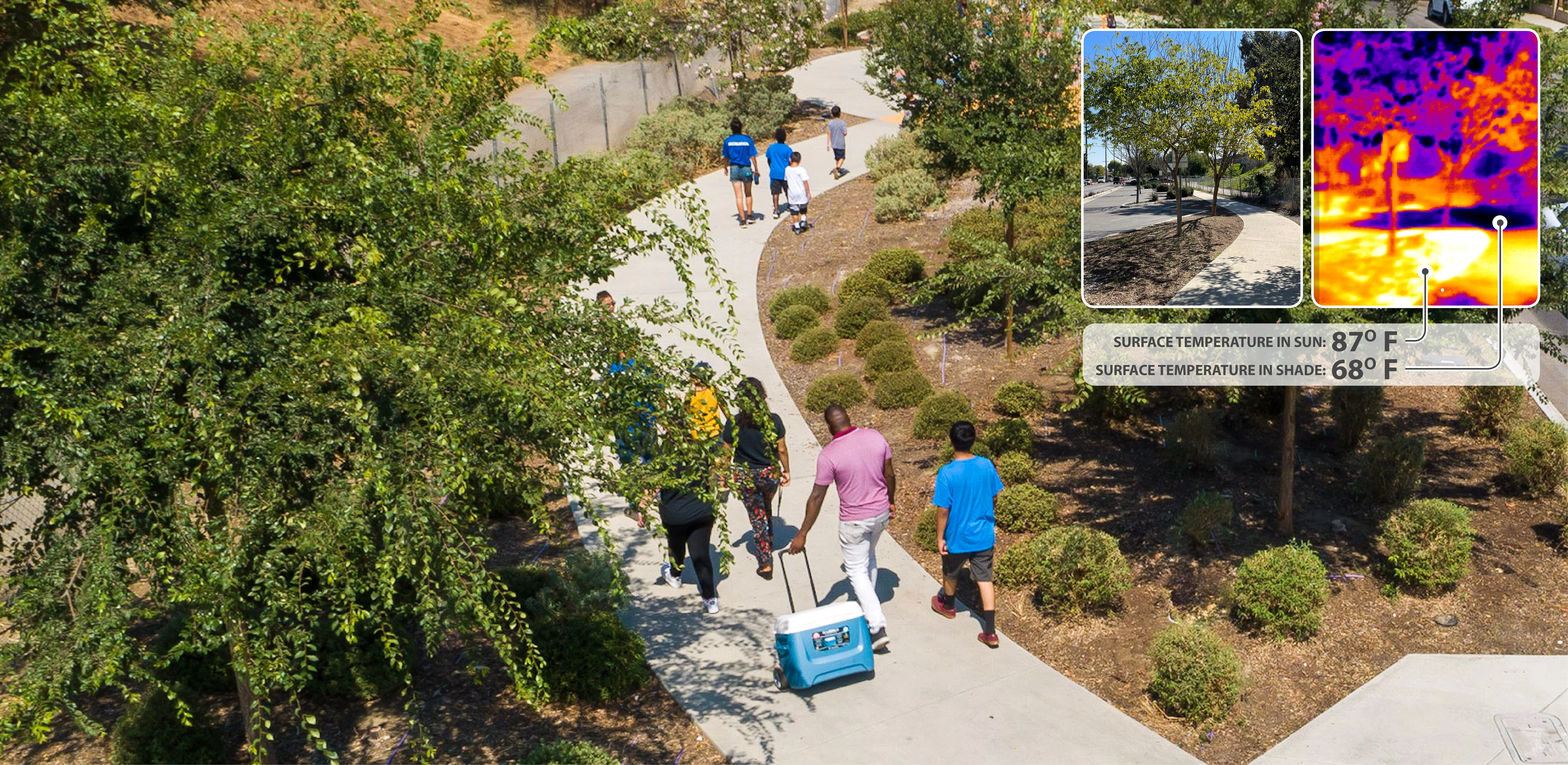 While the park is within 100 feet of the freeway, both noise and air particulates are mitigated by a 10-foot-tall sound wall along its entire length. Softscape interventions, similarly, help mitigate heat island effects. By planting more than 300 new trees across the park, the design expands canopy coverage to 48 percent – a significant upgrade in a surrounding city where the average coverage is only 15 percent. The new trees were strategically placed throughout the park to shade features like benches and berms. In addition, a diverse climate-adapted plant community buffers heat from the adjacent streets, making the park an even more inviting destination during summer months.