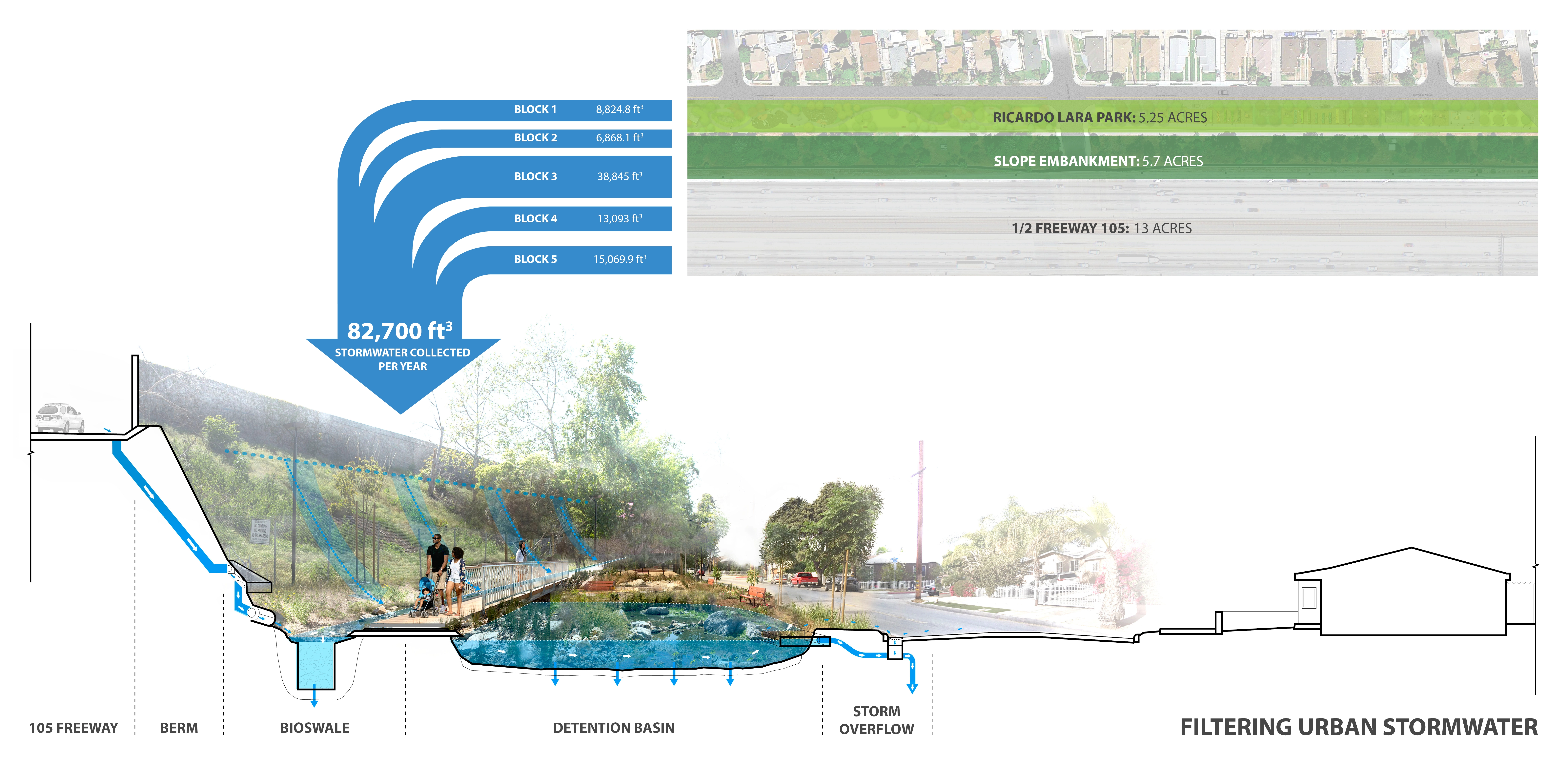 In one of the park’s crowning achievements, a series of strategically placed basins and bioswales now treat the equivalent of six swimming pools’ worth of runoff from the adjacent Caltrans embankment. This intervention doubles as a flood prevention strategy, addressing a problem that the neighborhood used to experience frequently. Over 200,000 square feet of pervious surface, bioswales, and detention ponds were added in total. Due to the topography of the surrounding site, the park encompasses a catchment area of 24 acres and collects 82,700 cubic feet of stormwater per year. The added bioswale in the park also filters polluted freeway runoff before it reaches the water table.