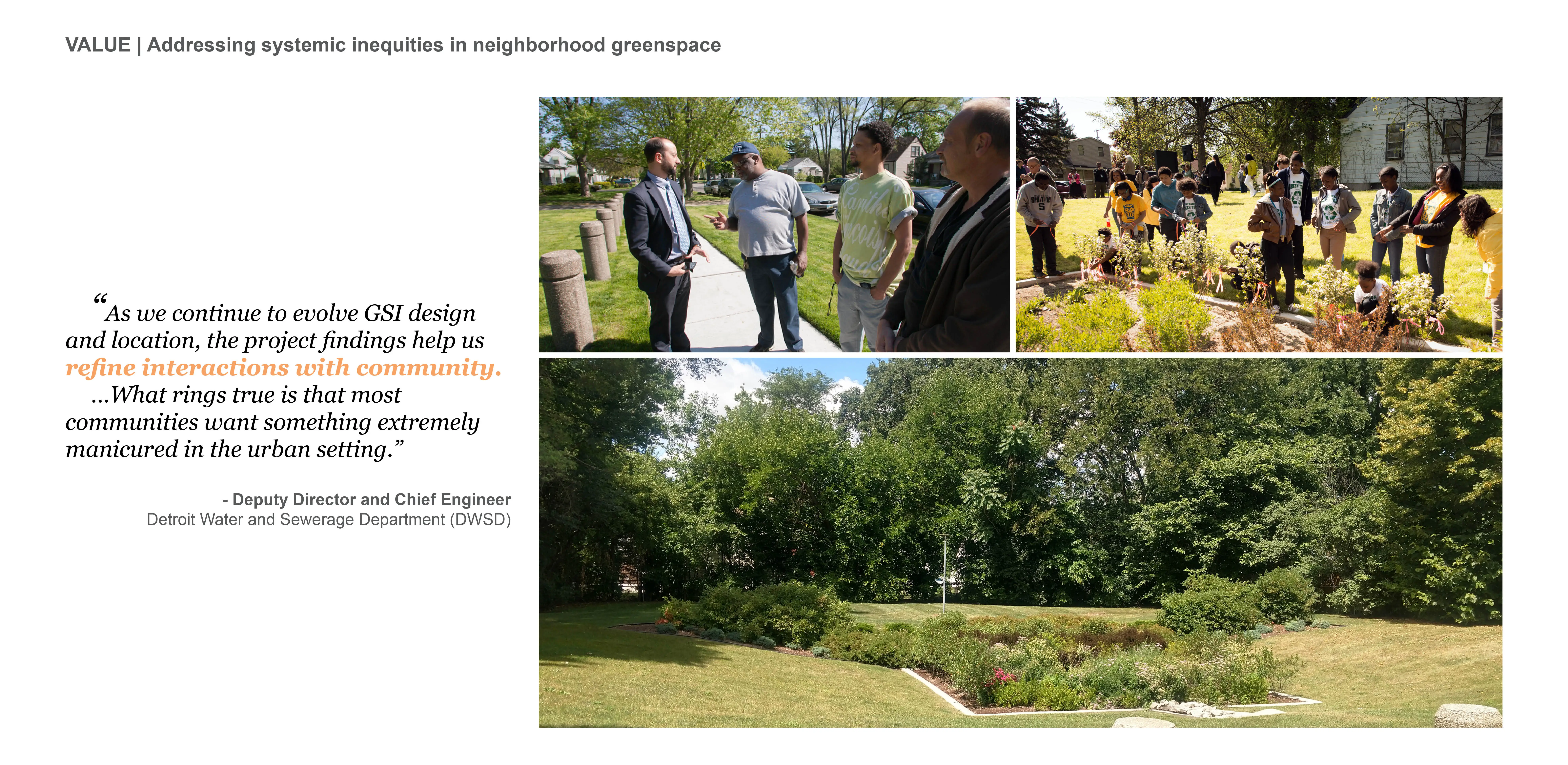 The project immediately benefited Detroit residents by leveraging DWSD stormwater investments to design and construct greenspace pilot sites on vacant lots in disadvantaged neighborhoods. Further, it identified design elements that residents expected to measurably improve their well-being, and showed how different design elements with different maintenance efficiencies affect how much residents may benefit. Importantly, small-scale elements can make a big difference to well-being, helping to resolve inequities in the quality neighborhood greenspace that may contribute to health disparities.