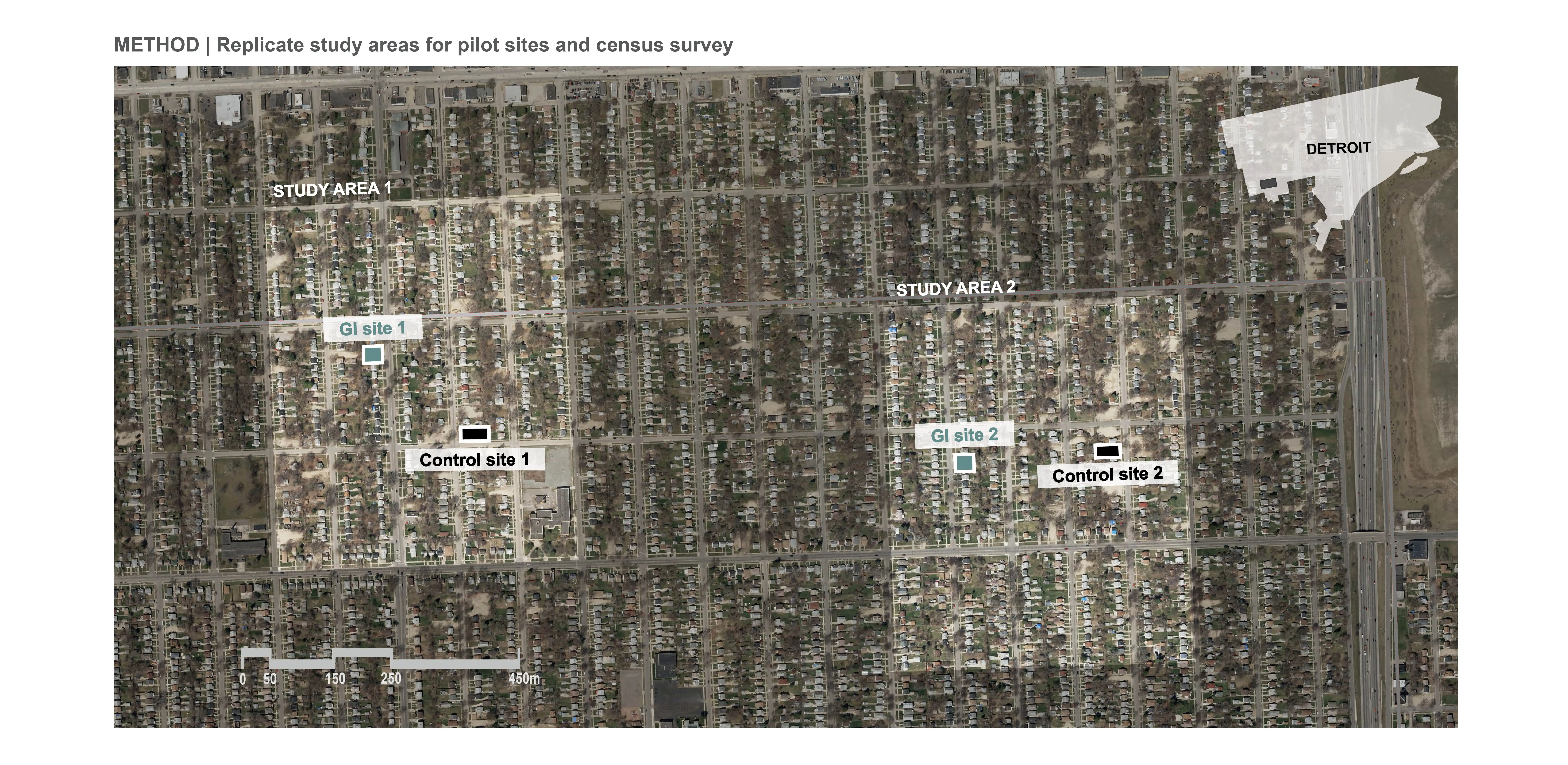 Study area and site selection. In an area that the Detroit Water and Sewerage Department (DWSD) had prioritized for GSI implementation, we selected replicate study areas separated by more than 2415 m to reduce spillover effects across study areas. Each study area had a mix of occupied homes and vacant properties; overall vacancy was 39%. Each had majority black populations and a majority of households with incomes below $25,000/year (poverty level as per the US Department of Health and Human Services).