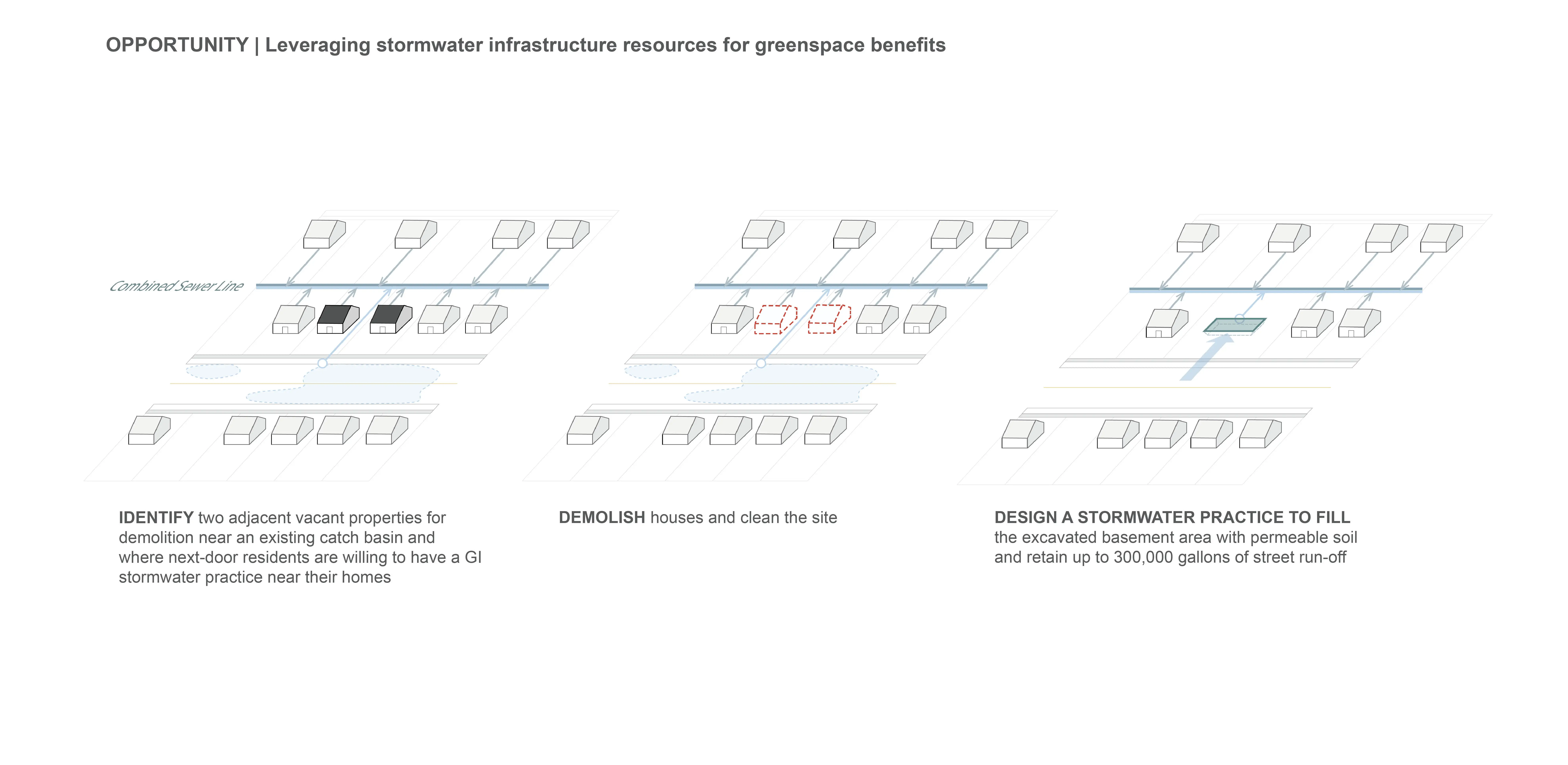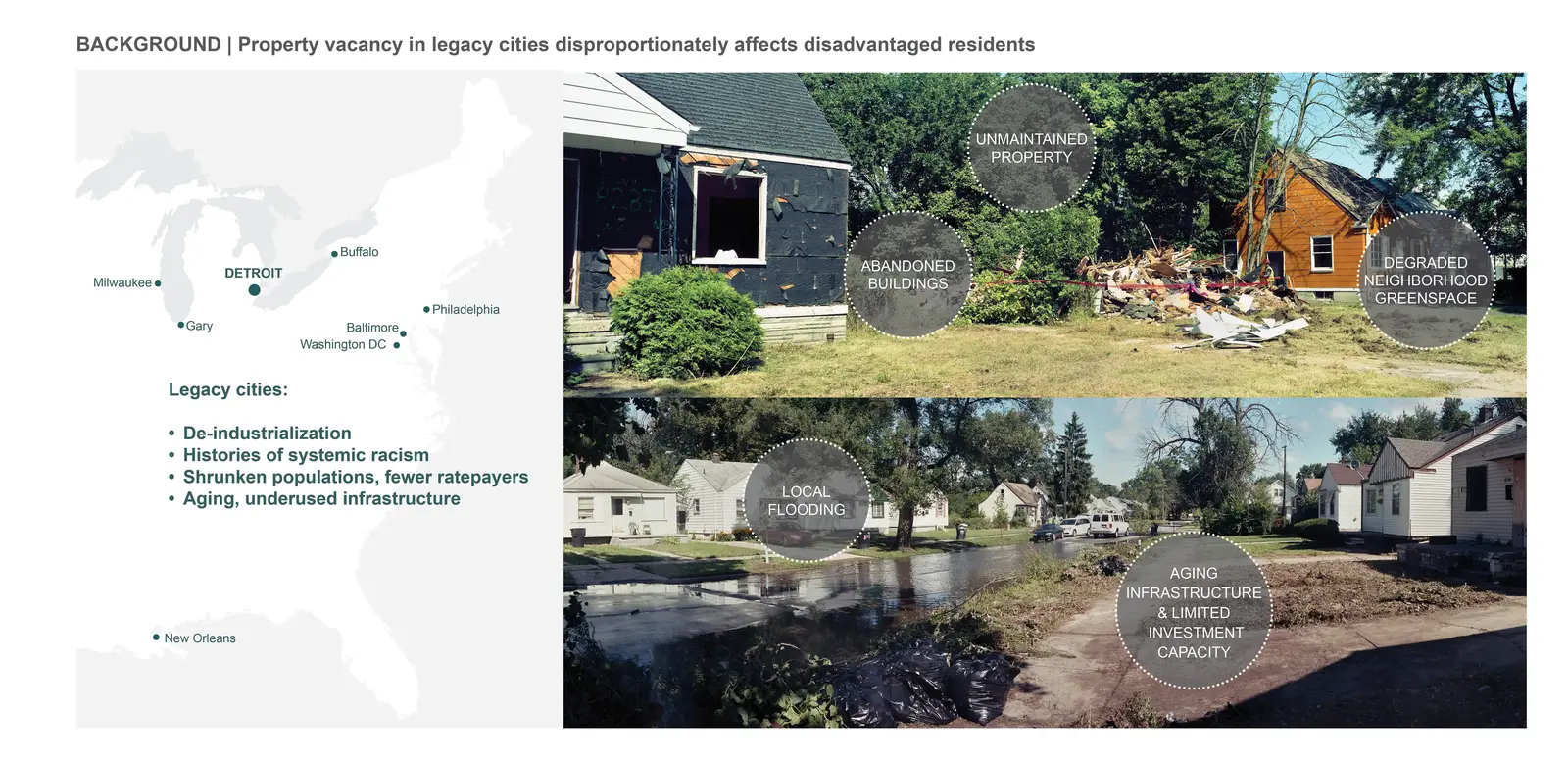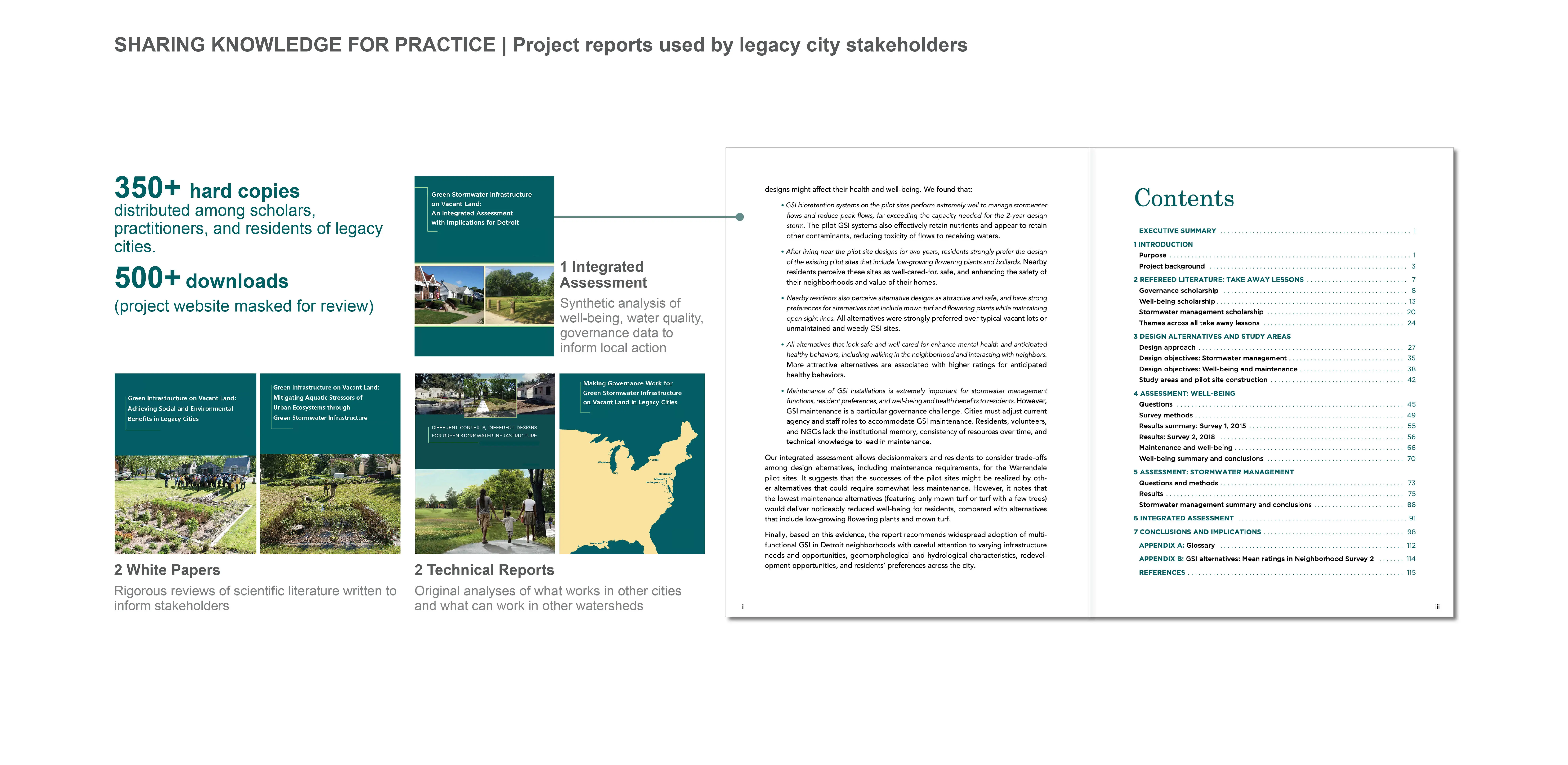Transforming vacant properties in Detroit into stormwater infrastructure through a utility-backed pilot program, this seven-year study aimed to create desirable green spaces in historically disadvantaged neighborhoods. Although limited in scope to two intervention sites (with two accompanying control sites), this undertaking provided crucial feedback in terms of how landscape design and maintenance strategies increased residents’ senses of safety and well-being. The study showed that even minor municipal efforts toward these green spaces brought about major increases in neighborhood pride, illustrating the value of bringing complex information and analysis to communities, while also amplifying the community’s true desires.